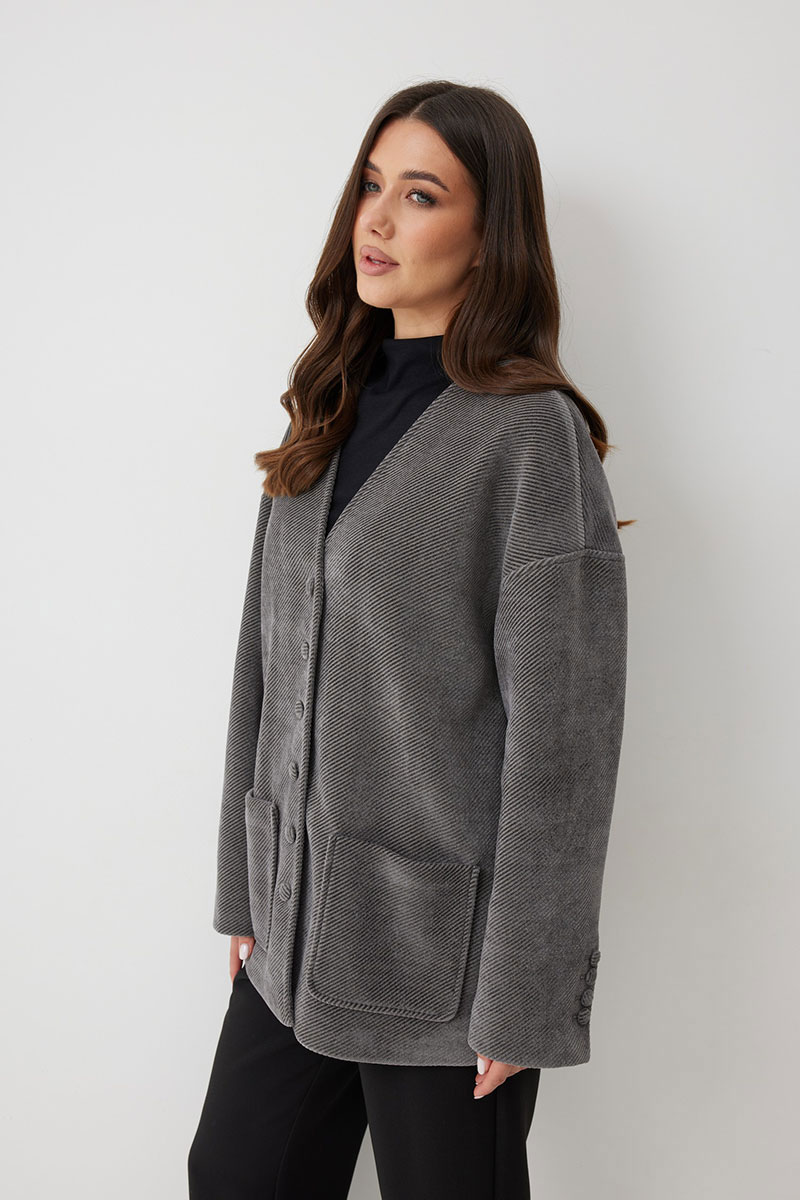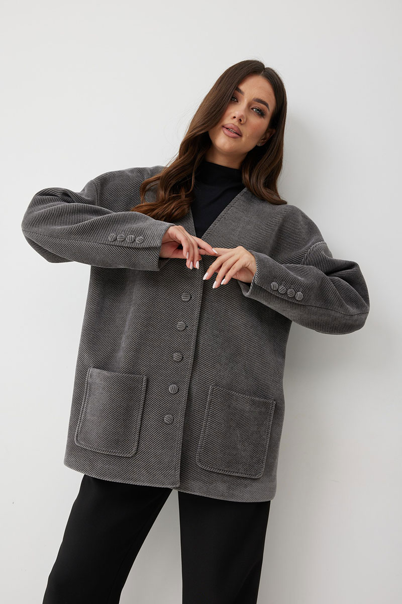 Вырез горловины V-образный, без воротника. Застежка центральная на петли и пуговицы. По полочке на уровне бедер накладные карманы. Линия плеча спущена. Рукава длинные втачные двух
