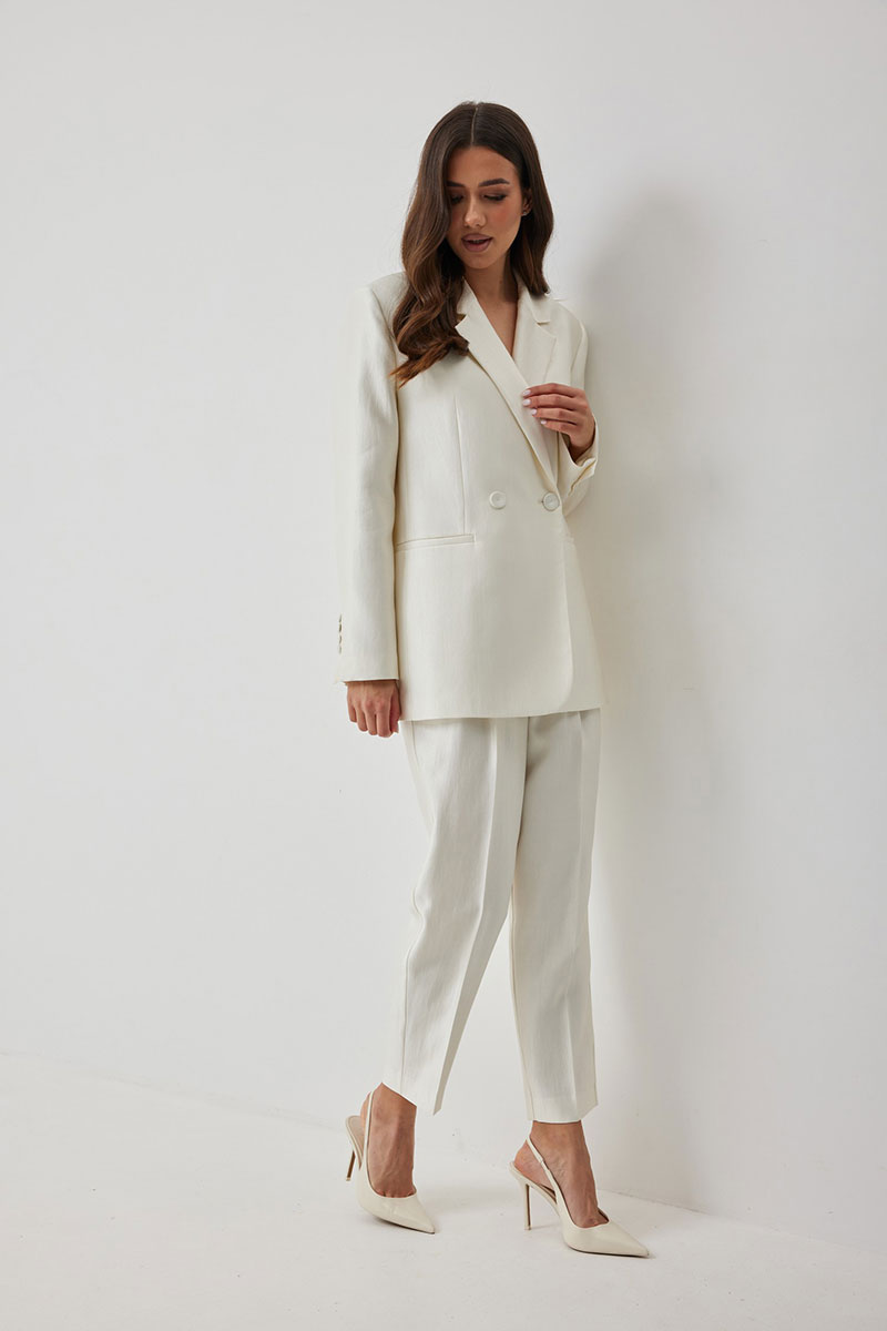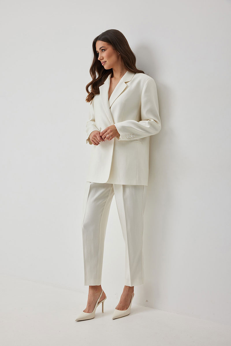Стильный женский жакет прямого силуэта, выполнен из ткани «люмина» с блеском, что придает изделию нарядный вид. Жакет полностью на поливискозной подкладке. Классический V-образный вырез горловины с пиджачным воротником и лацканами. Застежка двубортная на петли и пуговицы. На уровне бёдер расположены прорезные карманы с листочками. Рукава втачные длинные, с шлицей по низу. Спинка со средним швом и шлицей снизу. Этот жакет станет эффектным акцентом в вашем вечернем гардеробе. Для создания идеального образа комбинируйте с брюками М381.