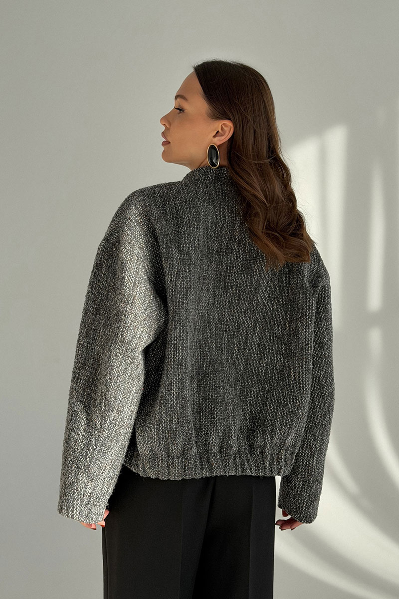 Стильный жакет ‑ бомбер из твида с металлической нитью, которая придаёт изделию блеск. Жакет укороченный, свободного силуэта. Вырез горловины округлый, с воротником стойкой. Застежка