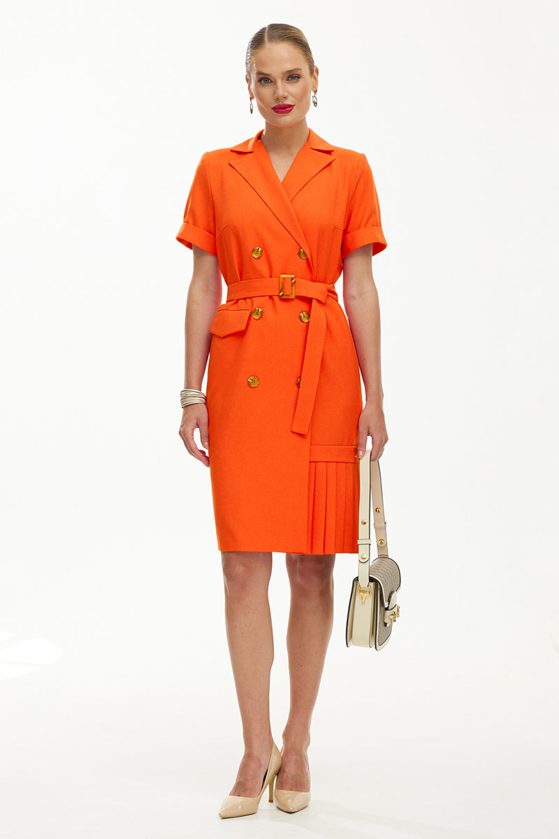 Платье женское полуприлегающего силуэта с двухбортной застежкой на петли-пуговицы. Горловина оформлена воротником пиджачного типа. Рукава короткие, по низу обработаны притачной