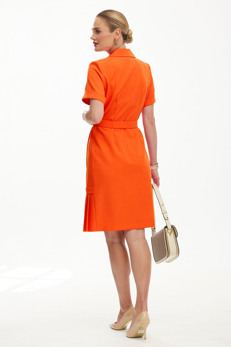 которой горизонтально расположена пата. В комплект к платью входит пояс из основной ткани с декоративной пряжкой, в цвет фурнитуры.