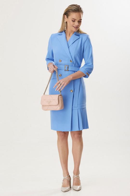 половинках расположены талиевые вытачки, в боковых швах – наклонные карманы. Перед обработан поясом фигурной формы и декоративным клапаном, на котором пришита пуговица. В комплект