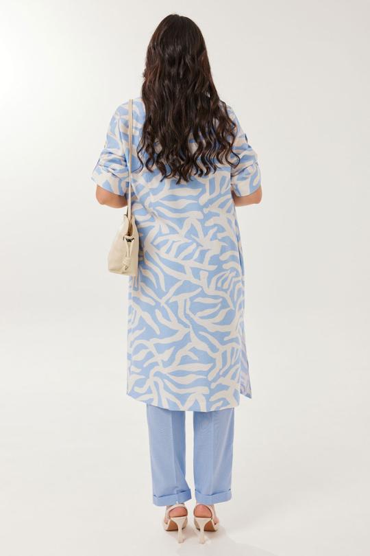 Блуза прямого силуэта, длиной мидакси, с центральной застёжкой на петли и пуговицы. По переду расположены нагрудные выточки. Горловина обработана воротником рубашечного типа. Рукава
