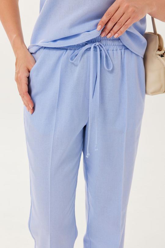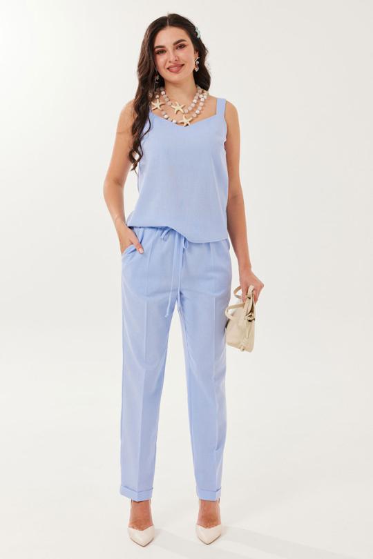 Брюки и топ выполнены из поливискозы с добавлением льна. Блуза - из поливискозы. Брюки классической формы, слегка заужены к низу со стрелками по передним и задним половинкам. Но низу брюк манжета. Верхний срез обработан притачным поясом на резинке. По центру переда - застёжка-обманка, по поясу брюк обработаны петли, из которых выходит шнур для регулировки талии. В боковых швах расположены наклонные карманы.