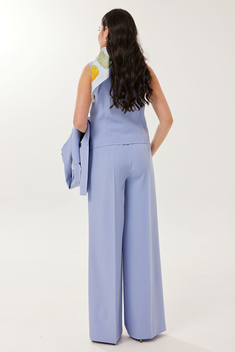 Брюки формы "палаццо", со стрелками по передним и задним половинкам. Верхний срез обработан притачным поясом., с резинкой в области спинки. По центру переда - застёжка на крючок и тесьму-молнию. На задних половинках расположены талиевые вытачки. В боковых швах расположены наклонные карманы.