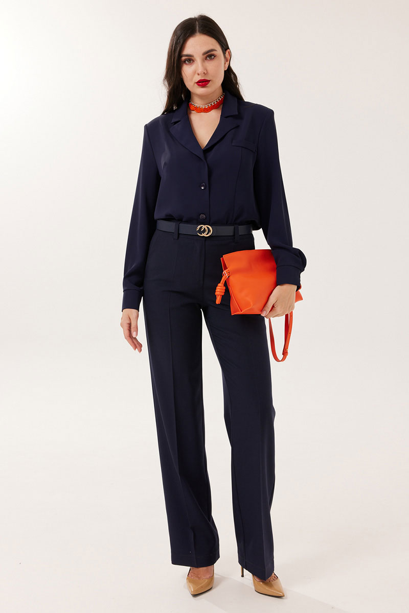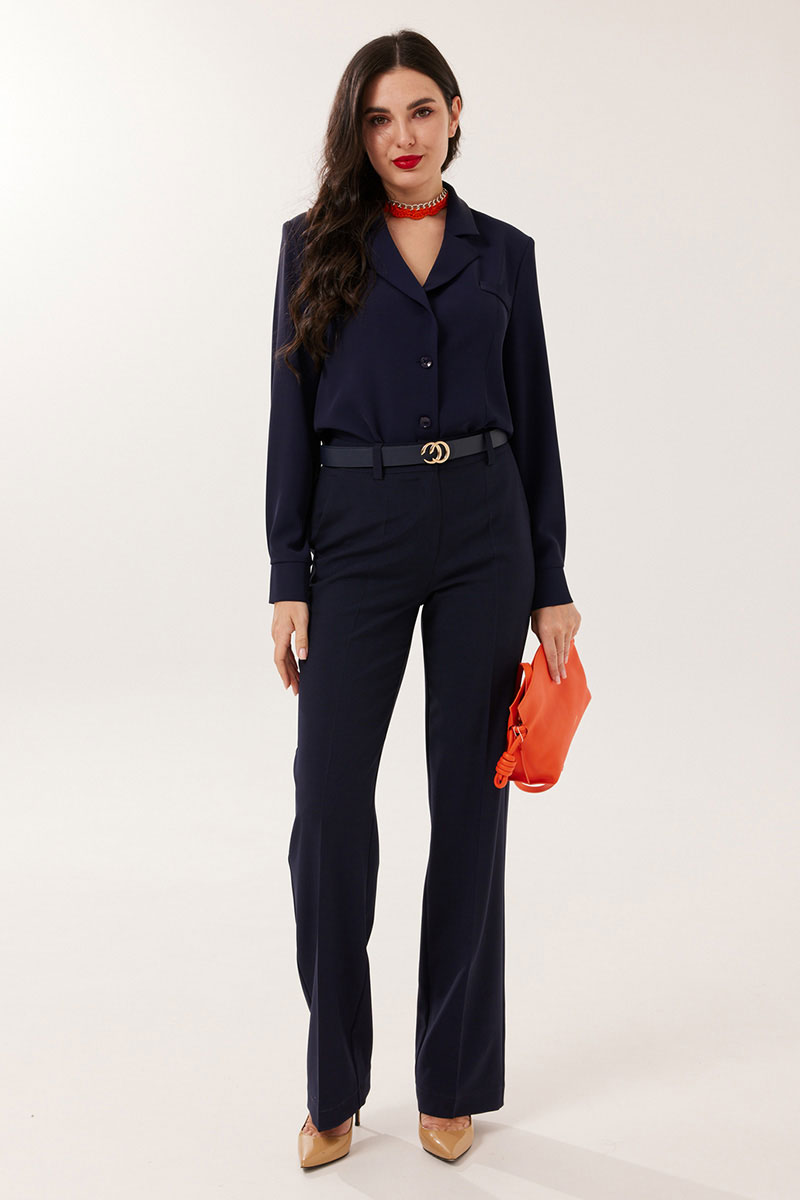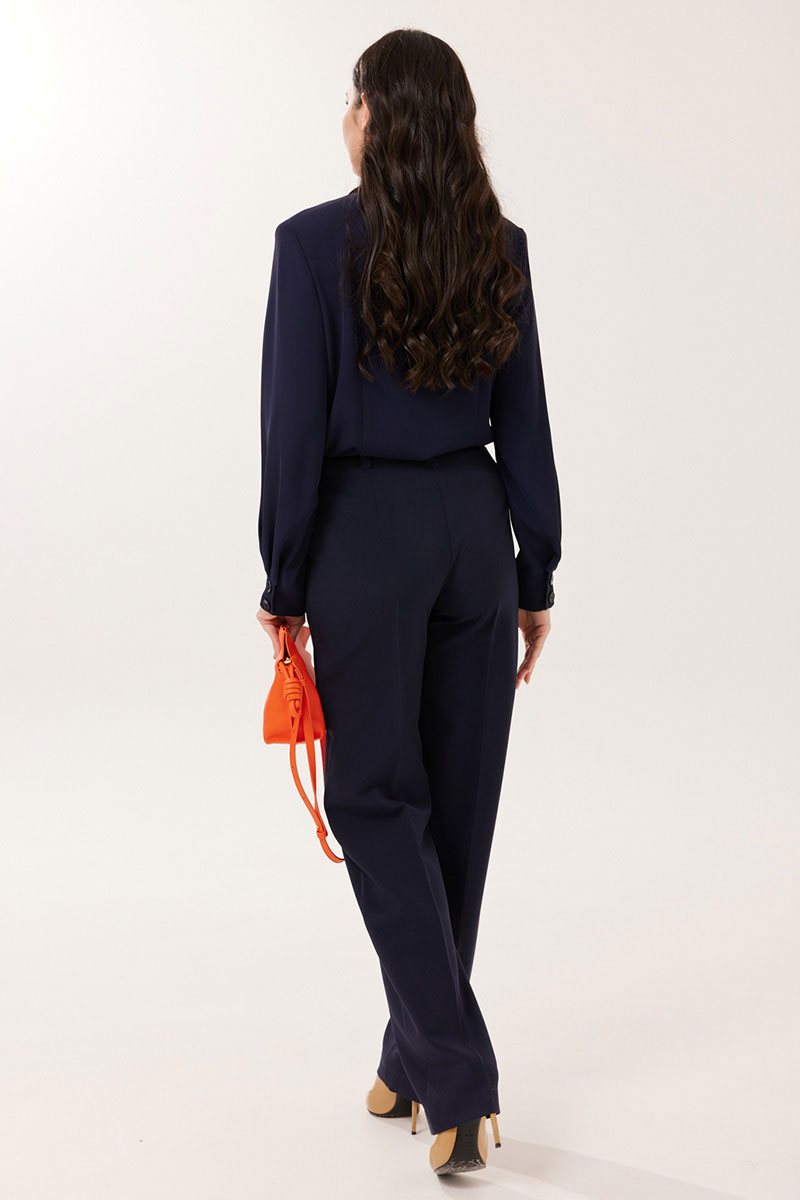 Брюки классической формы, прямого силуэта, со стрелками по передним и задним половинкам. Верхний срез обработан обтачным поясом, дополнен практичными шлевками для ремня. На задних половинках расположены талиевые вытачки с настрочными декоративными листочками. В боковых швах брюк обработаны наклонные карманы. Застёжка центральная на тесьму-молнию и крючок. Брюки комплектуются ремнем.