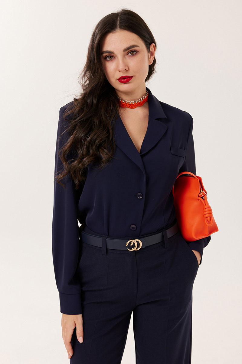 Блуза женская жакетного типа, полуприлегающего силуэта, выполнена из струящейся поливискозы. Блуза с центральной застёжкой на петли и пуговицы. Горловина оформлена воротником пиджачного типа. Правая деталь переда блузы с нагрудной выточкой, левая - с вертикальным рельефом и подрезом, в области груди обработана декоративная листочка. Спинка цельнокроенная с талиевыми выточками. Рукав втачной длинный, низ рукава обработан притачной манжетой, которая застёгивается на 2 петли и пуговицы.