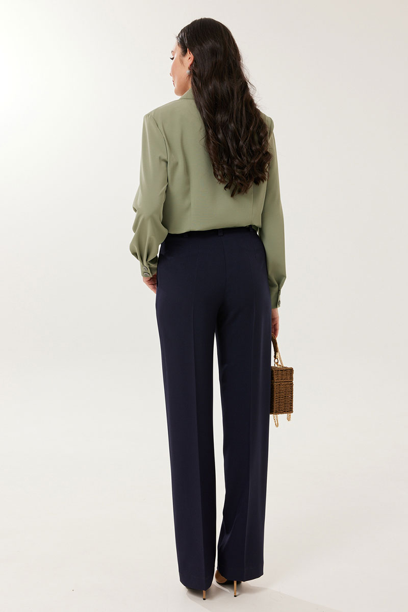 Брюки классической формы, прямого силуэта, со стрелками по передним и задним половинкам. Верхний срез обработан обтачным поясом, дополнен практичными шлевками для ремня. На задних половинках расположены талиевые вытачки с настрочными декоративными листочками. В боковых швах брюк обработаны наклонные карманы. Застёжка центральная на тесьму-молнию и крючок. Брюки комплектуются ремнем.