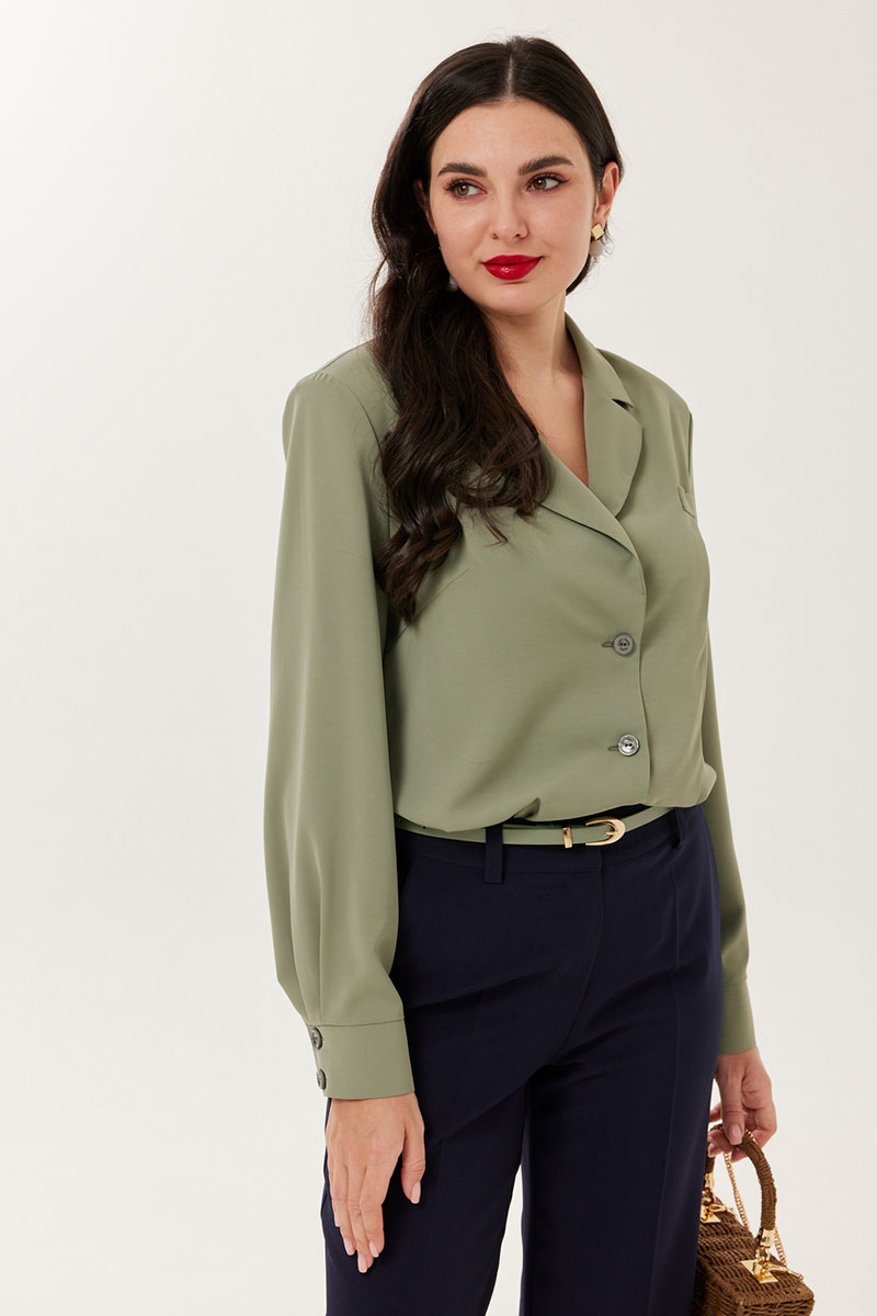 Блуза женская жакетного типа, полуприлегающего силуэта, выполнена из струящейся поливискозы. Блуза с центральной застёжкой на петли и пуговицы. Горловина оформлена воротником пиджачного типа. Правая деталь переда блузы с нагрудной выточкой, левая - с вертикальным рельефом и подрезом, в области груди обработана декоративная листочка. Спинка цельнокроенная с талиевыми выточками. Рукав втачной длинный, низ рукава обработан притачной манжетой, которая застёгивается на 2 петли и пуговицы.
