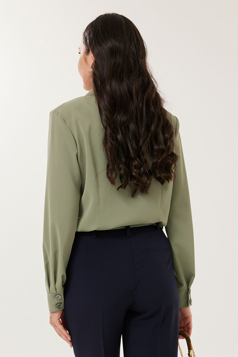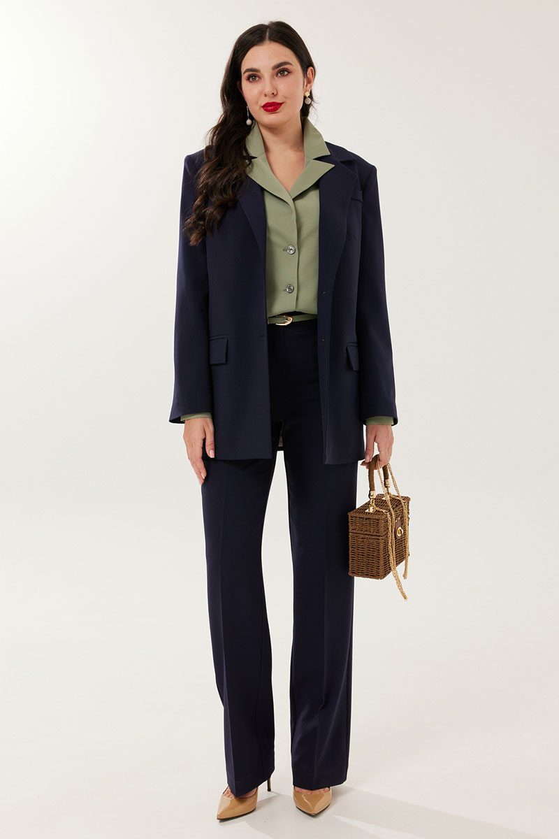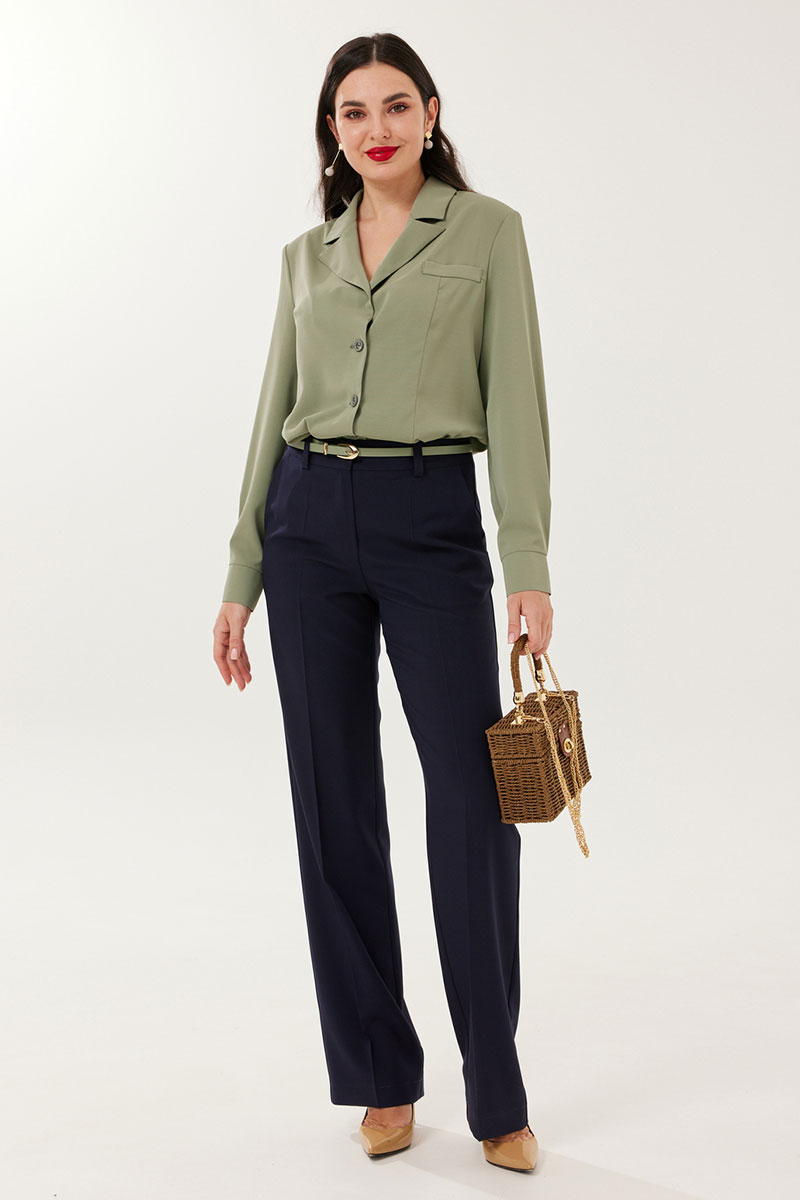 Блуза женская жакетного типа, полуприлегающего силуэта, выполнена из струящейся поливискозы. Блуза с центральной застёжкой на петли и пуговицы. Горловина оформлена воротником