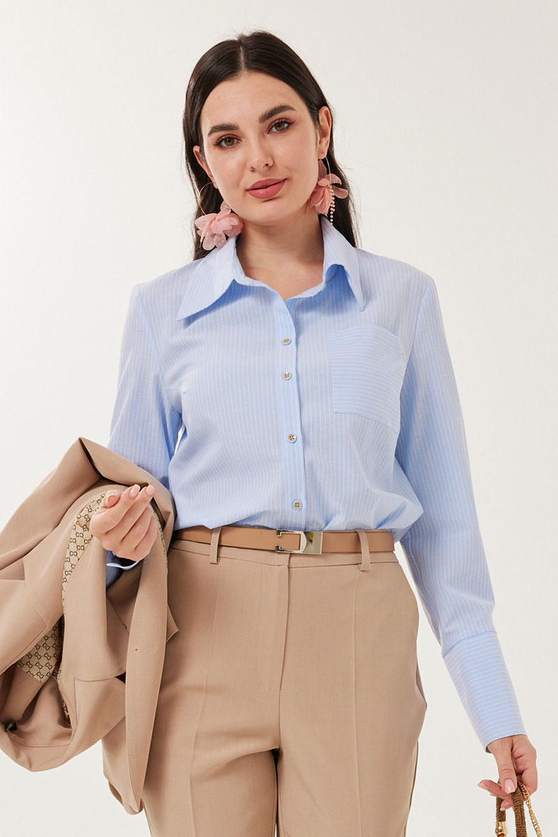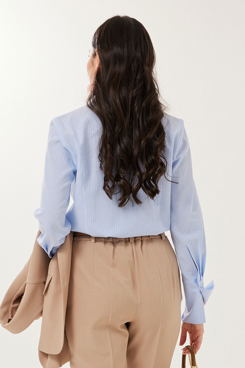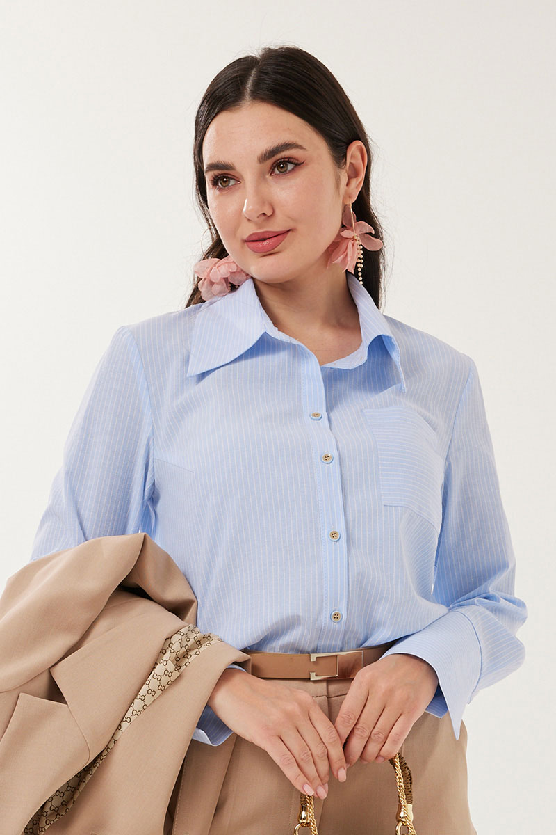 Рубашка полуприлегающего силуэта с центральной планкой и застёжкой на петли и декоративные пуговицы, выполнена из хлопчатобумажной ткани с принтом "полоска". Воротник стояче-отложной.