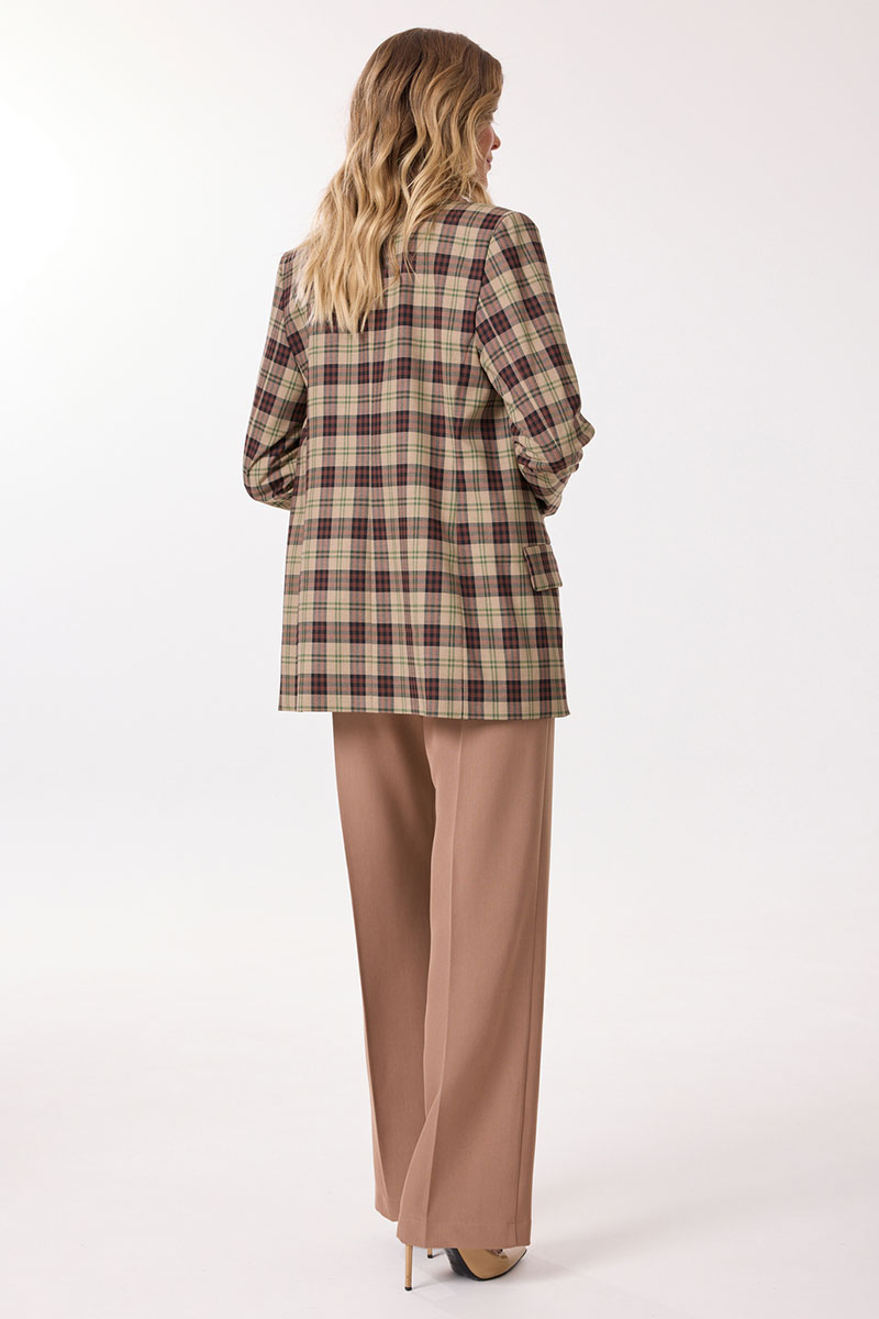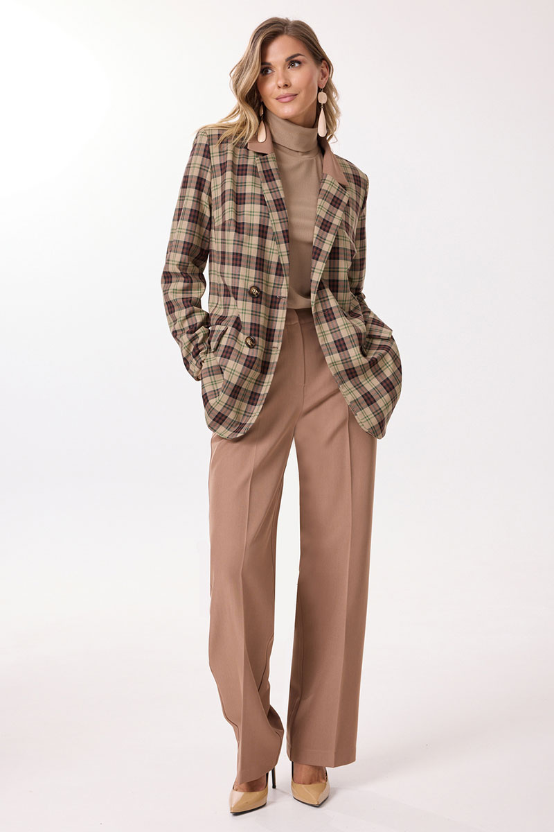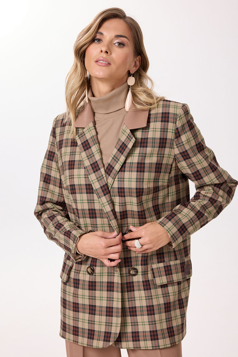 Жакет выполнен из поливискозы с принтом "клетка". Жакет полуприлегающего силуэта, на подкладке, с двухбортной застежкой на петли и пуговицы. Горловина жакета оформлена воротником пиджачного типа. Воротник выполнен из отделочной ткани-компаньена. Рукава двухшовные длинные с возможностью подворота длины. Перед с нагрудными выточками, выходящими из рельефов. В области бедер обработаны прорезные карманы "в рамку" с клапаном. Спинка со средним швом и рельефами.