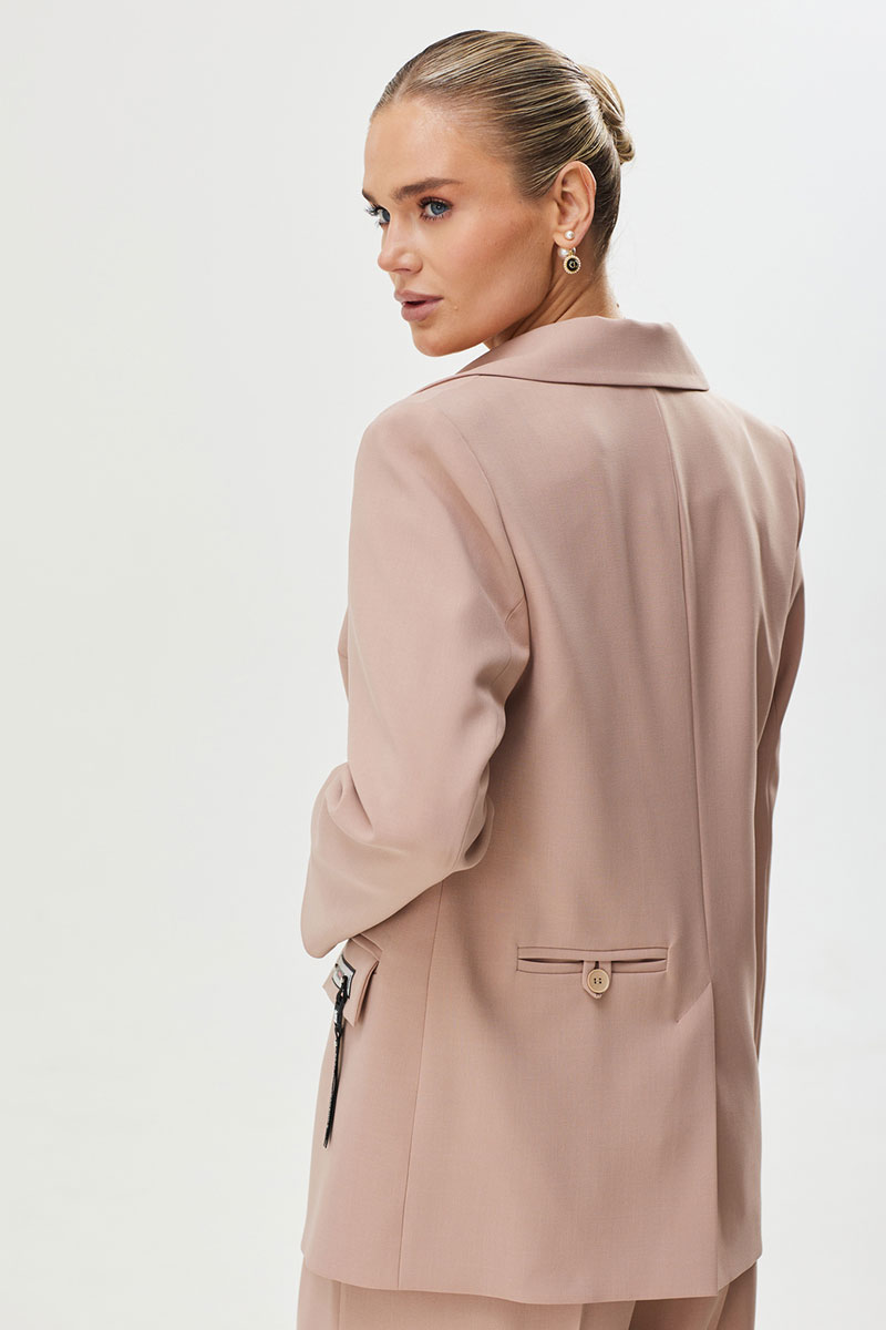Жакет полуприлегающего силуэта, на подкладке, с одноботной застежкой на петли и пуговицы. Горловина жакета оформлена воротником пиджачного типа. В области бедер обработаны прорезные карманы "в рамку" с клапаном. Спинка жакета со средним швом, заканчивающийся шлицей, левая часть спинки с прорезным карманом в рамку, вход в который фиксирует навесная петля с пуговицей.