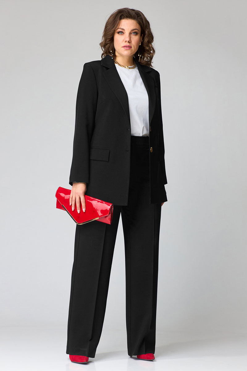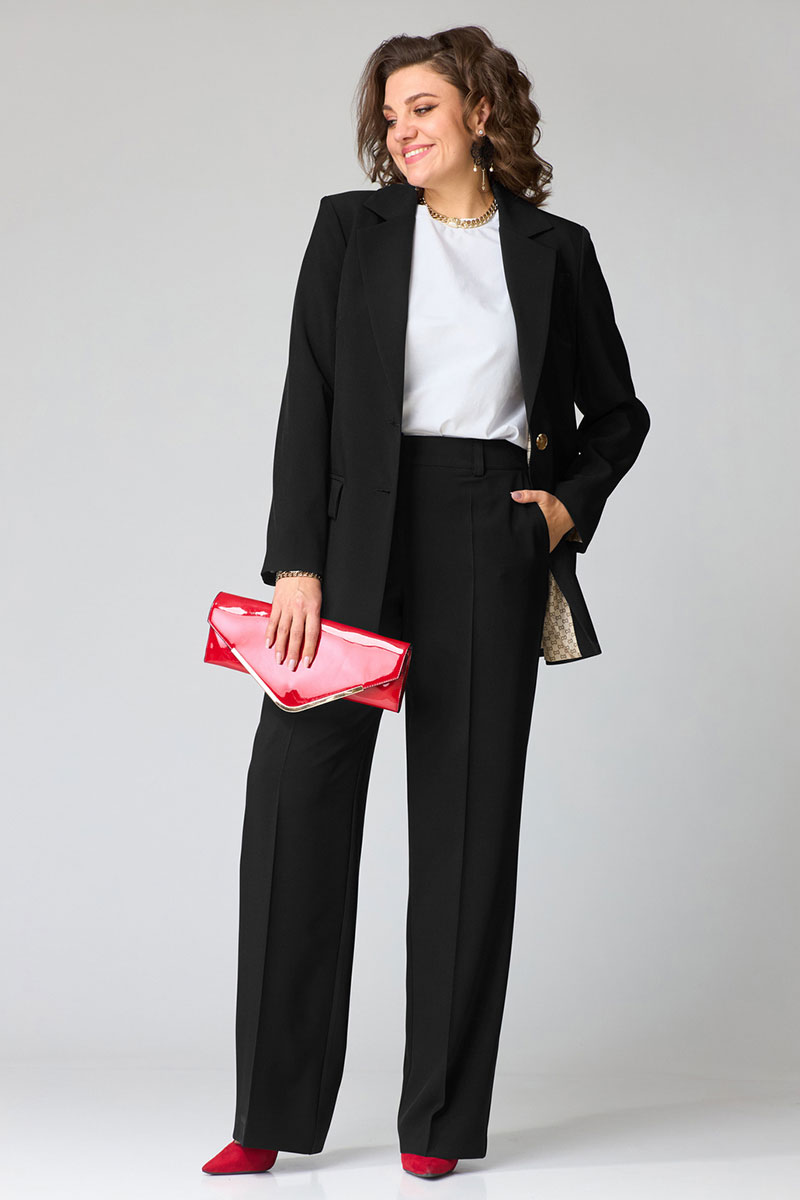 Элегантный костюм-тройка, состоящий из жакета, футболки и брюк. Жакет и брюки выполнены из костюмной ткани, футболка из трикотажного полотна.