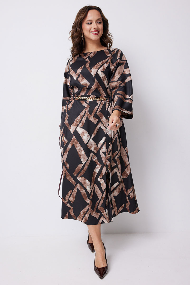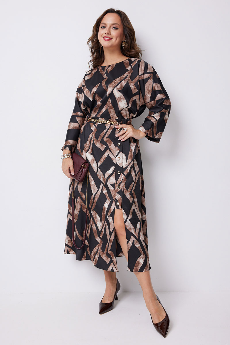 Стильное платье А-силуэта, выполненное из вискозы с оригинальным принтом. Платье отрезное по линии талии. Верхняя часть переда платья с круглой горловиной, спинка - со средним швом и