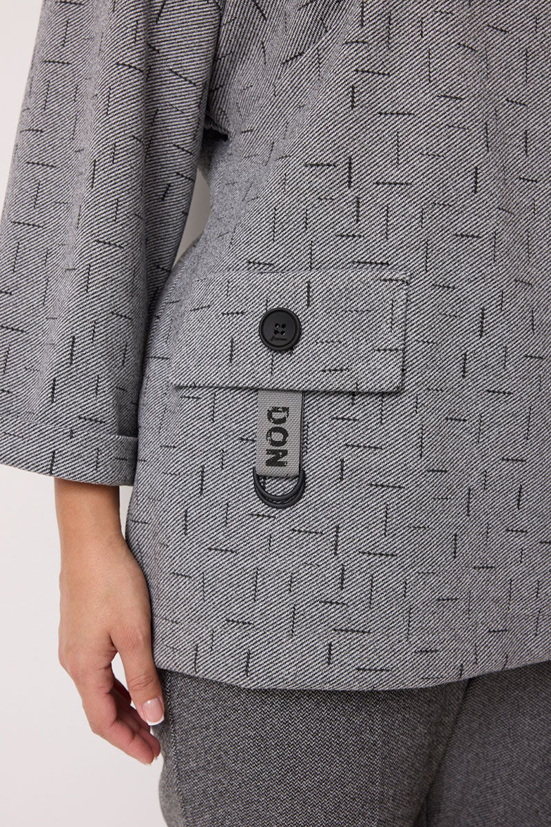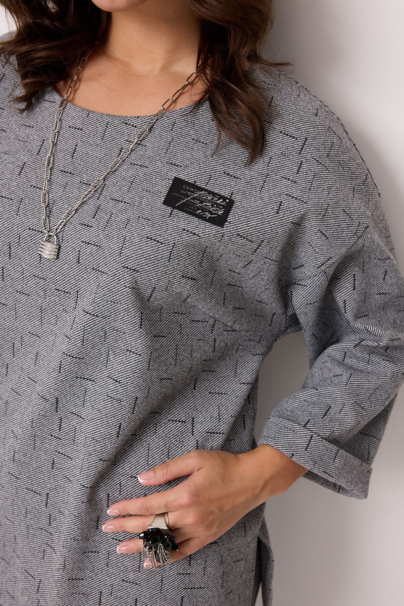 Блуза выполнена из поливискозы с принтом "штрихи". Блуза длиной до середины бедра, прямого силуэта. Горловина круглой формы. Рукава двухшовные длиной 3/4, с манжетой. Перед с нагрудными вытачками, выходящими из бокового шва. В области груди расположена декоративная нашивка. В области бедра настрочен клапан с декоративной тесьмой и пряжкой, который зафиксирован пуговицей. Спинка со средним швом и декоративной шлицей с пуговицами в верхней части спинки. По низу боковых швов обработаны разрезы.