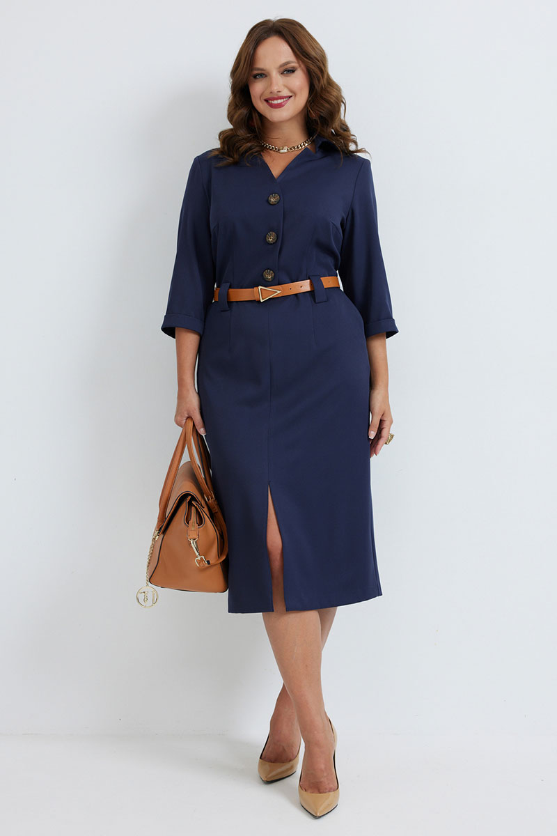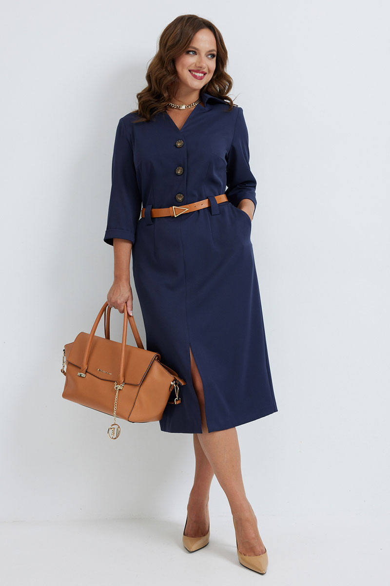 бедер обработаны карманы. Рукав втачной, с цельнокроеной манжетой, длиной 3/4. В комплект к платью входит контрастный ремень с декоративной пряжкой.
