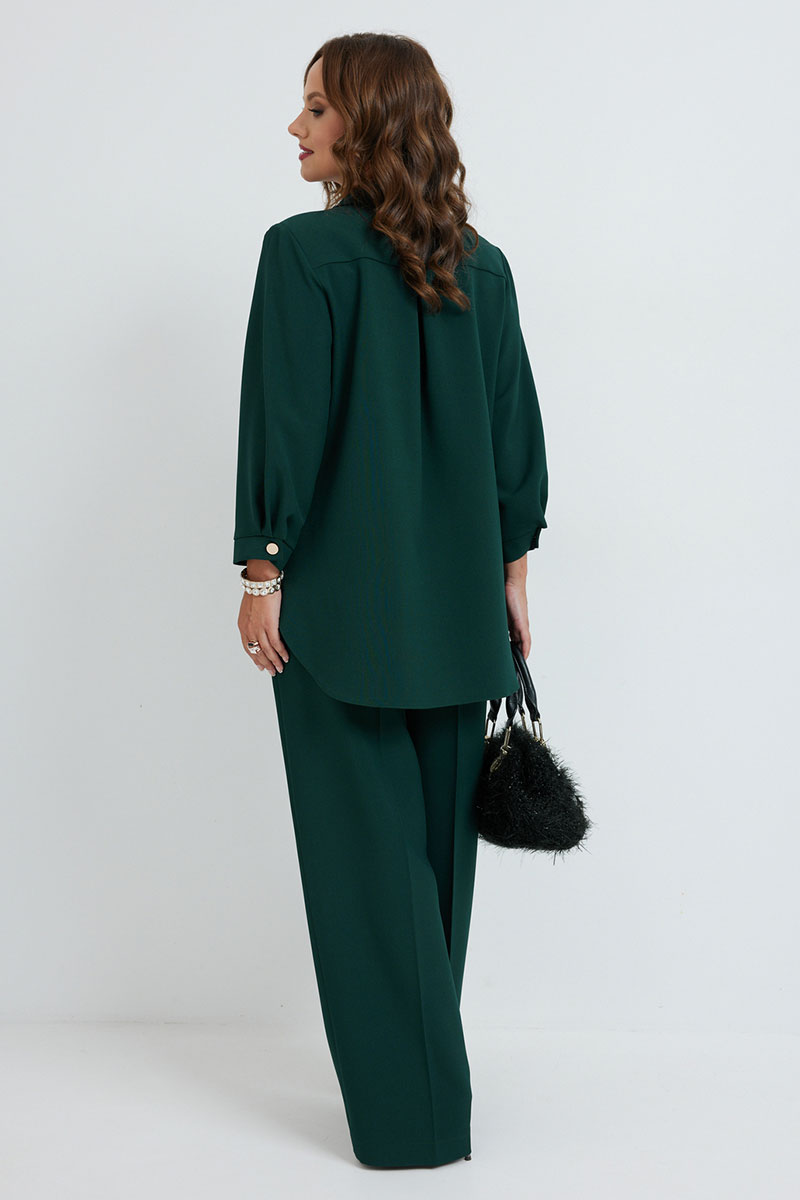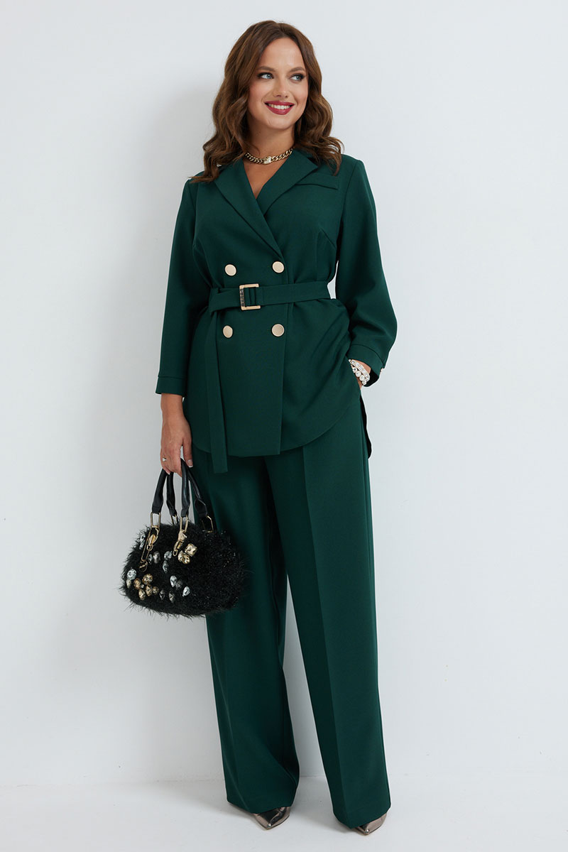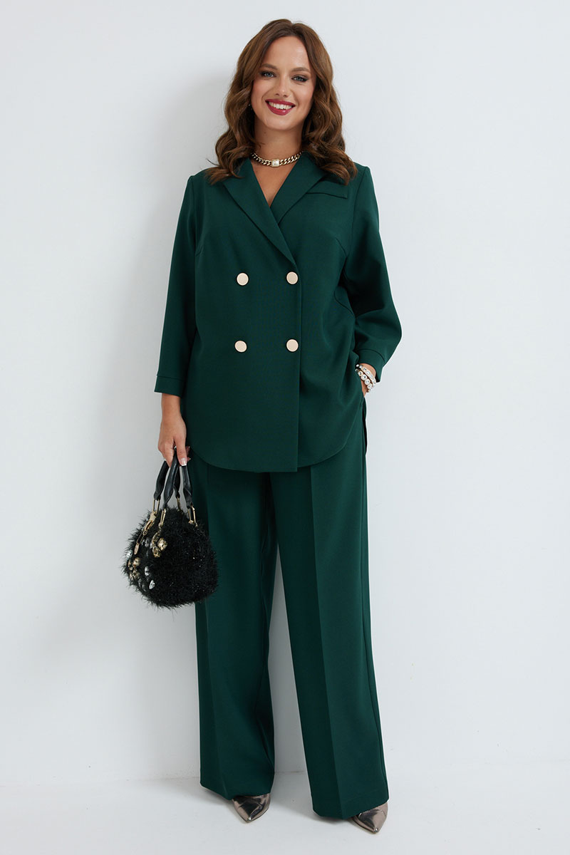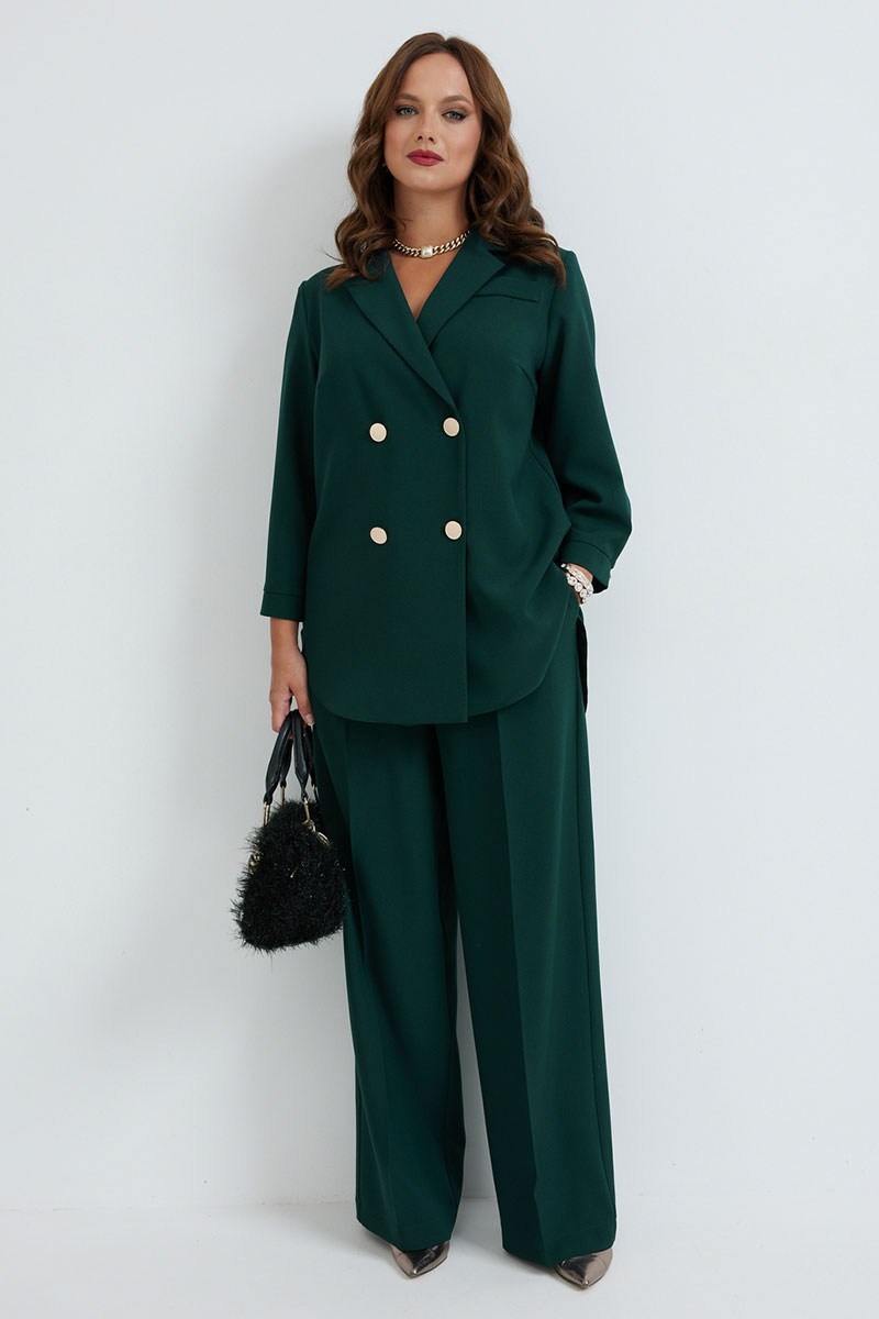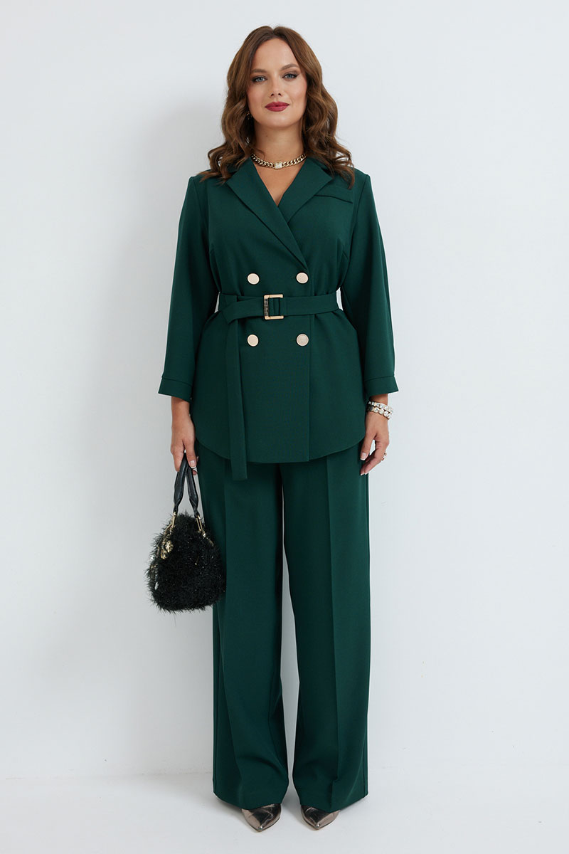 Костюм состоит из жакета и брюк. Качественная поливискоза, из которой выполнена модель, обеспечит долговечность изделию и приятные ощущения его обладательнице.