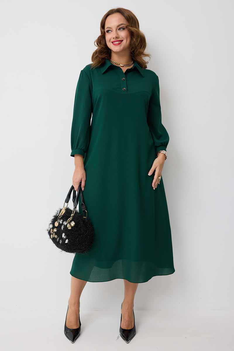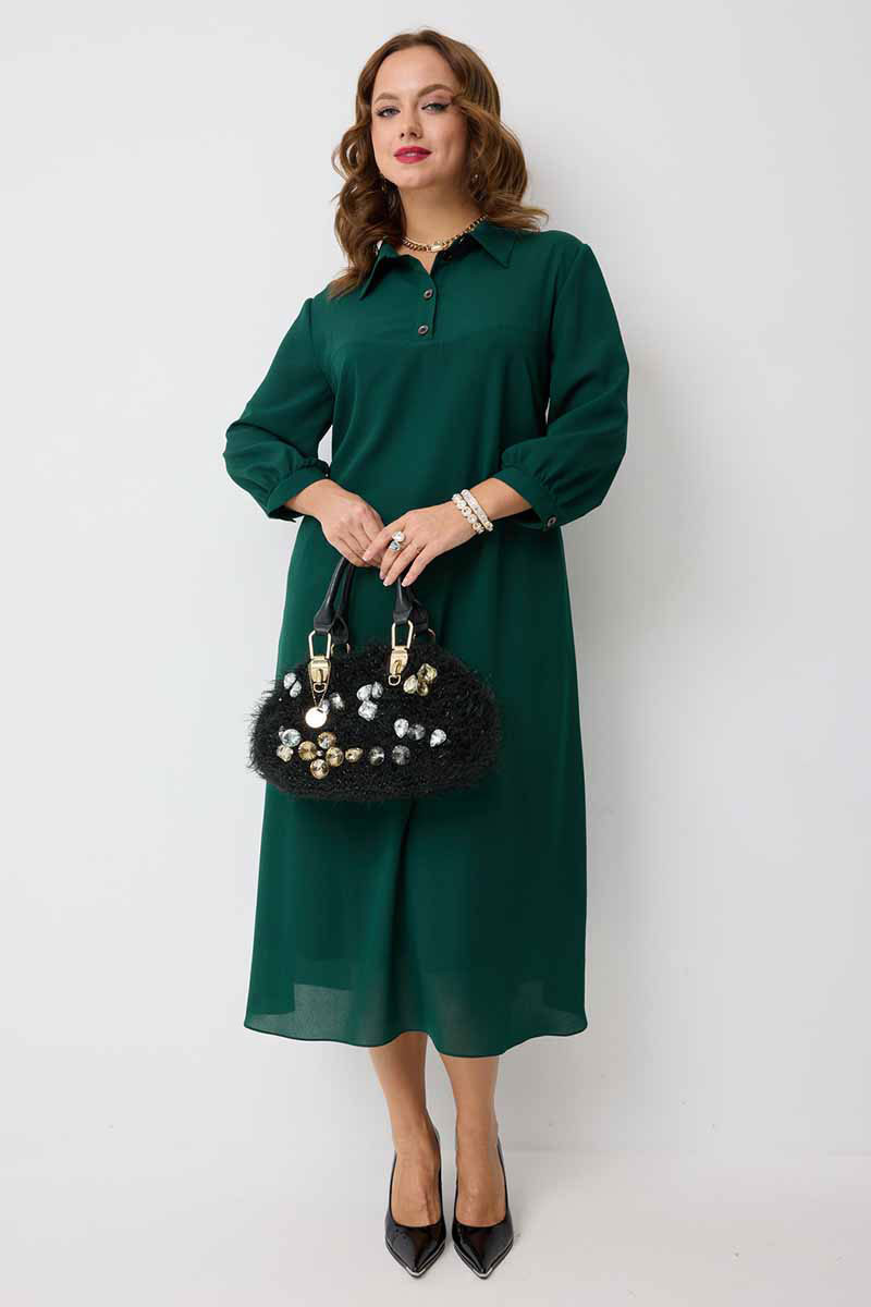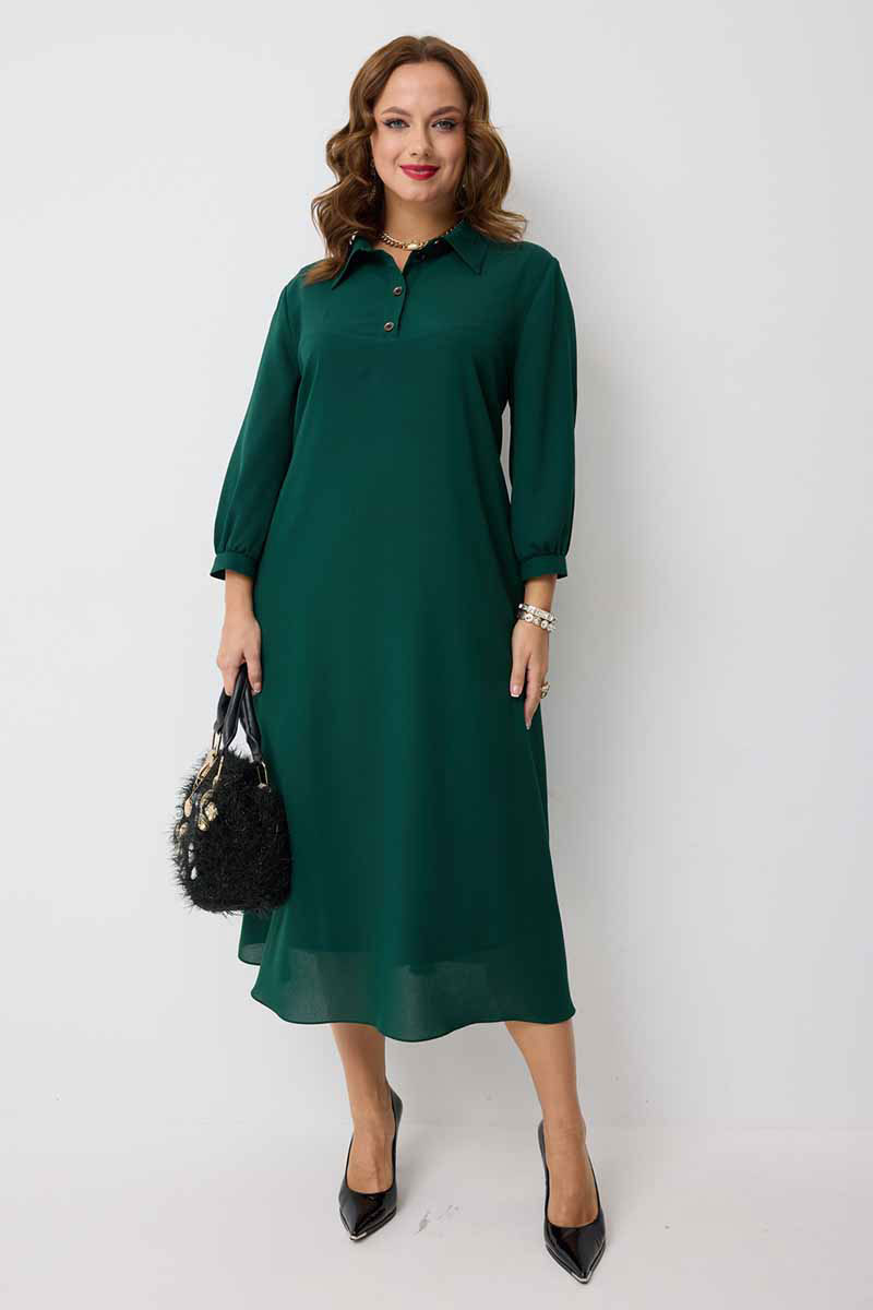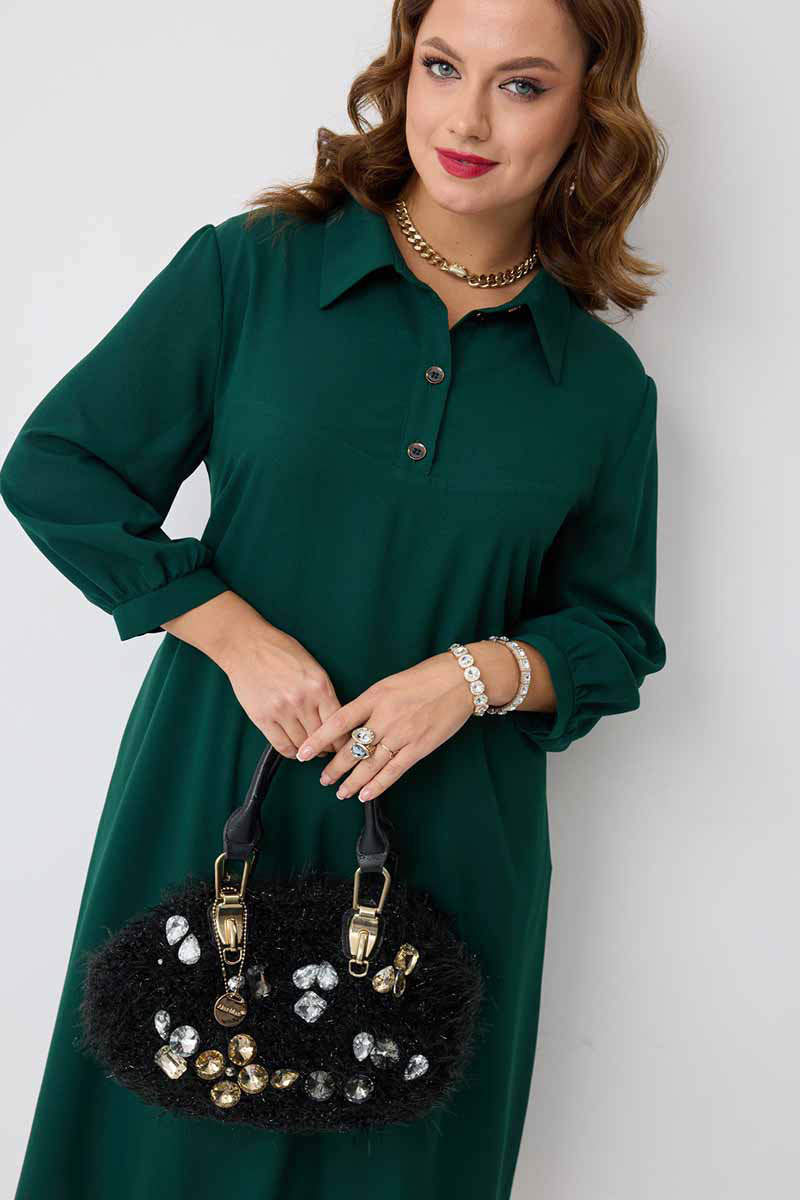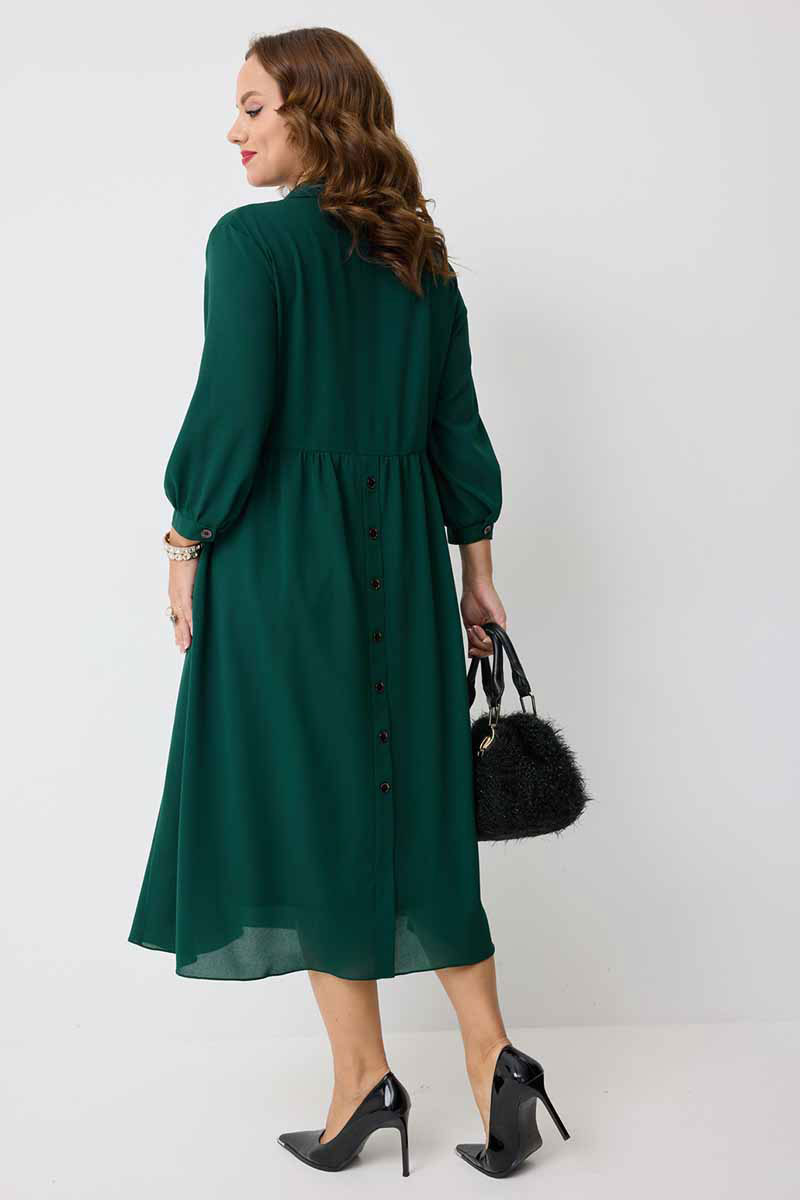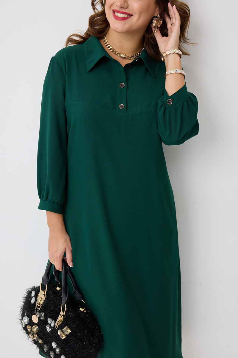 декоративными пуговицами. Горловина платья оформлена воротником рубашечного типа. Рукав втачной одношовный, по низу на сборке и притачной манжете, которая застёгивается на петлю и