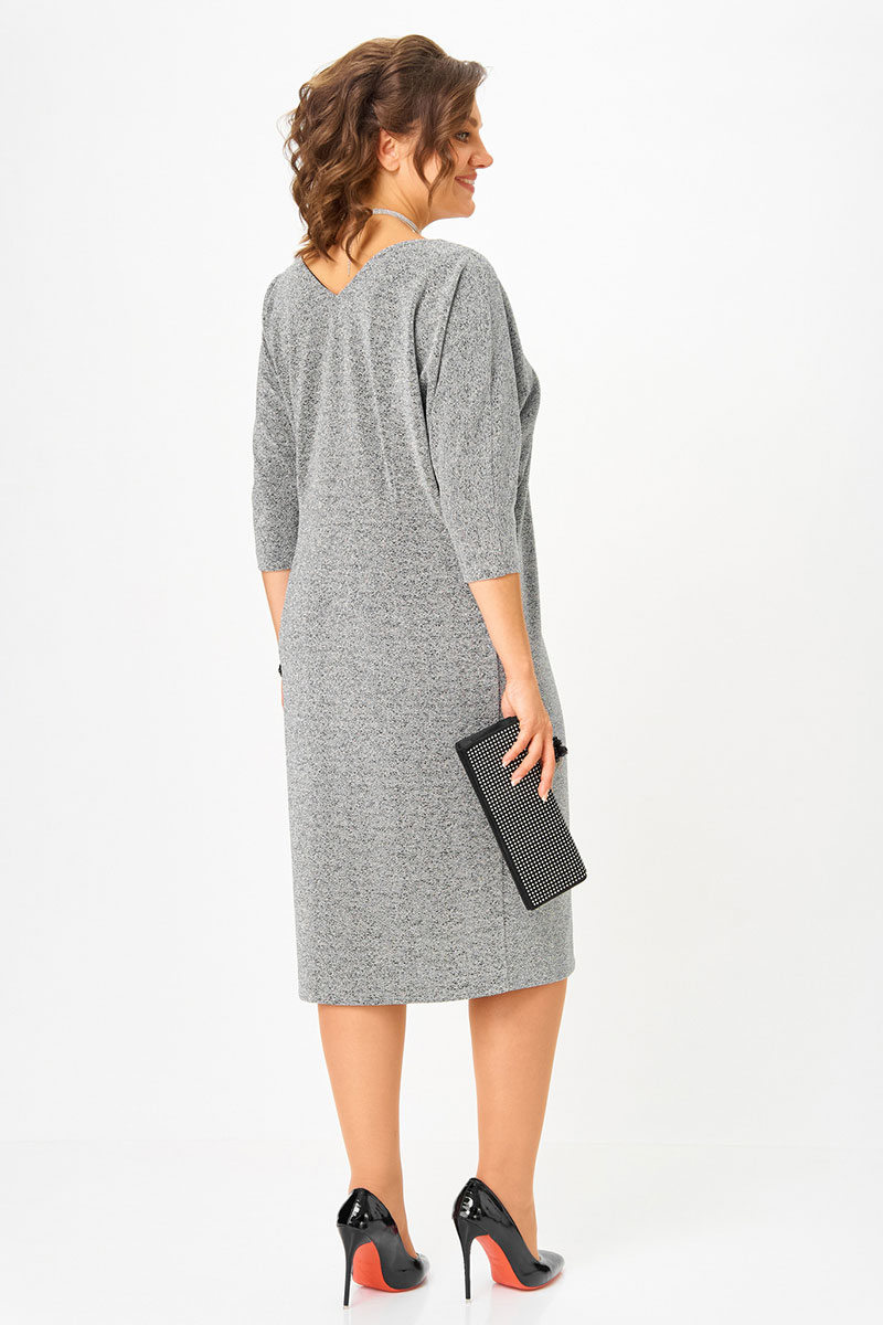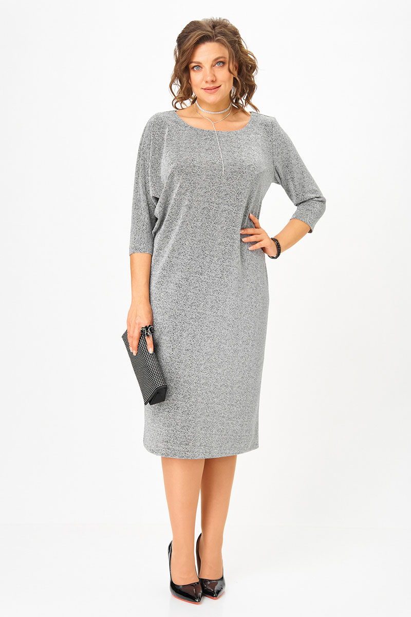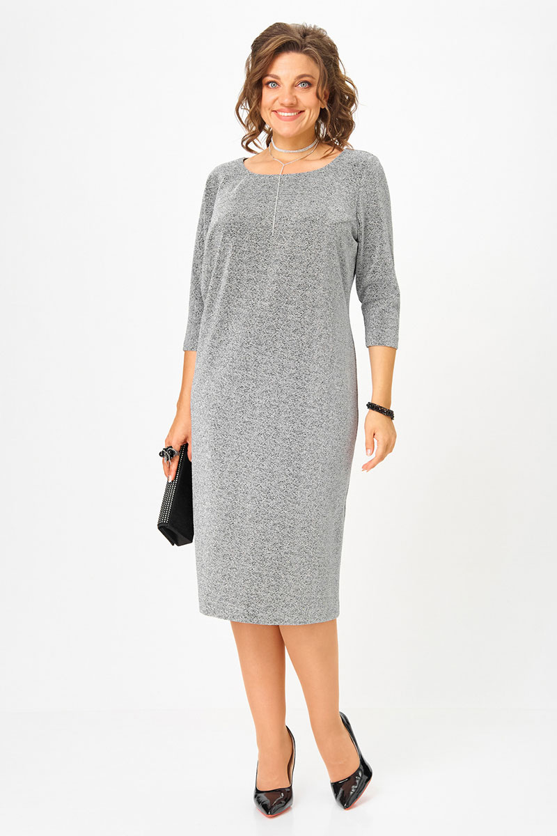Платье полуприлегающего силуэта комбинированного покроя, выполненное из трикотажного полотна с люрексом. Горловина по переду оформлена в форме"лодочка", по спинке - аккуратный V-