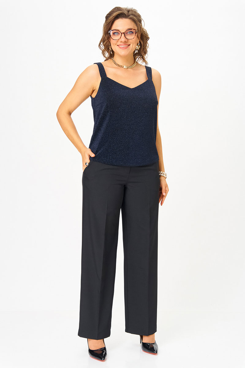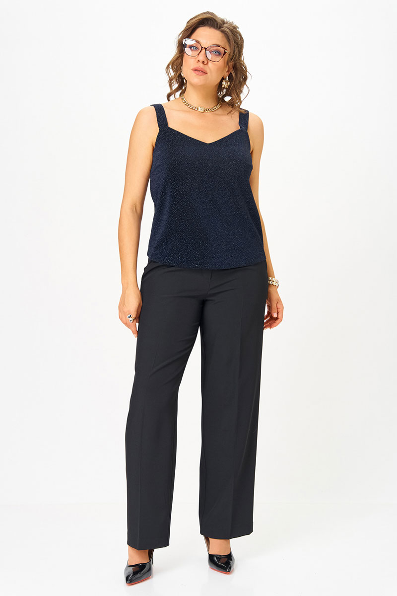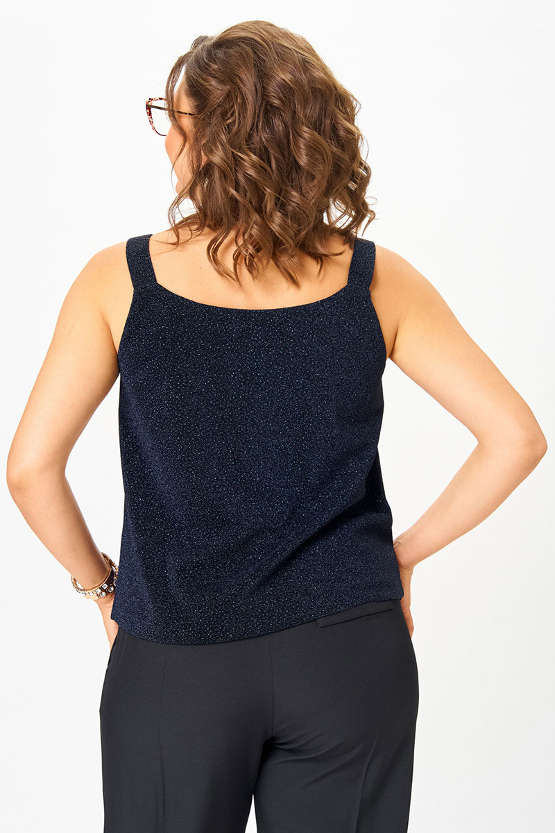 Топ прямого силуэта на широких бретелях, выполнен из трикотажного полотна с люрексом. Перед с нагрудными вытачками. Горловина переда лёгкой V-образной формы. Спинка цельнокроеная.