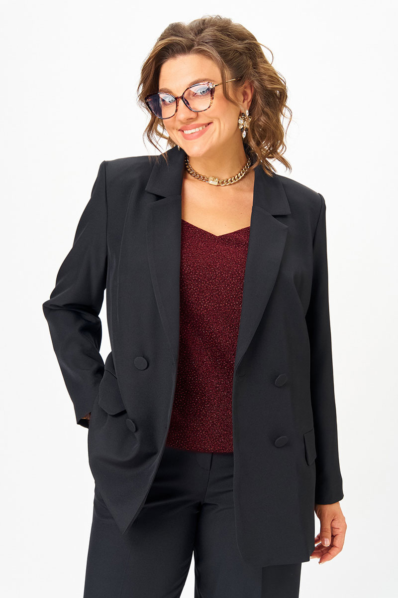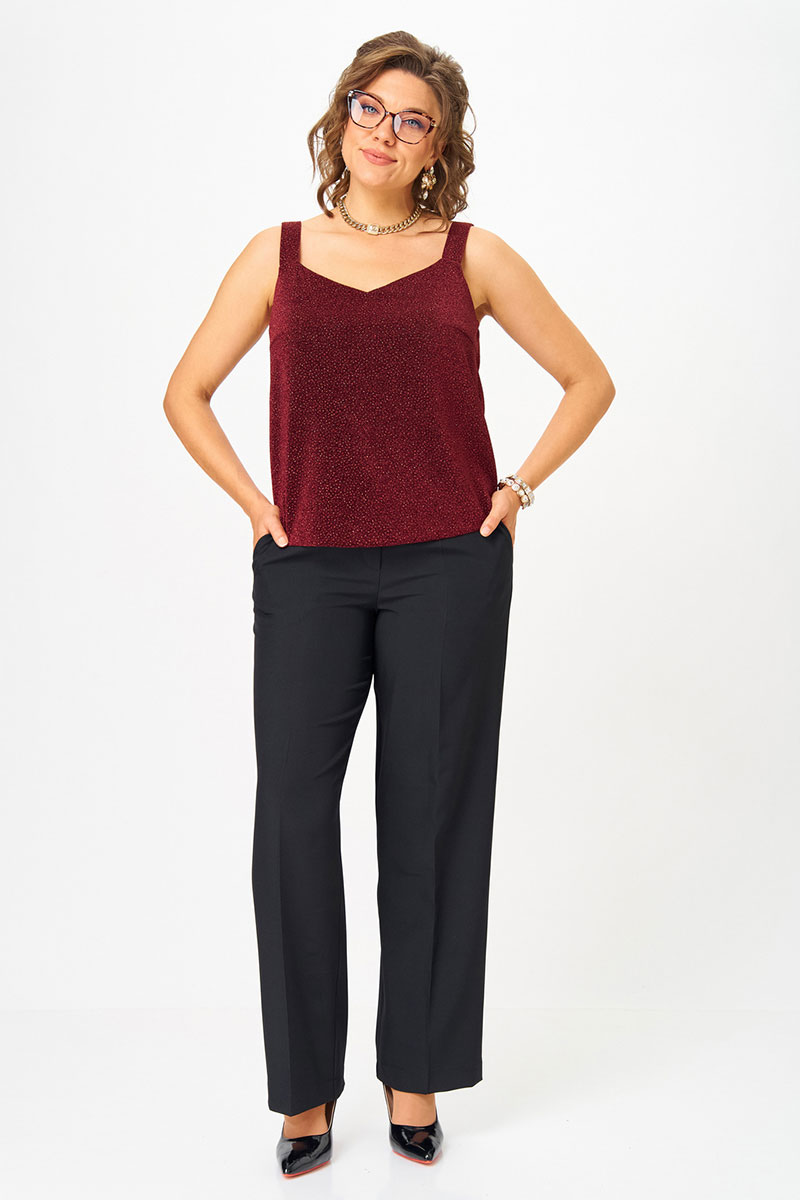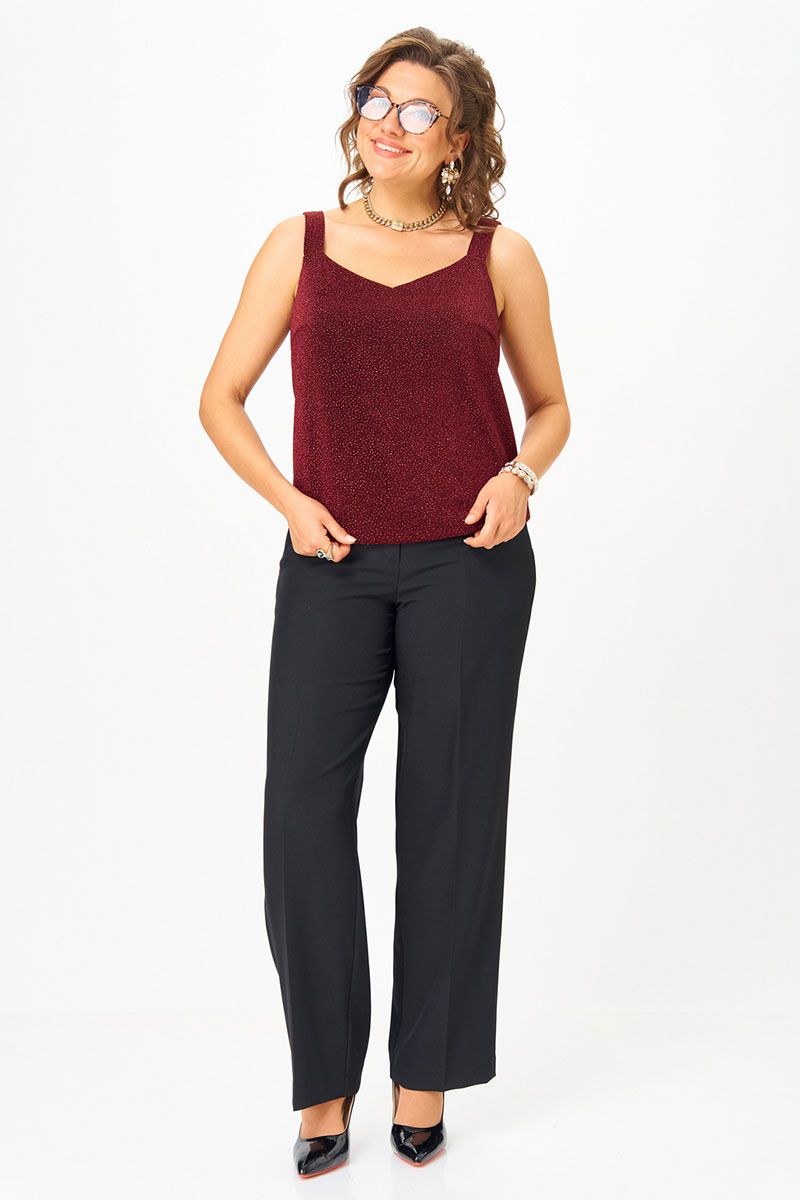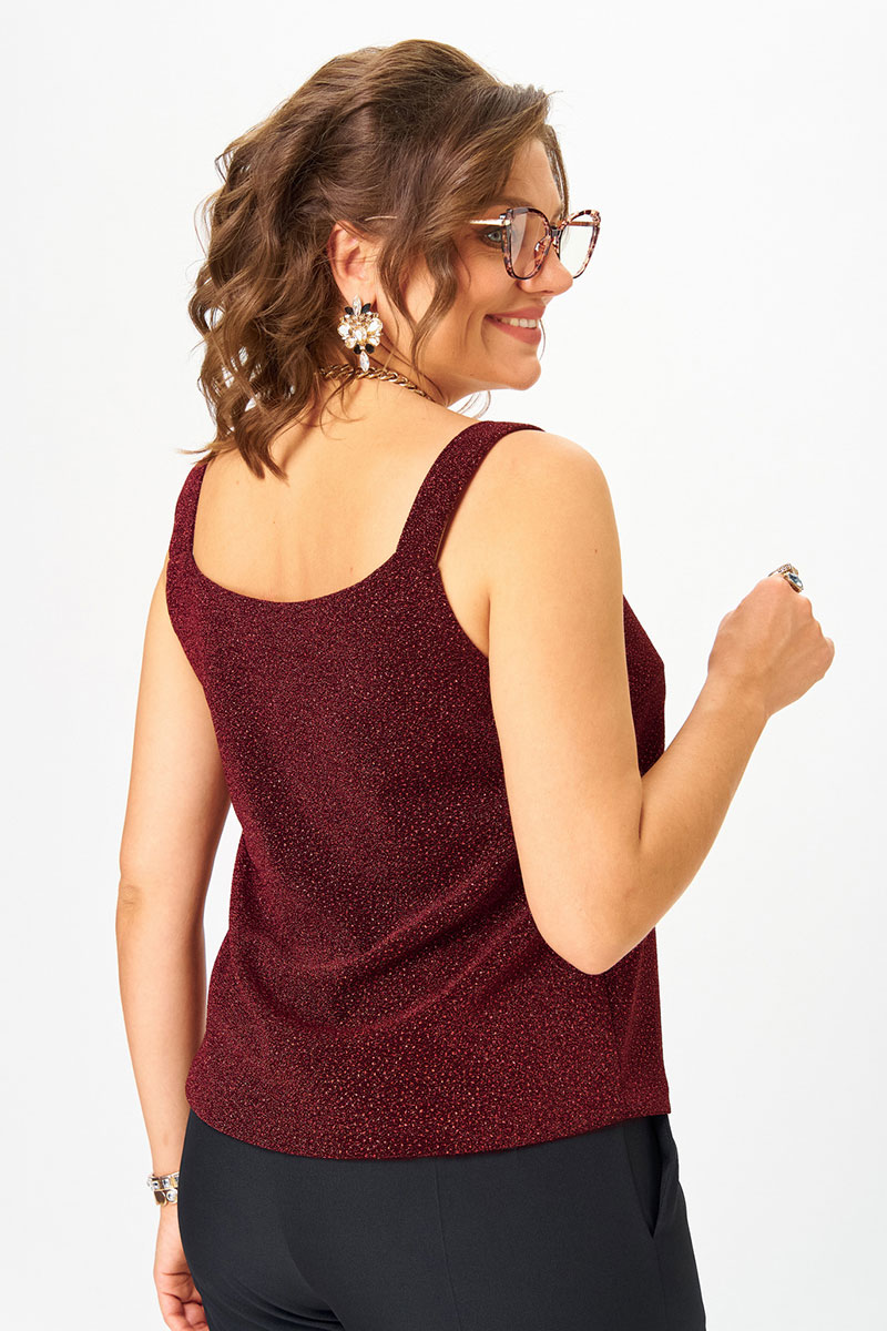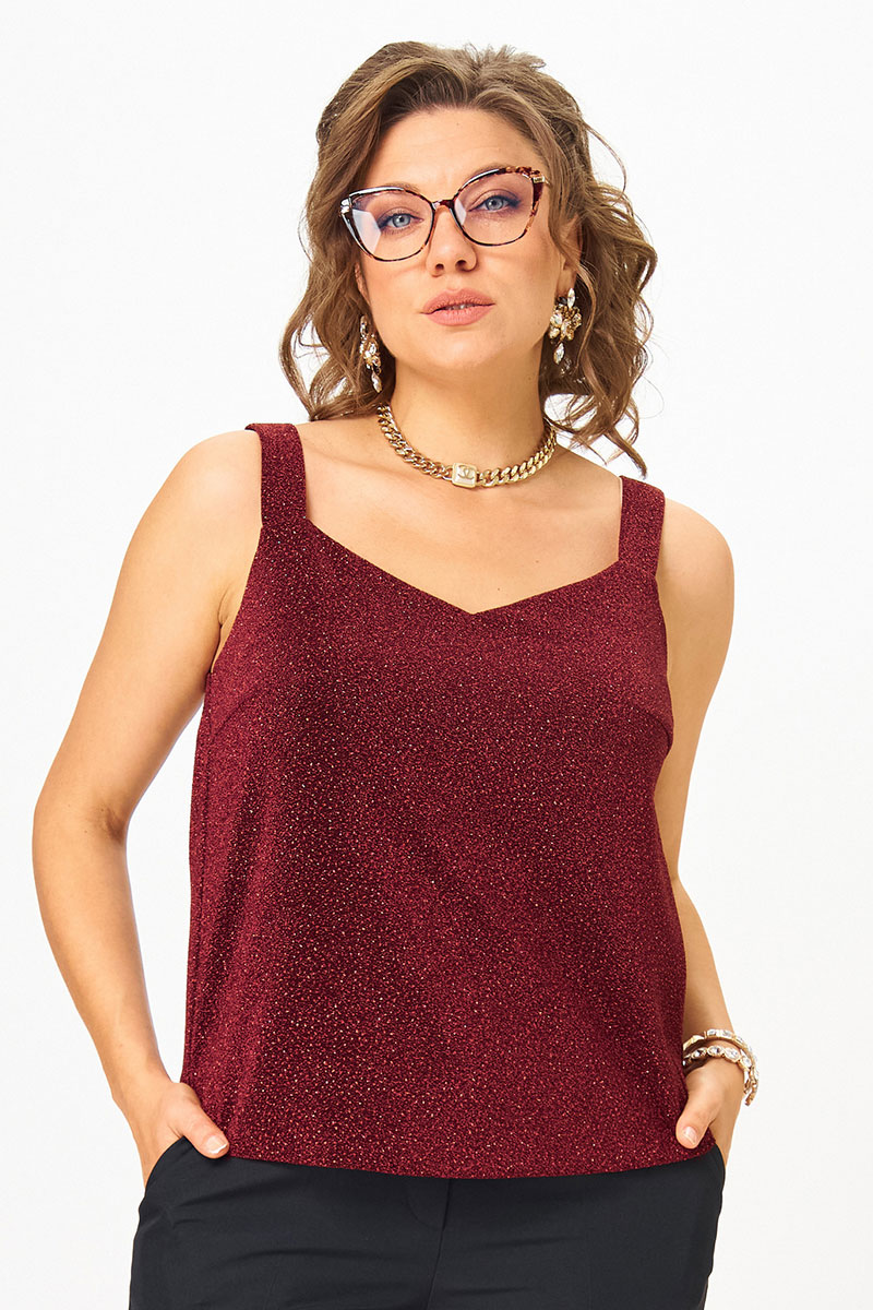 Топ прямого силуэта на широких бретелях, выполнен из трикотажного полотна с люрексом. Перед с нагрудными вытачками. Горловина переда лёгкой V-образной формы. Спинка цельнокроеная.