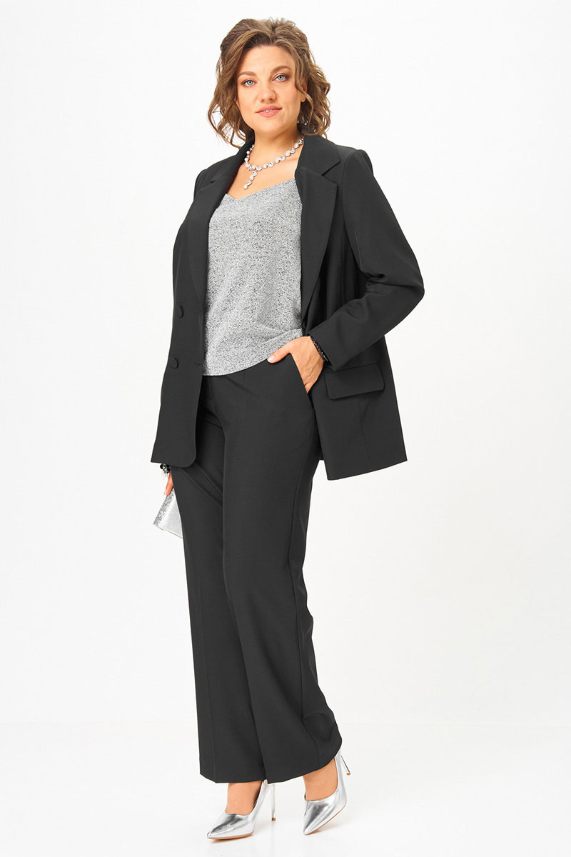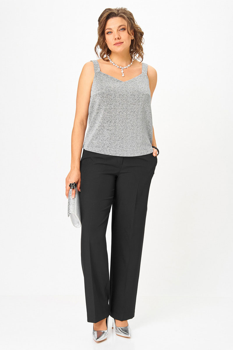 Топ прямого силуэта на широких бретелях, выполнен из трикотажного полотна с люрексом. Перед с нагрудными вытачками. Горловина переда лёгкой V-образной формы. Спинка цельнокроеная.