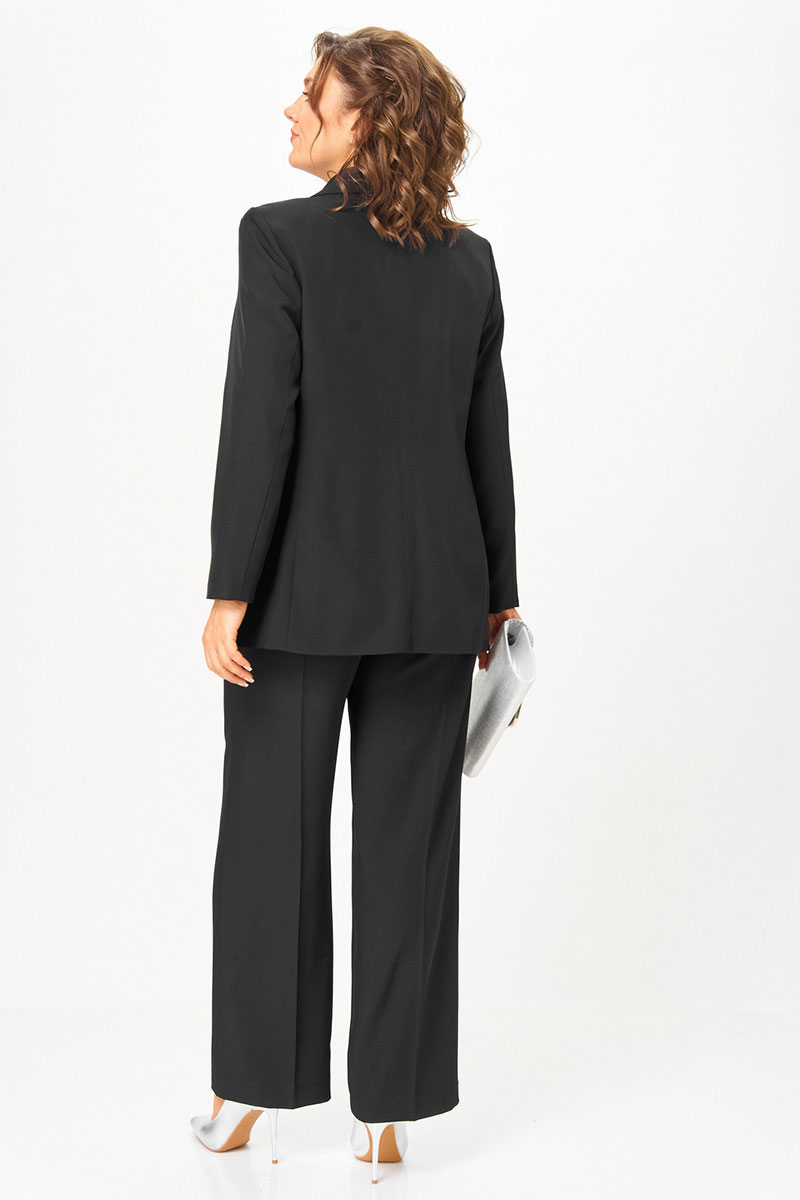жакета с нагрудными вытачками и прорезными карманами с клапаном. Спинка жакета со средним швом. Рукава двухшовные втачные. Горловина оформлена воротником пиджачного типа. Брюки