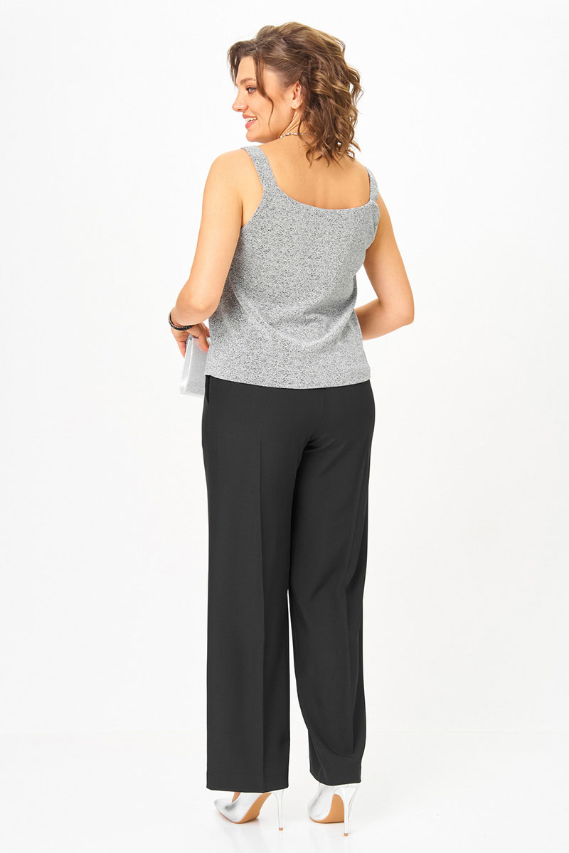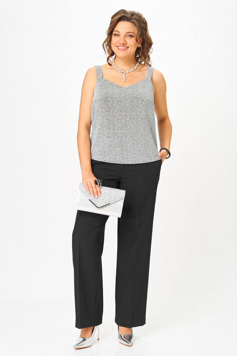 центральная на тесьму-молнию и крючок. В модели использована фурнитура контрастного цвета. Топ прямого силуэта на широких бретелях, выполнен из трикотажного полотна с люрексом. Перед