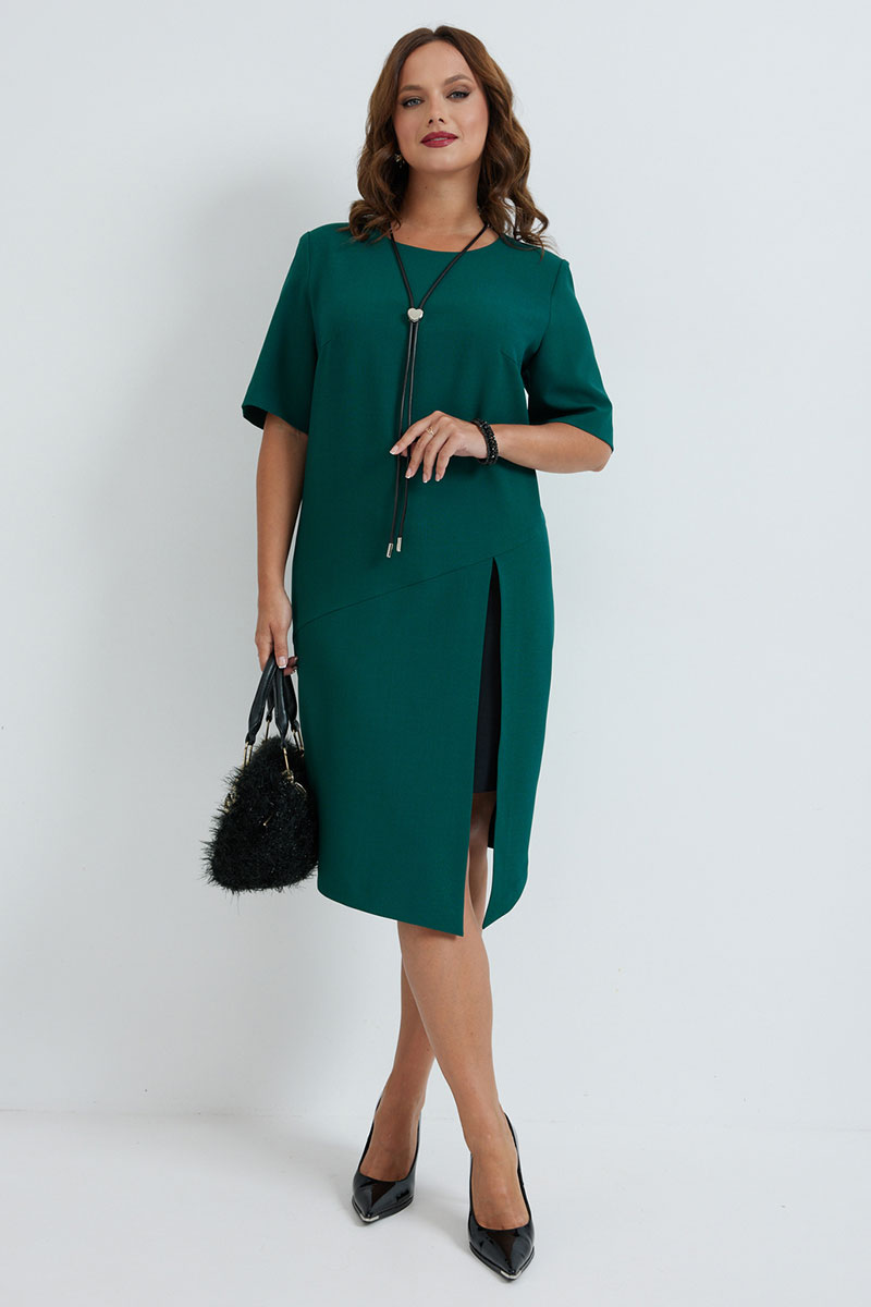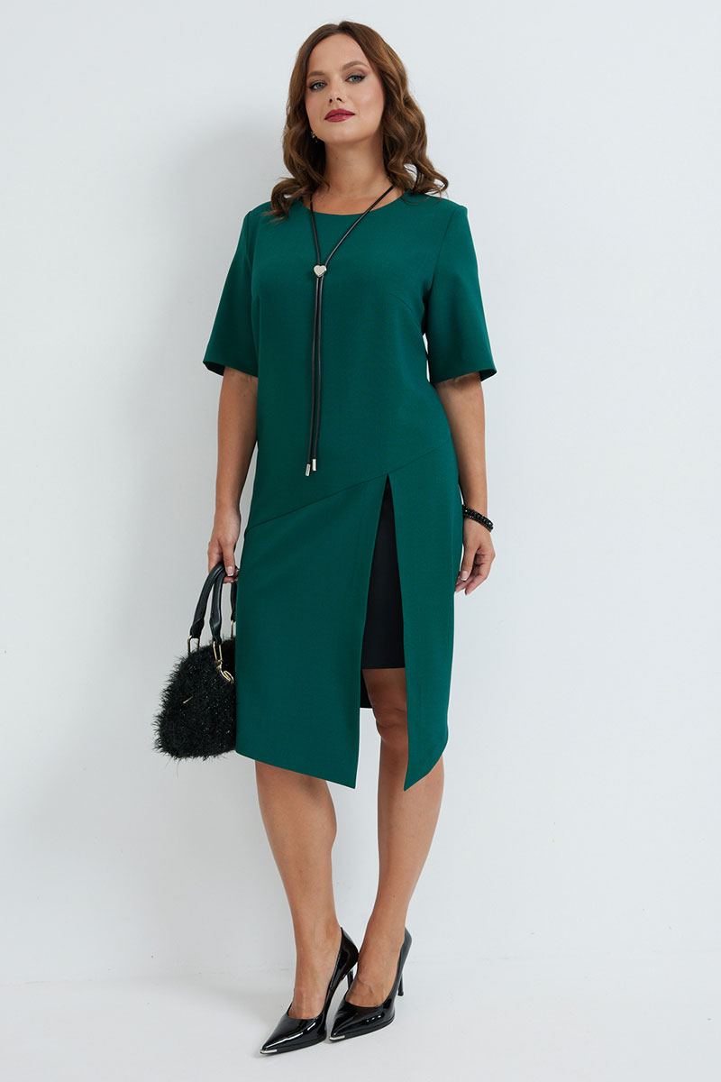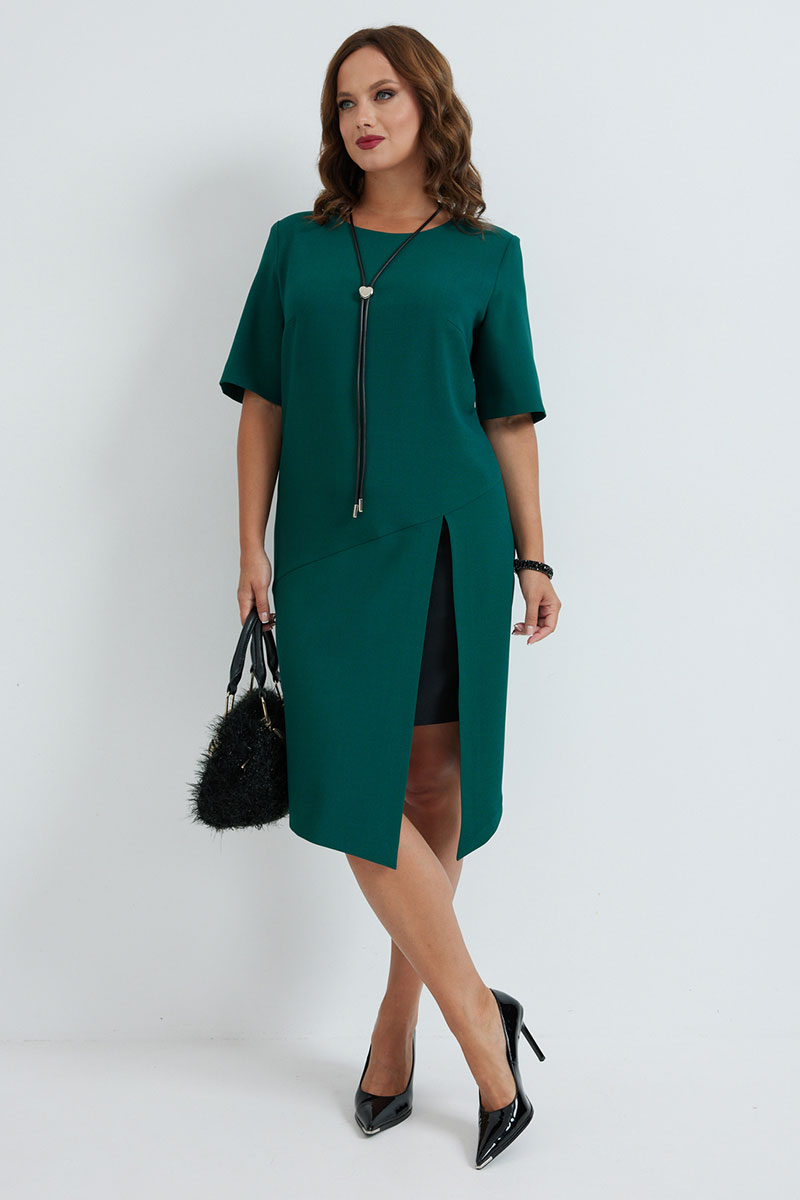 Эффектное платье прямого силуэта, выполненнное из поливискозы двух цветов. Перед платья с круглой горловиной и нагрудными вытачками. Перед платья в области бедра с косым подрезом.
