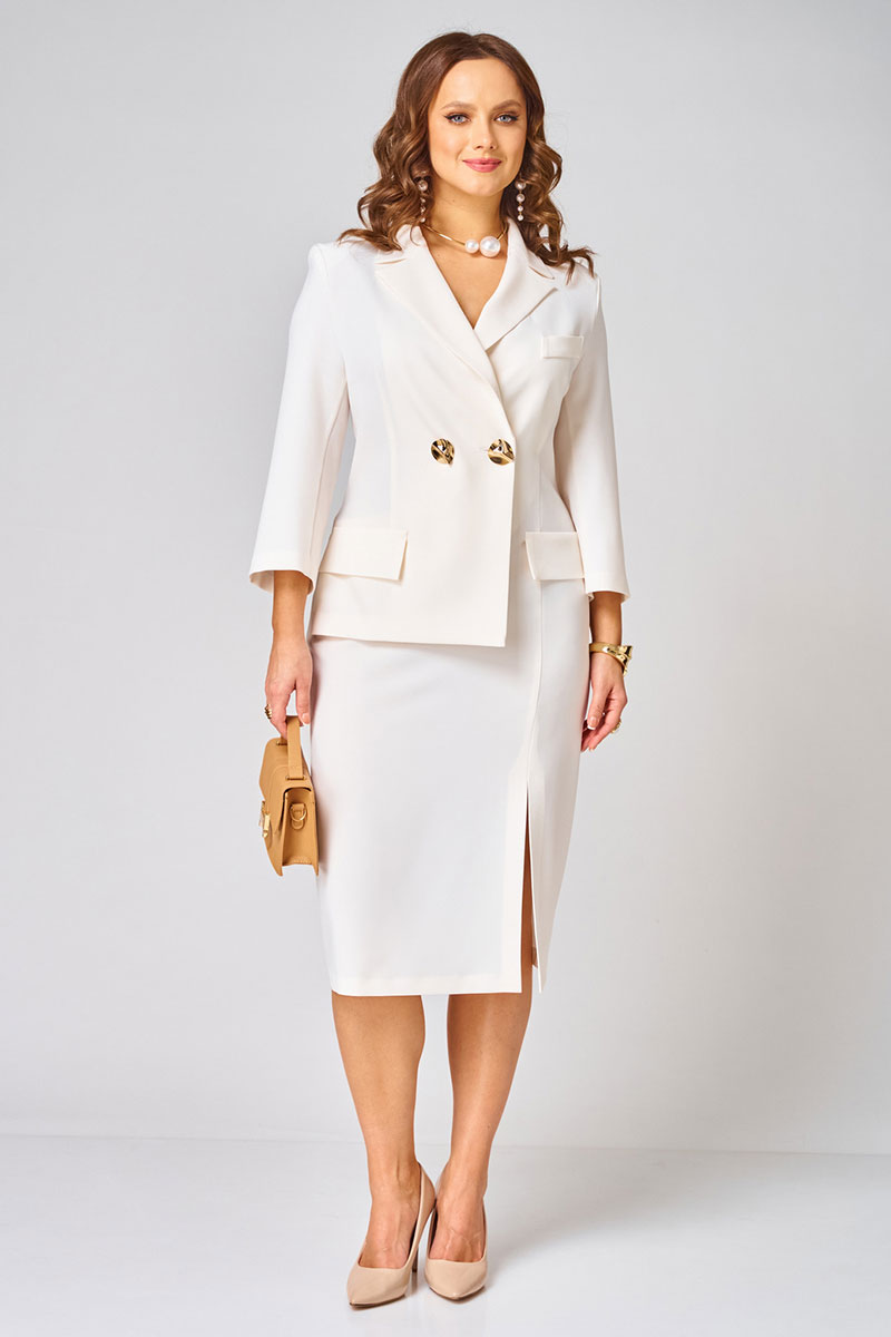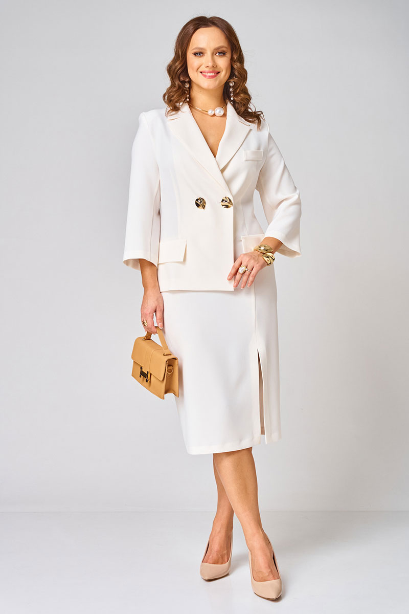Платье прилегающего силуэта, длиной миди, выполненное из плательной поливискозы. Платье жакетного типа с ассиметричным передом. Одна из сторон переда имитирует жакет и юбку, другая-платье. Перед с талиевыми вытачками с подрезом. В области груди настрочена декоративная листочка, в области бедер - карманы-обманки с листочками и клапаном. По переду обработан разрез. В области талии расположена застёжка на 2 петли и крупные декоративные пуговицы. Спинка со средним швом, в который вставлена потайная молния. Рукав 2-шовный втачной, длиной 3/4.
