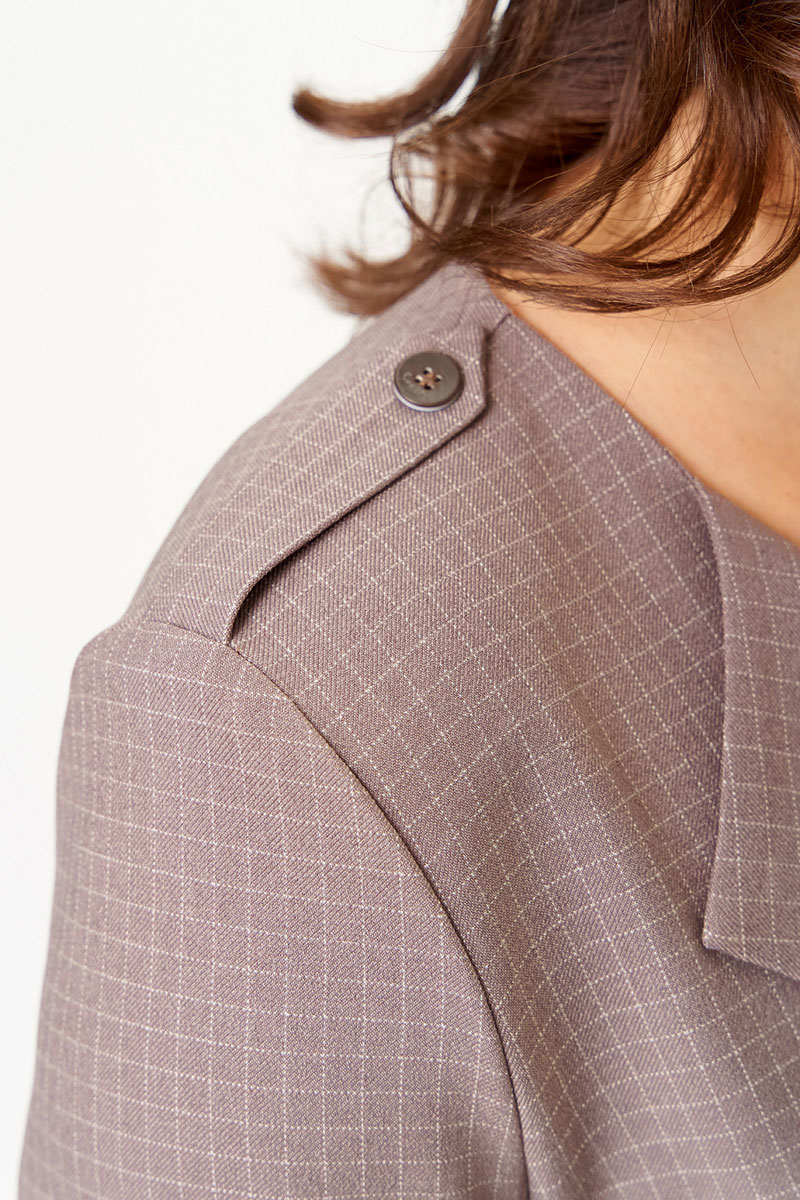 Элегантное платье полуприлегающего силуэта с асимметричной застежкой на петли и пуговицы. Перед платья с нагрудными вытачками и клапанами в области бёдер. Спинка с талиевыми вытачками