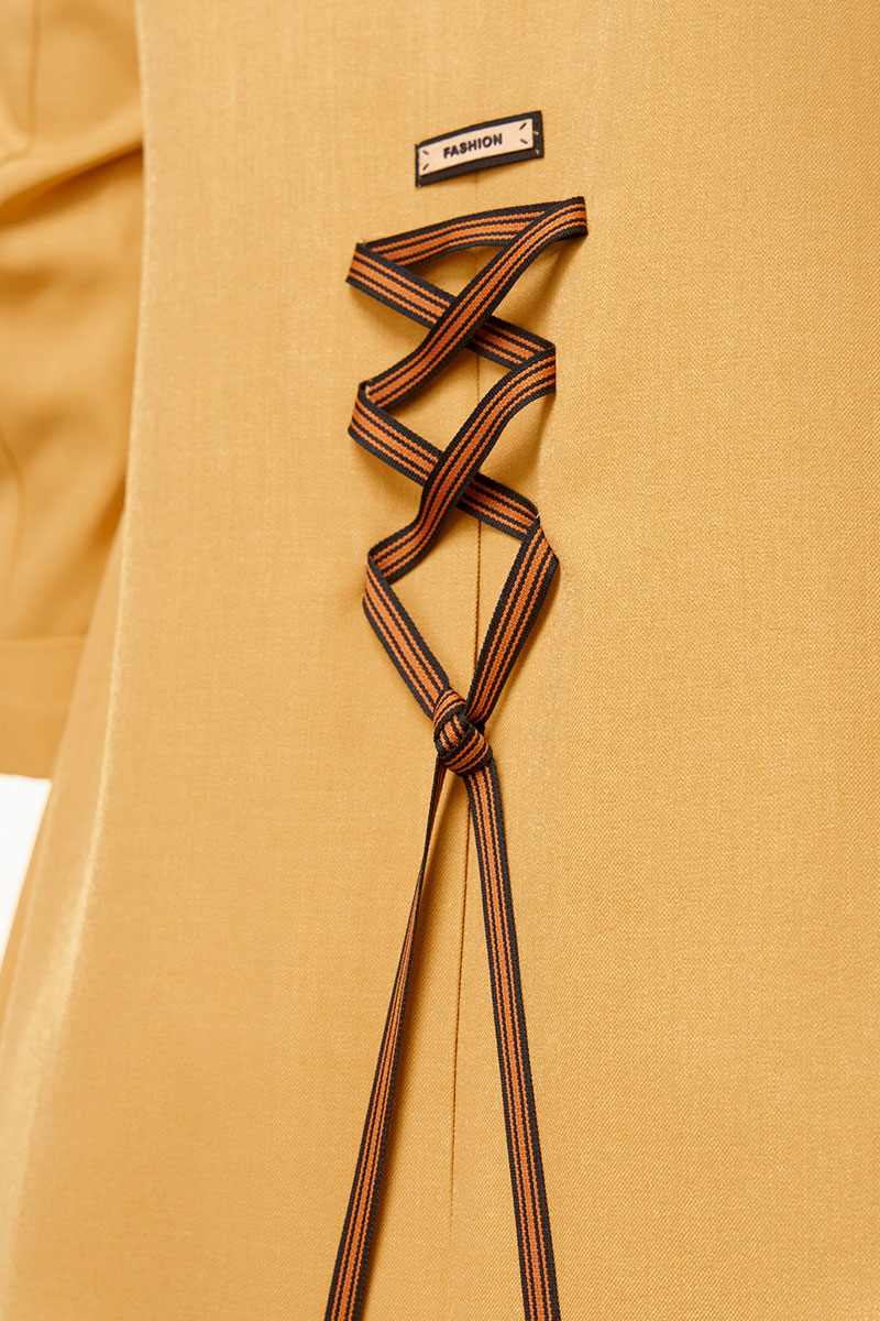 расположена декоративная шнуровка и декоративный элемент. Рукав втачной, с манжетой, длиной 3/4. В боковых швах платья обработаны карманы.