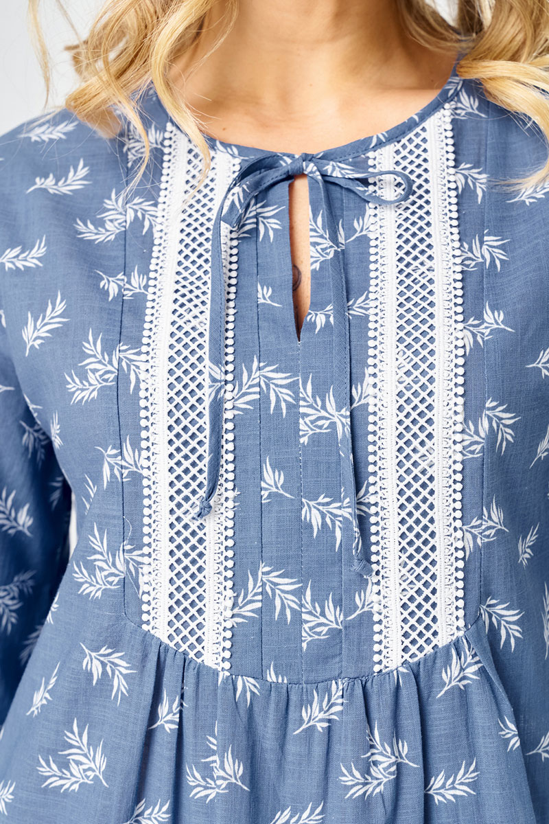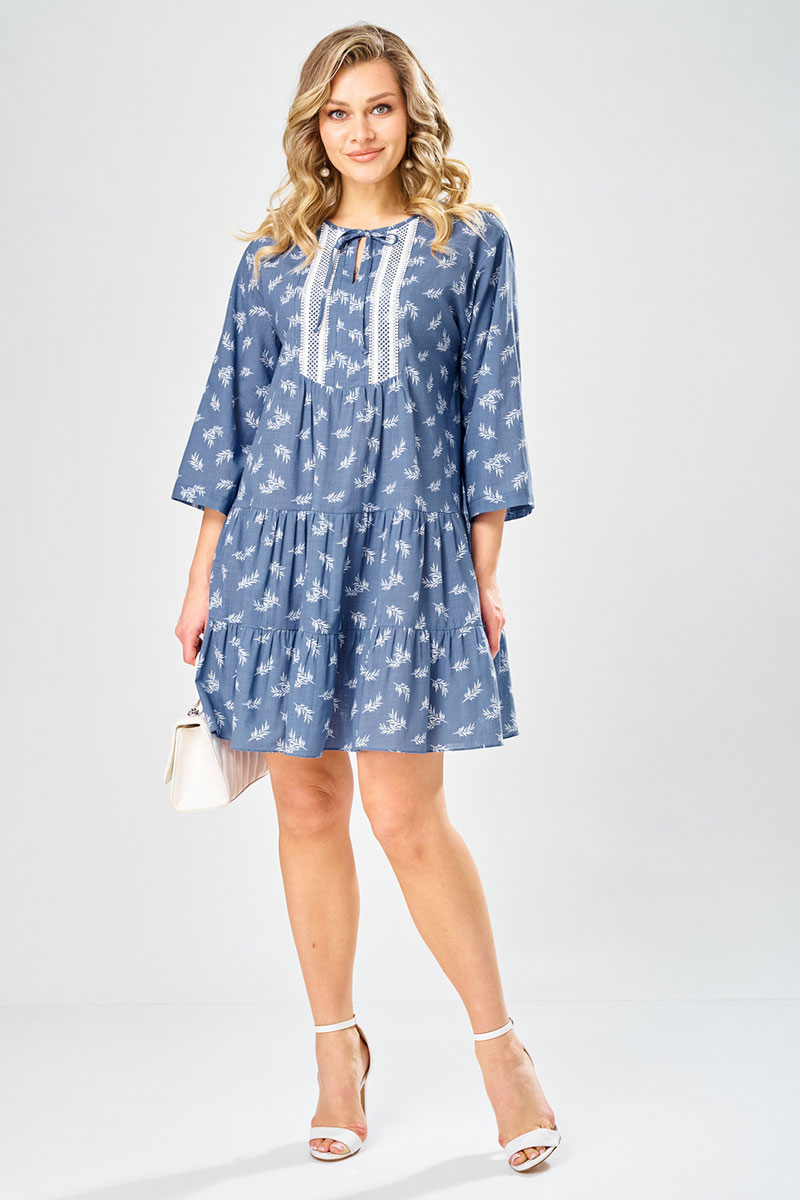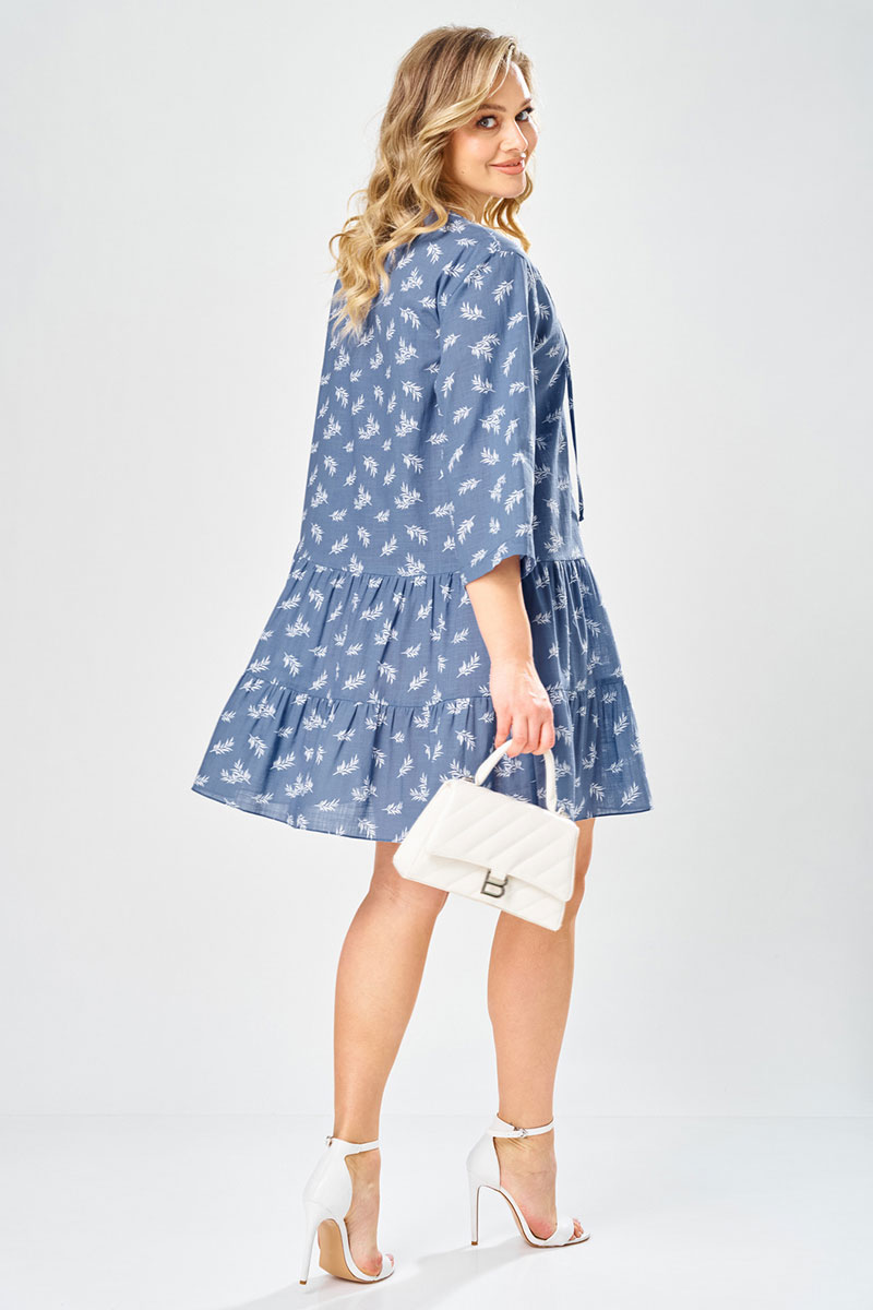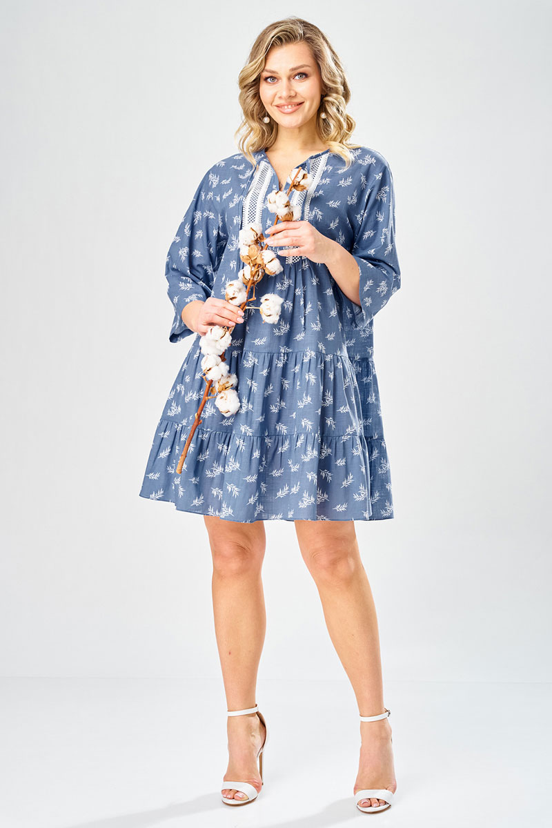 Платье женское свободного силуэта, длиной миди, выполненное из хлопка с растительным принтом. Платье с круглой горловиной, рукав втачной, длиной 3/4. Верхняя часть переда с