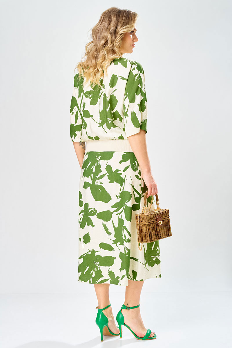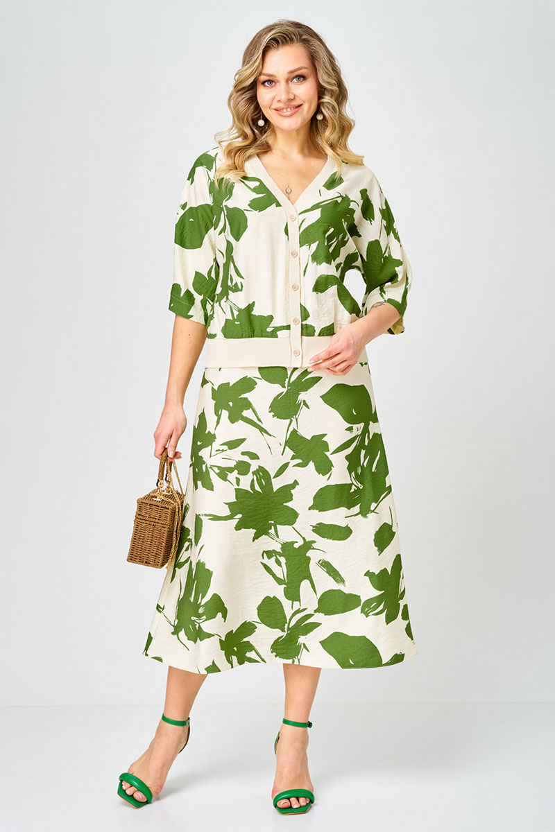 Юбочный комплект 2-х предметный, состоящий из юбки и блузы. Детали переда блузы цельнокроенные с рукавом длиной 3/4. Блуза с центральной застёжкой, выполненной из трикотажного довяза,