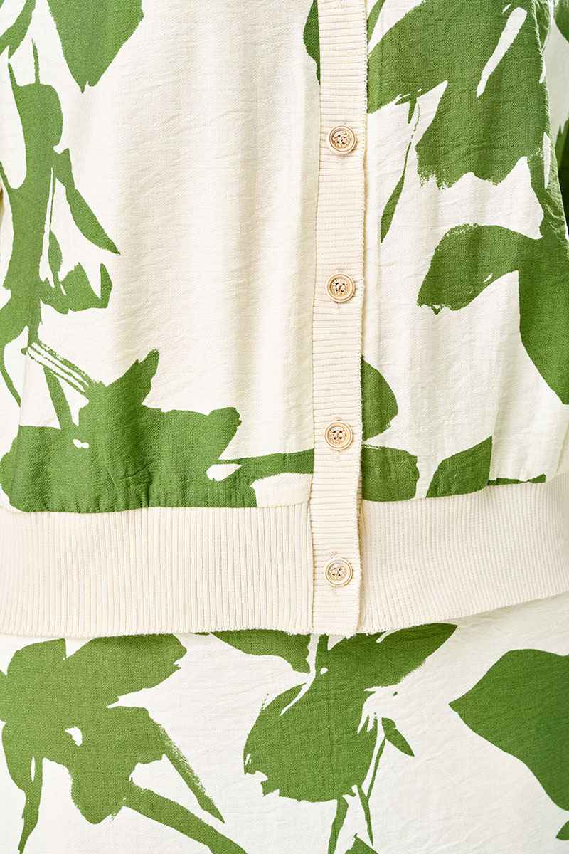 который застёгивается на петли и декоративные пуговицы. Низ также обработан довязом. Длина блузы до середины бедра. Юбка длиной мидакси А-силуэта, с потайной застёжкой в боковом шве.