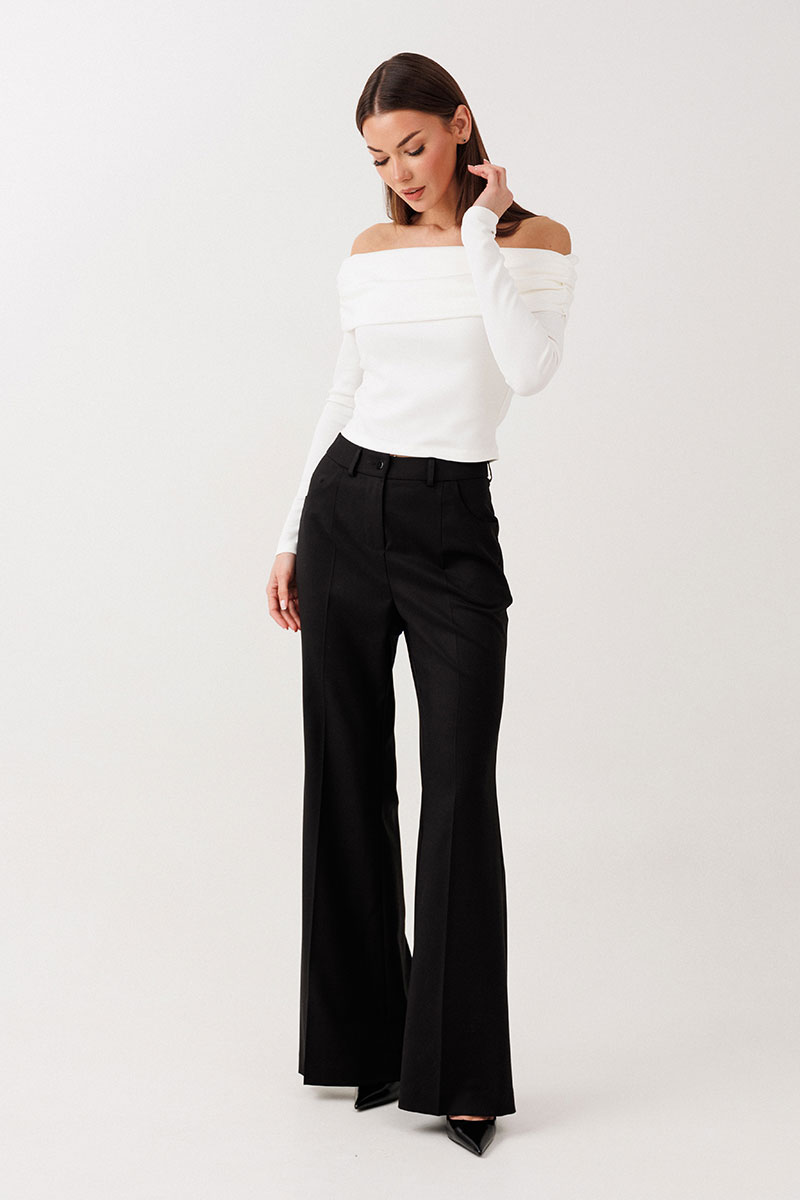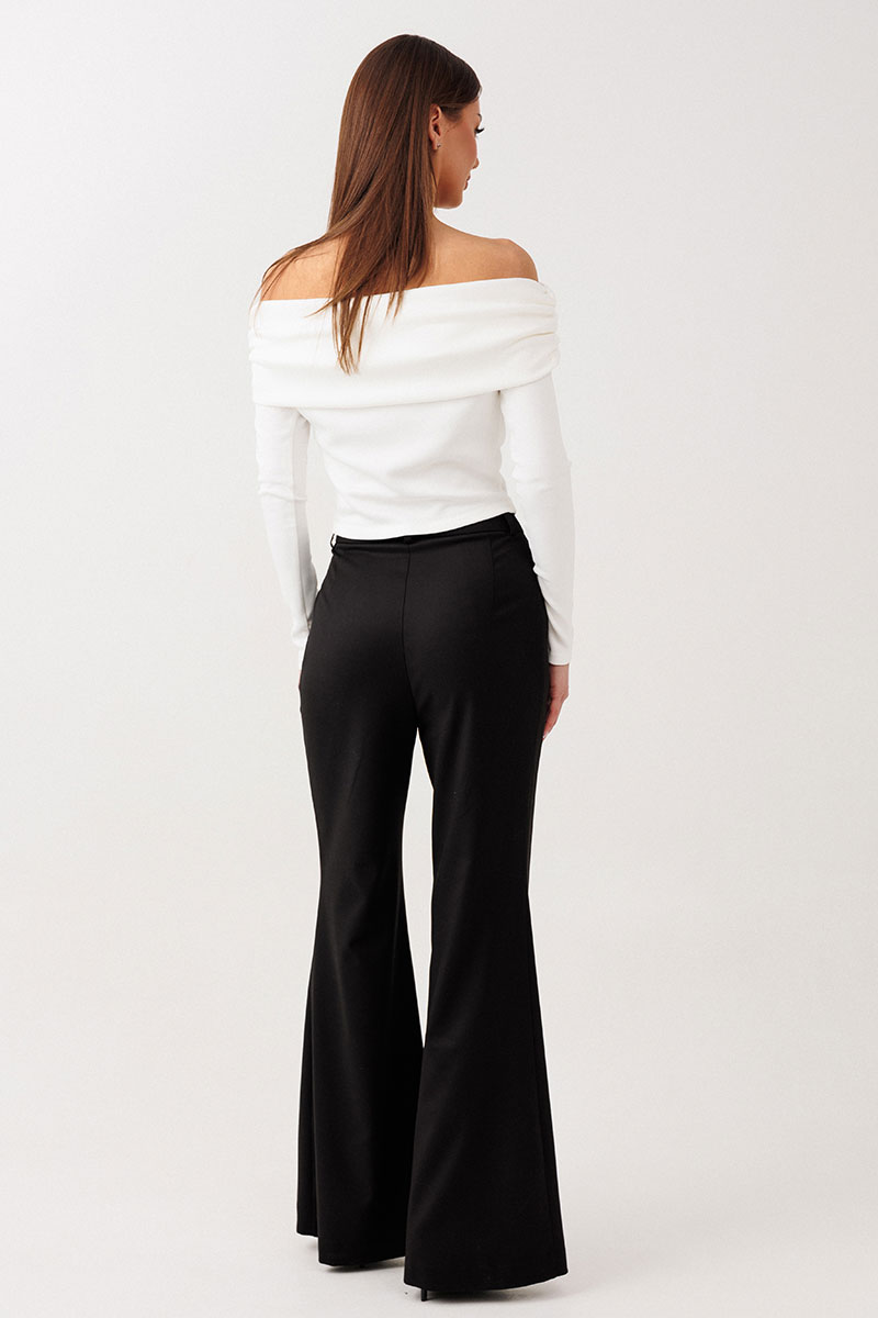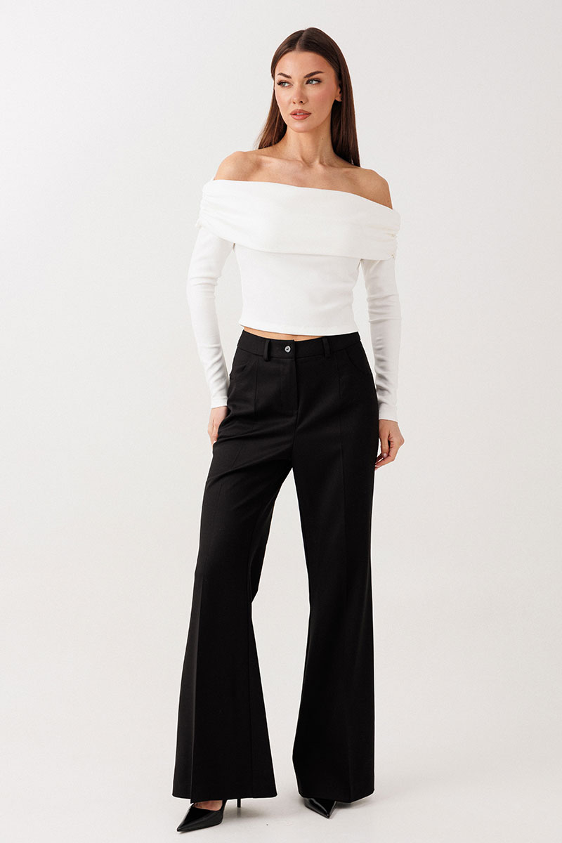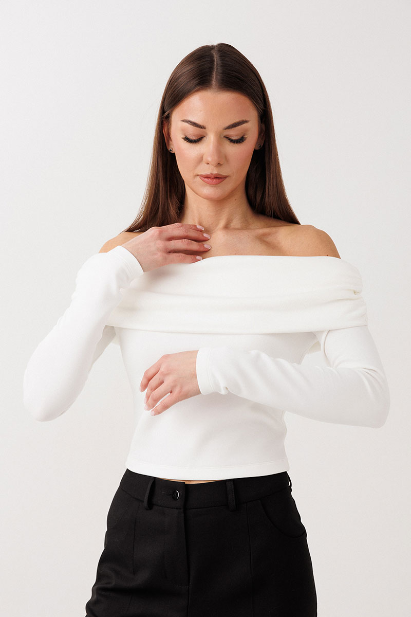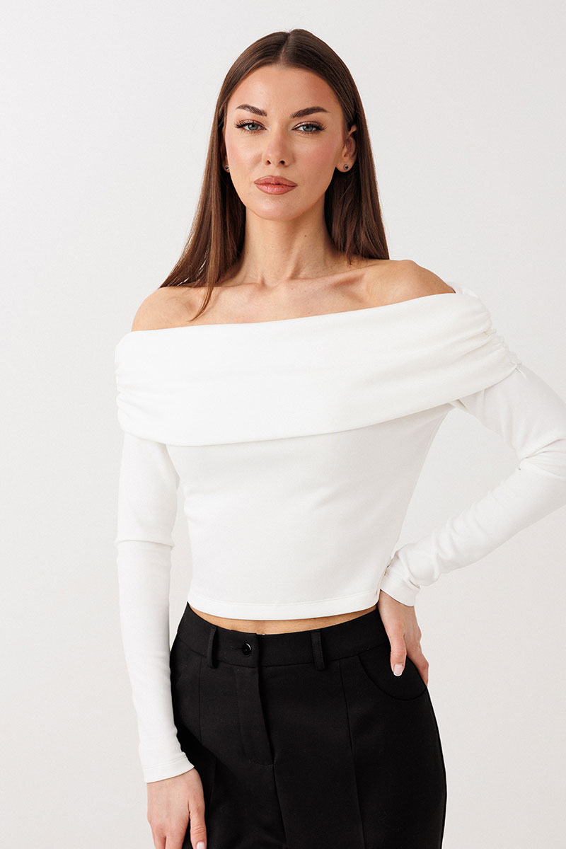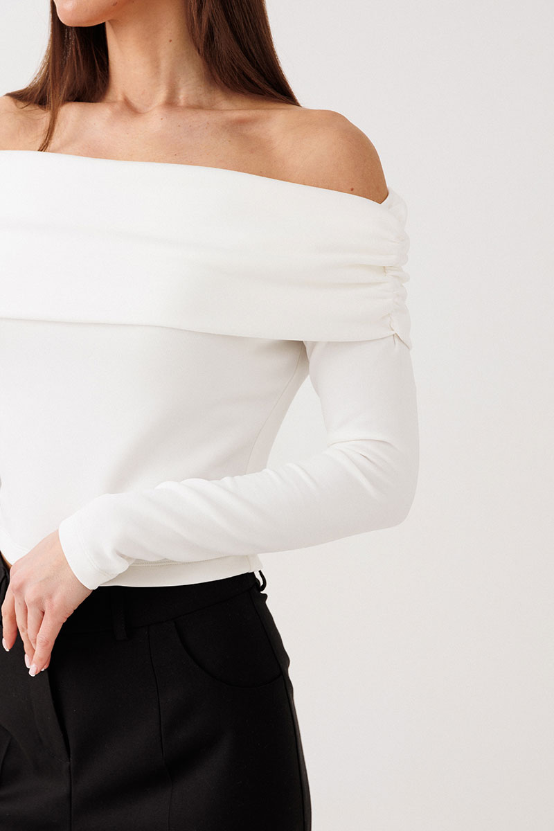 - выполнен из эластичного трикотажа средней плотности, -открытые плечи, -спущенный воротник, на сборке по переду и спинке изделия
