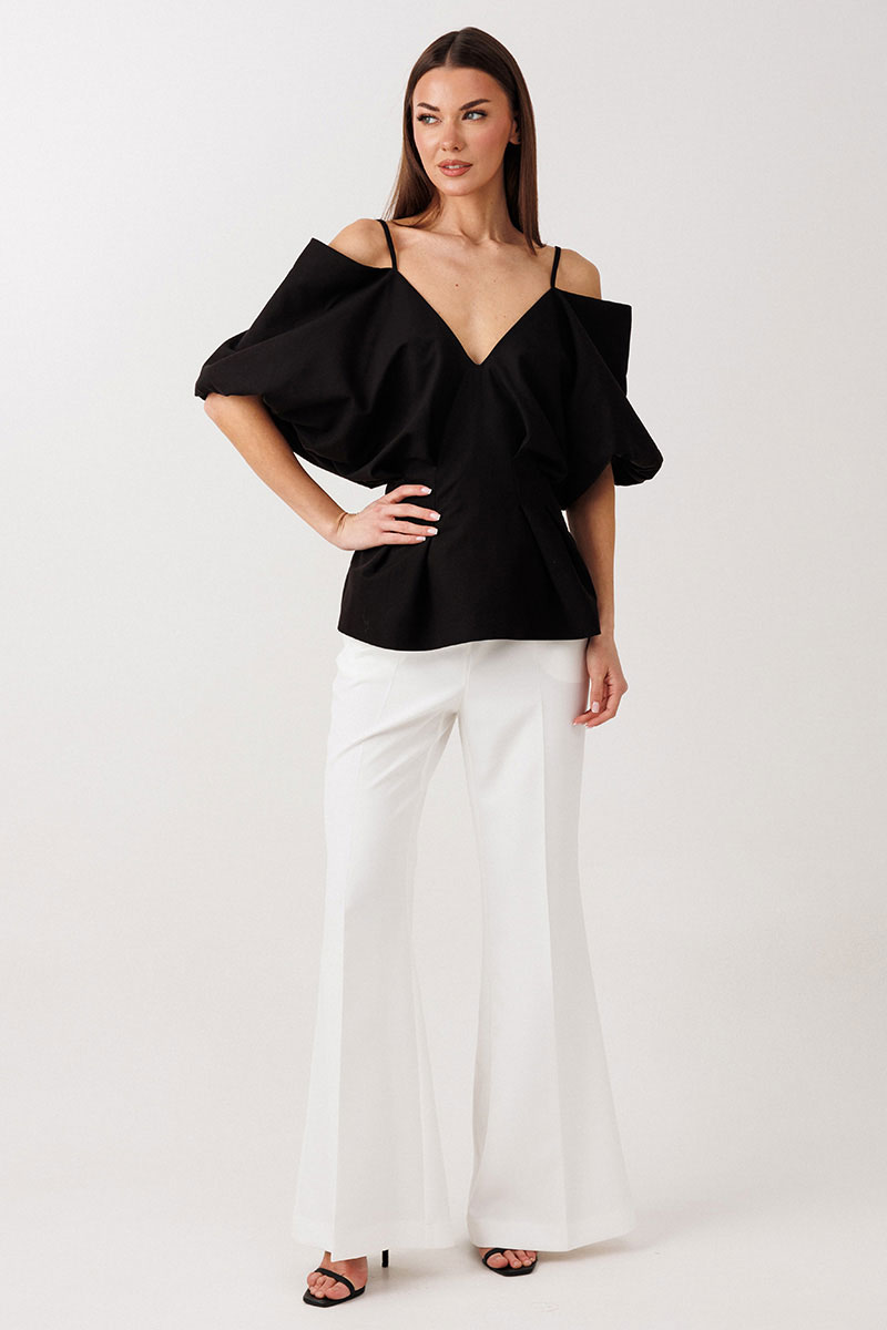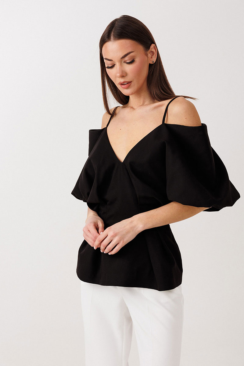 - открытые плечи на бретелях со спущенными рукавами "фонариками".