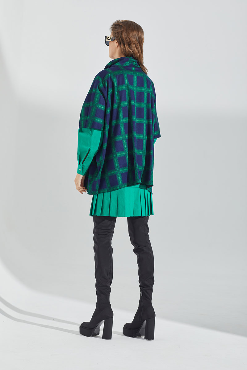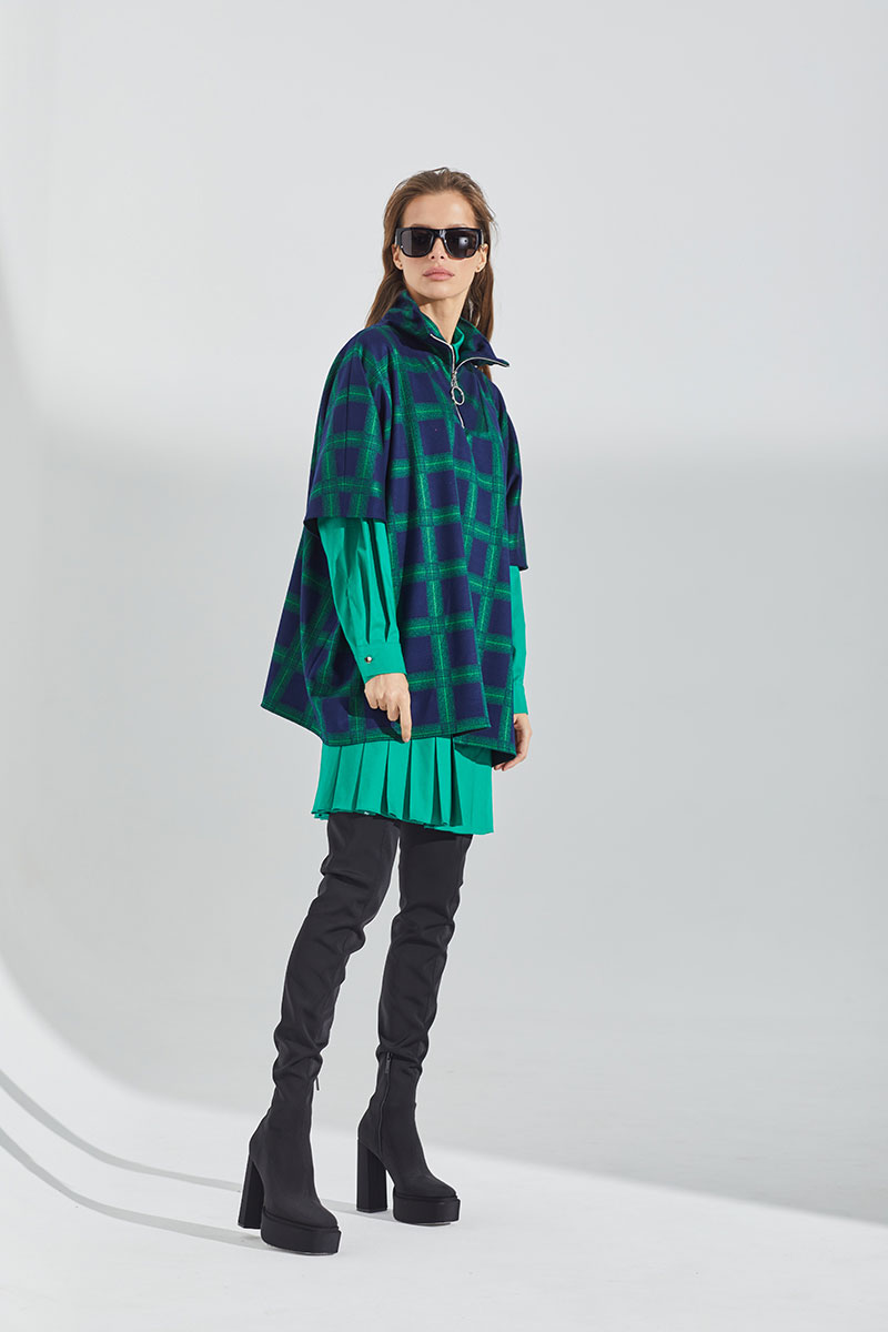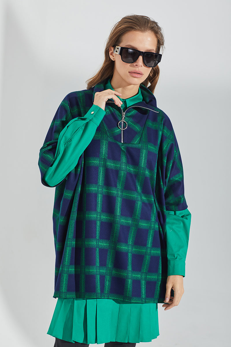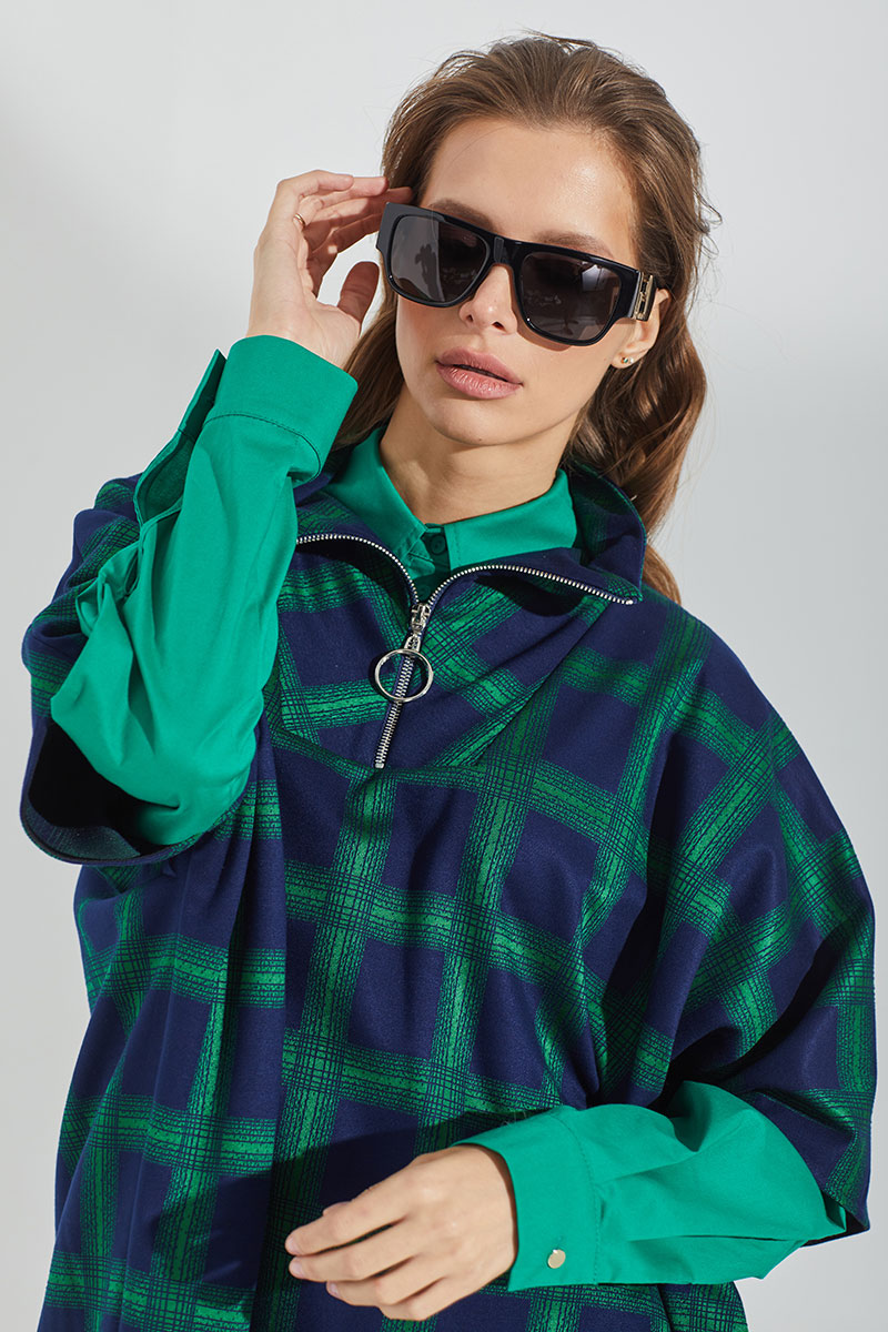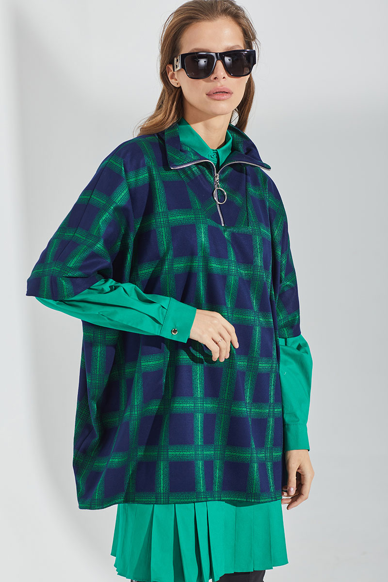 Джемпер трикотажный объемной формы с расширенным плечевым поясом. Воротник стойка с застежкой на молнию. Длина молнии - 25 см.