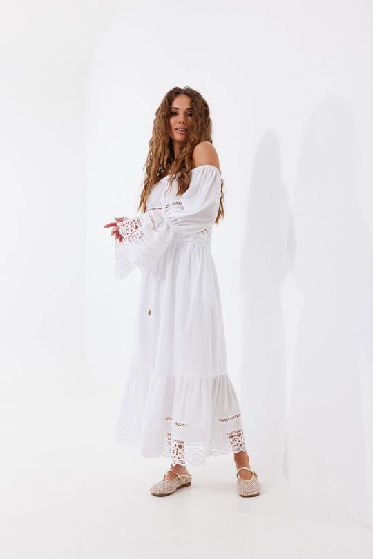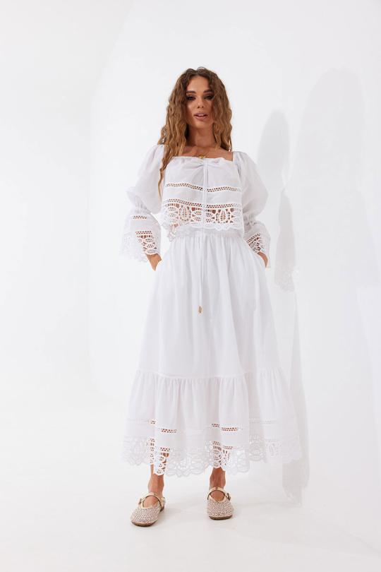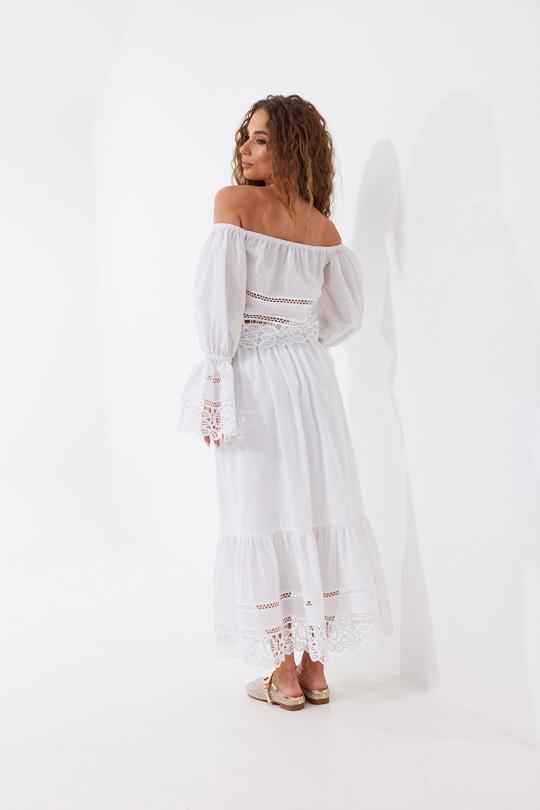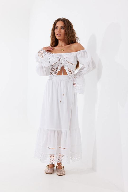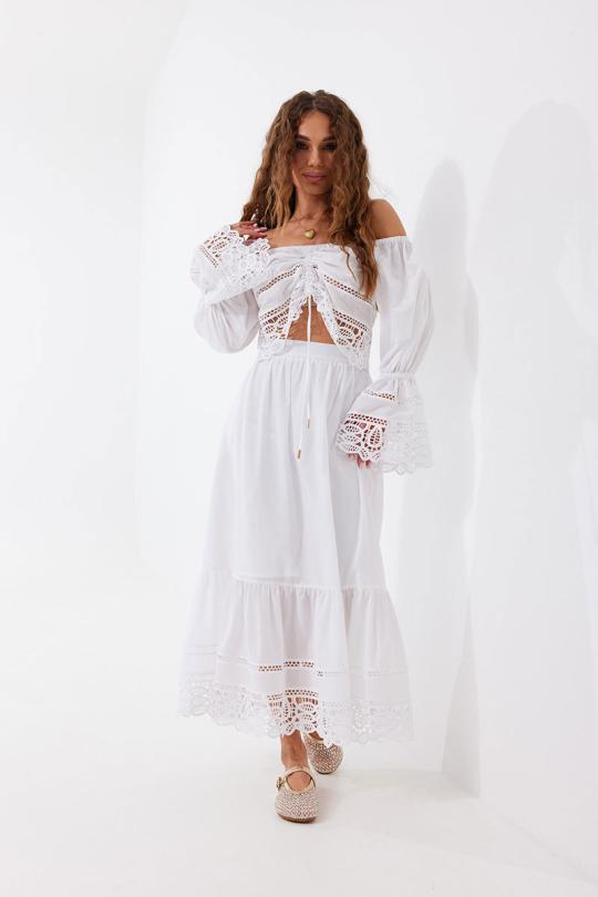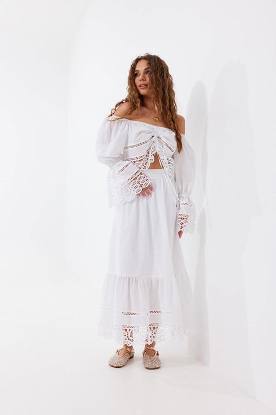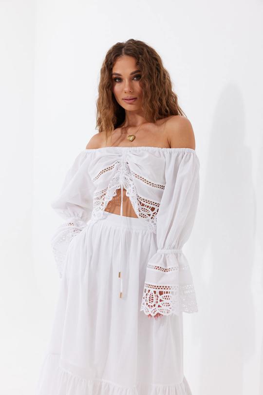 Блузка с открытыми плечами короткая. Верх собран на резинку. Рукав объемной формы, низ собран на резинку. По переду кулиса с завязкой.