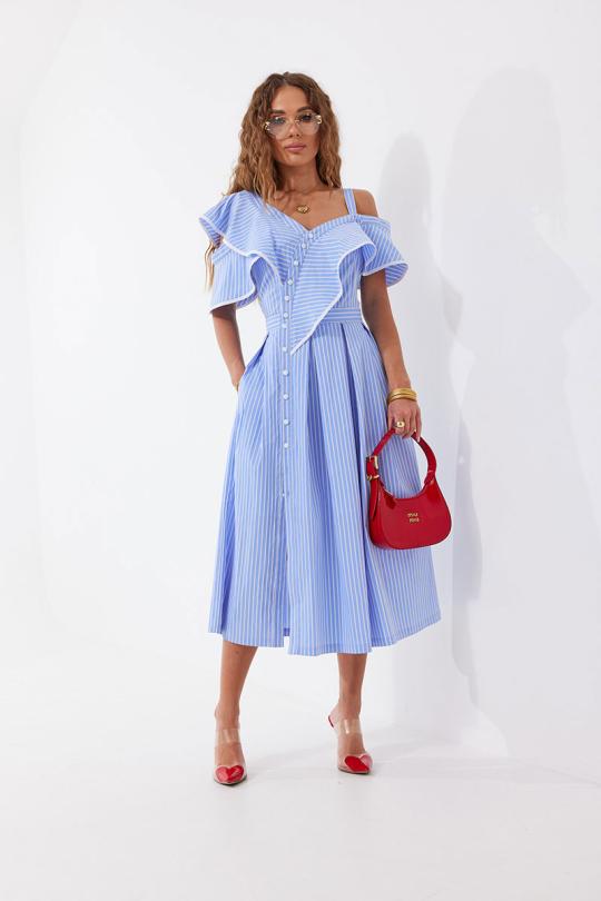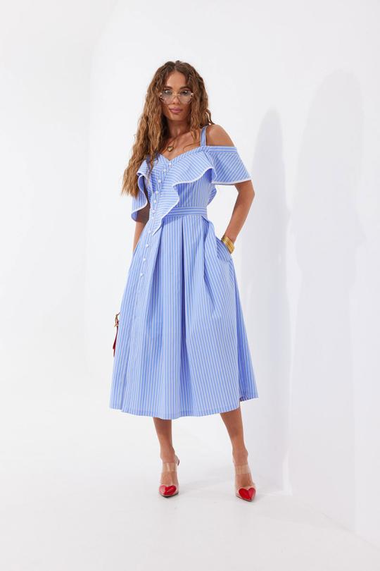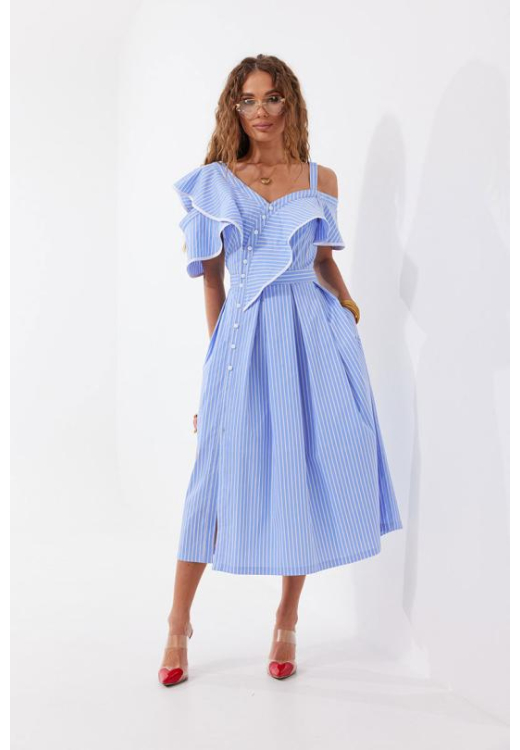 Платье летнее. Длина миди. Полуприлегающий силуэт. Вырез горловины V-образный. По переду прорезные карманы. Застежка на петли и пуговицы. Юбка со складками. Верх с воланами и съемной бретелью на левом плече. Платье на хлопковой подкладке.