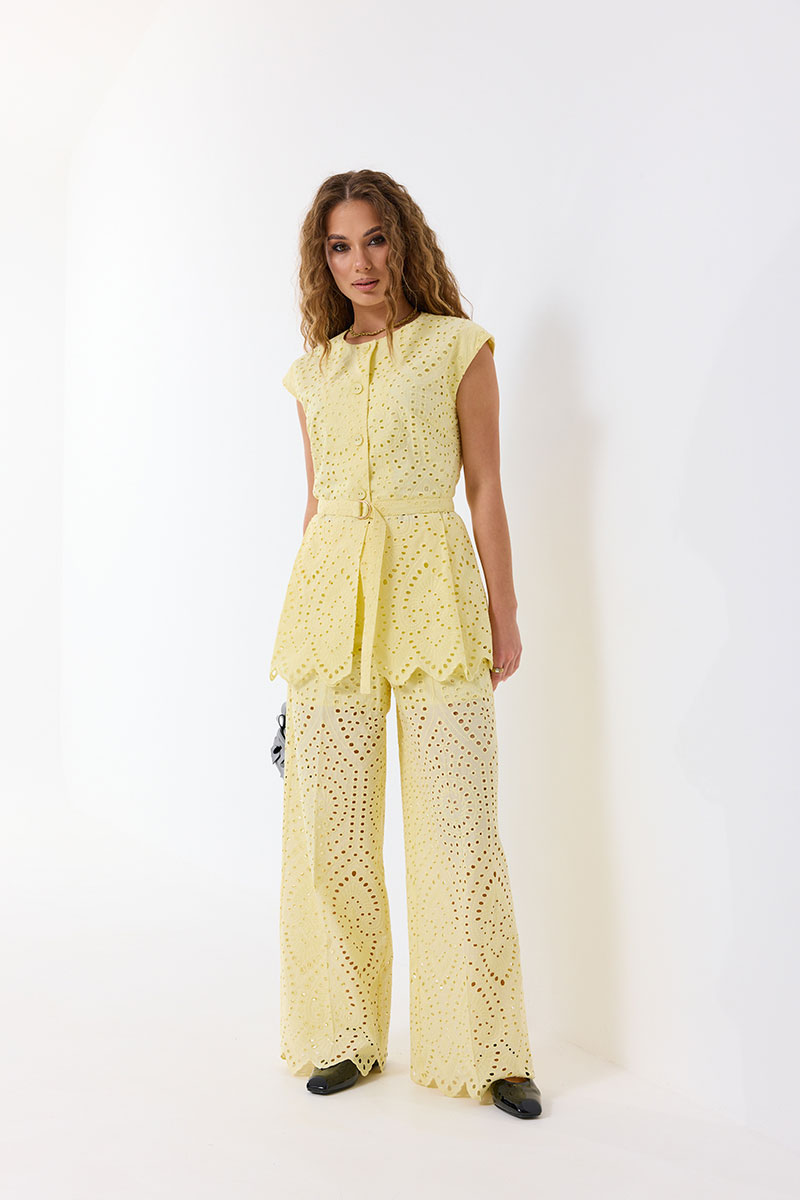 Брюки прямые. Верх на поясе со шлевками. По спинке пояс собран на резинку. Застежка