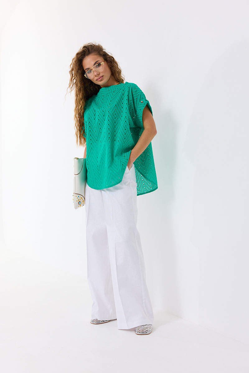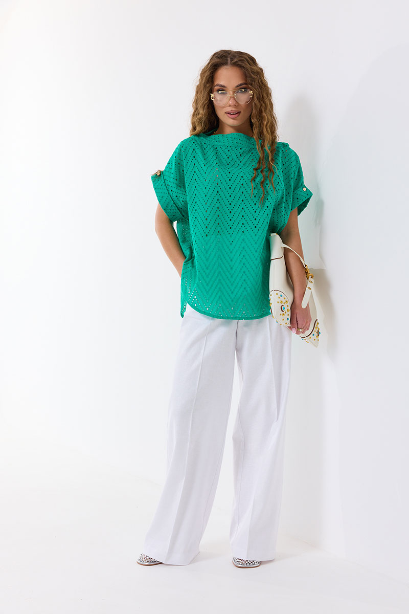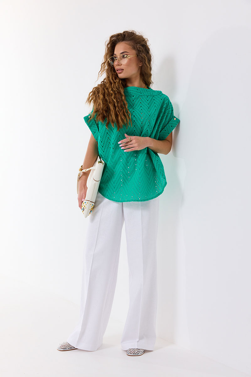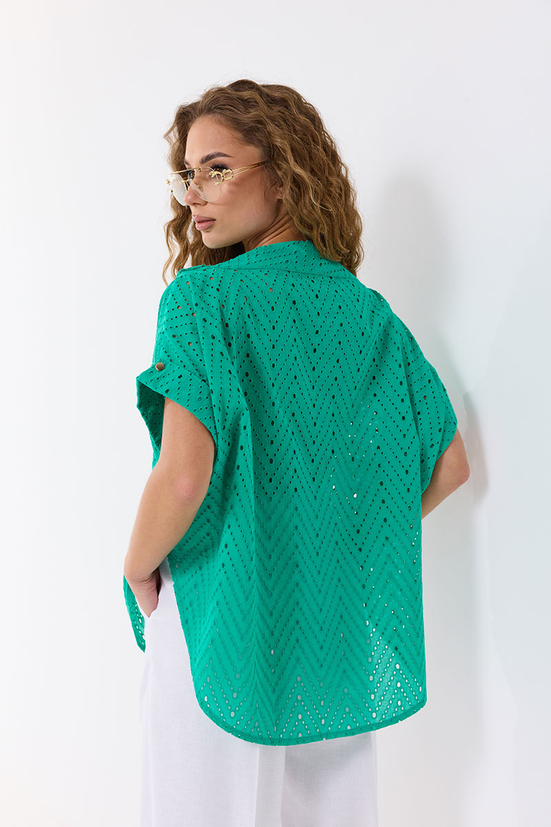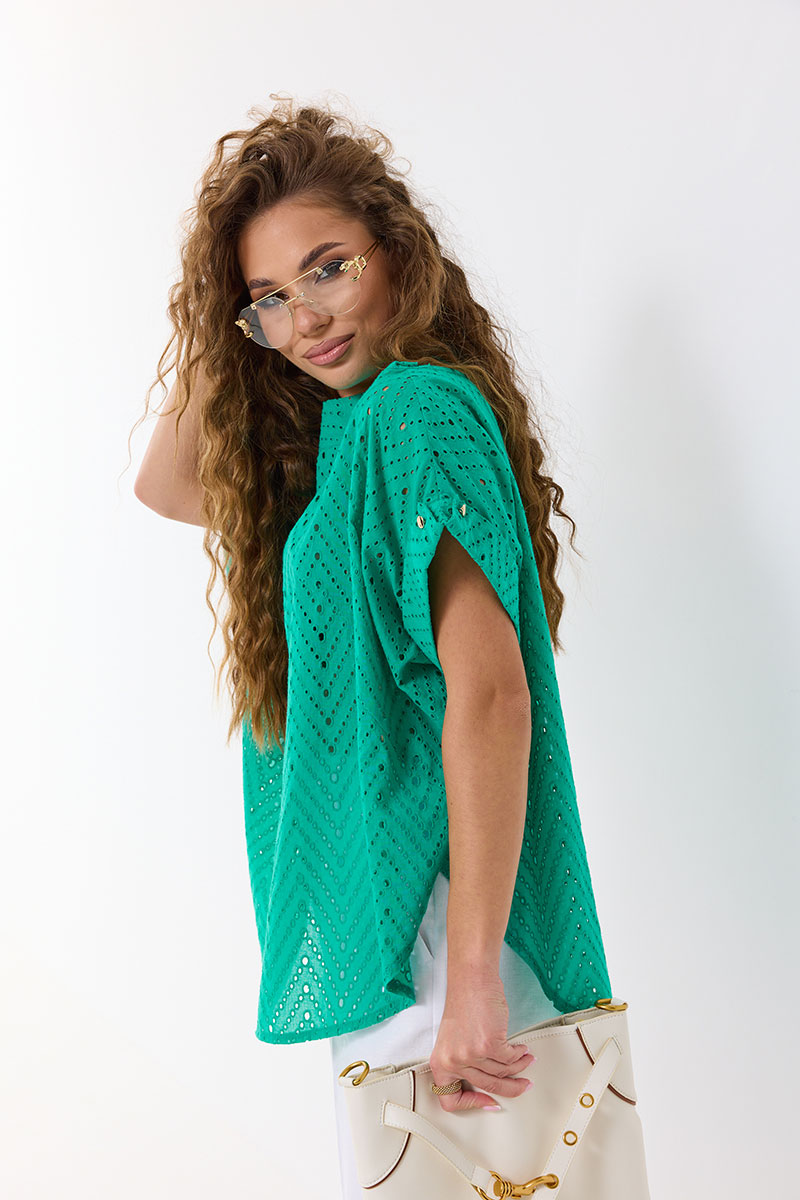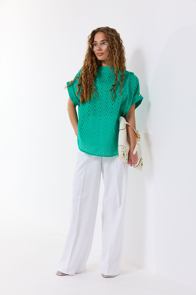 Блузка объемной формы из хлопковой ткани «шитье». Воротник стойка. Расширенная линия