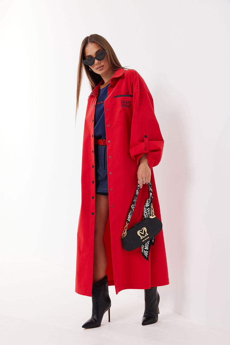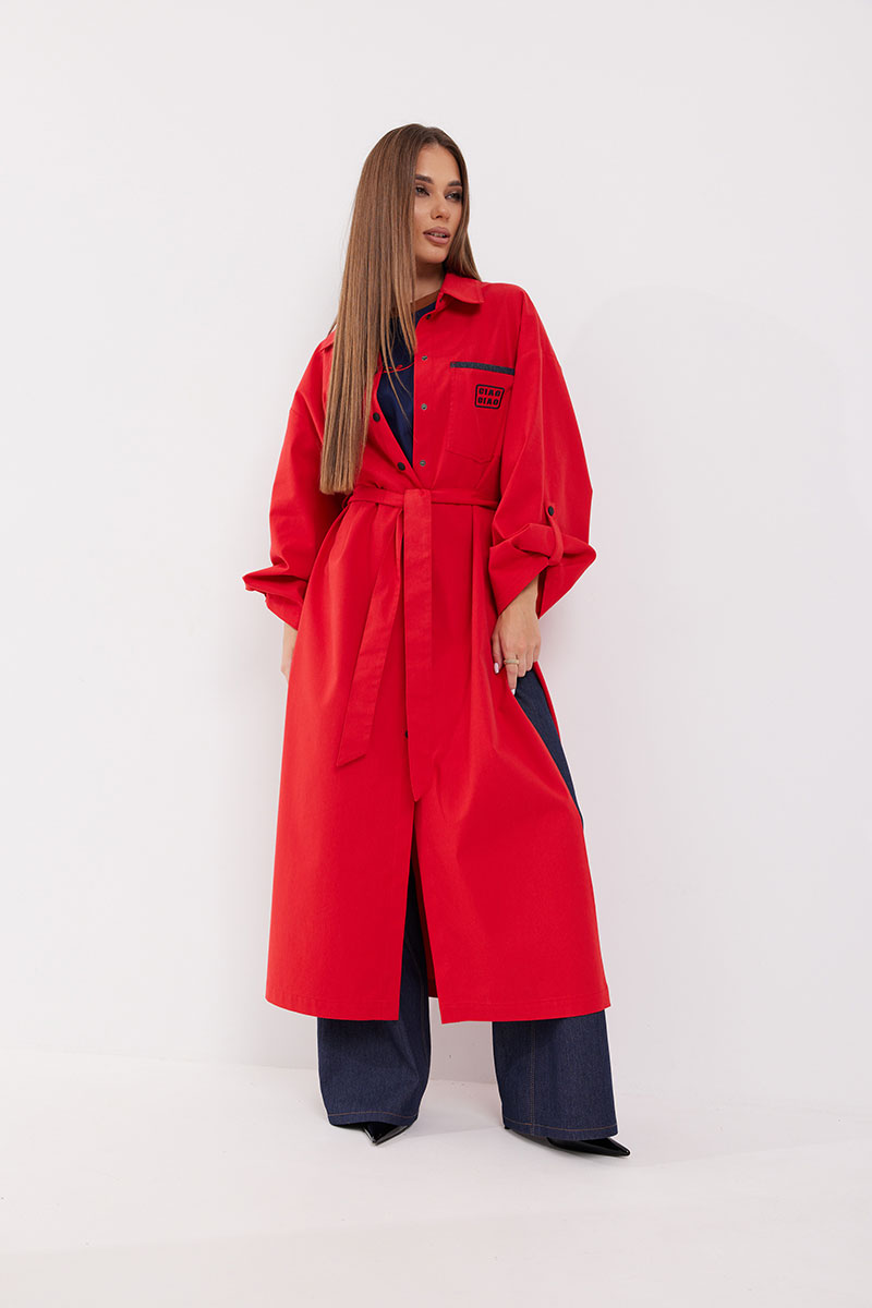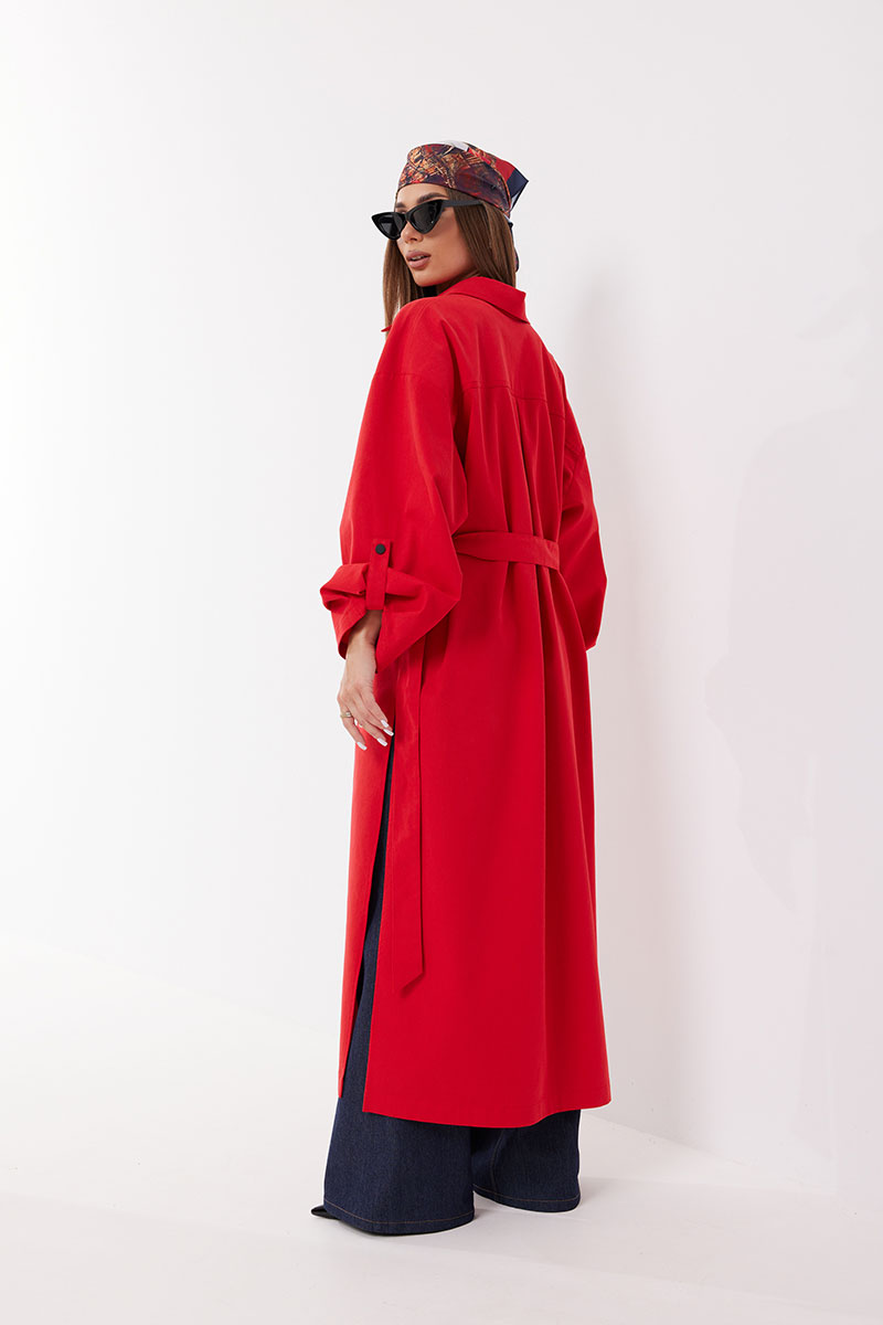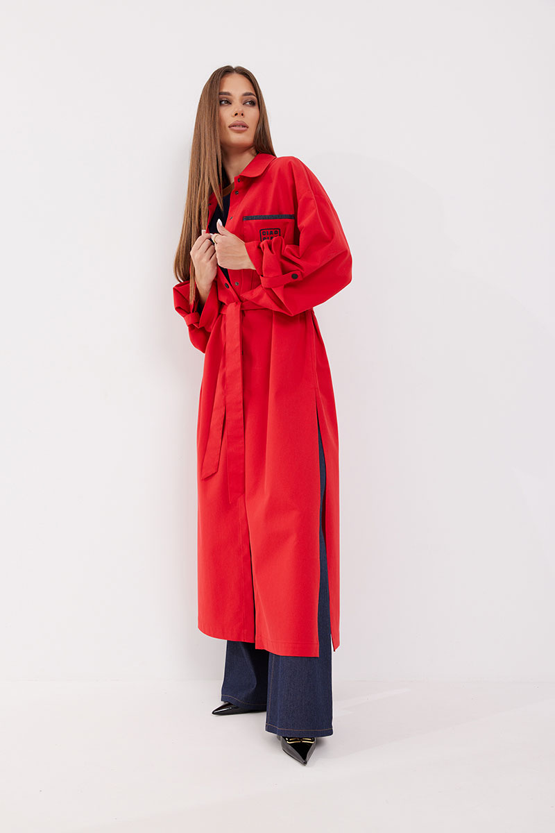 Плащ женский, свободного силуэта без подкладки. Воротник отложного типа. Рукав широкий спущенный с патой. В боковых швах карманы и высокие разрезы. Застежка на кнопки. По левой части переда накладной карман с вышивкой.