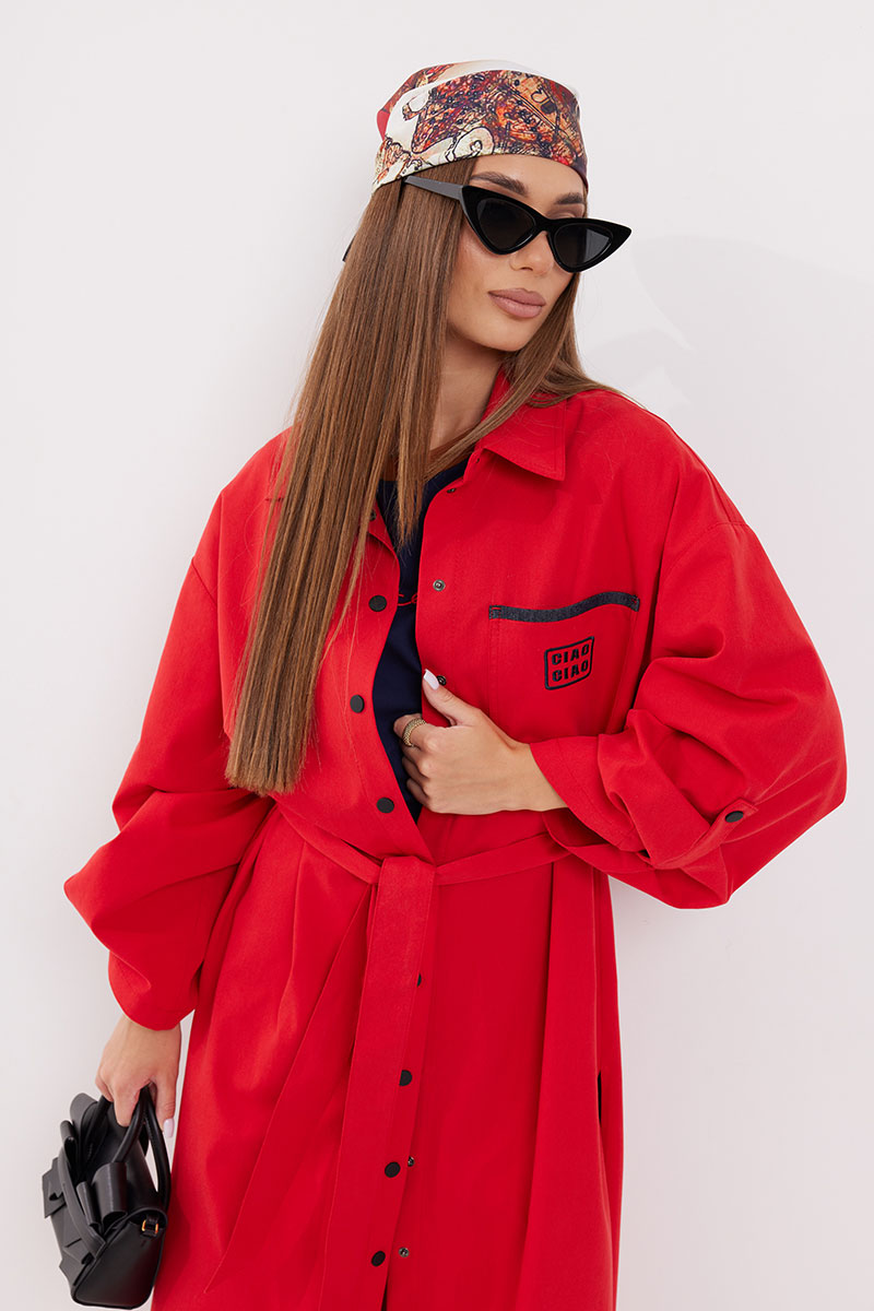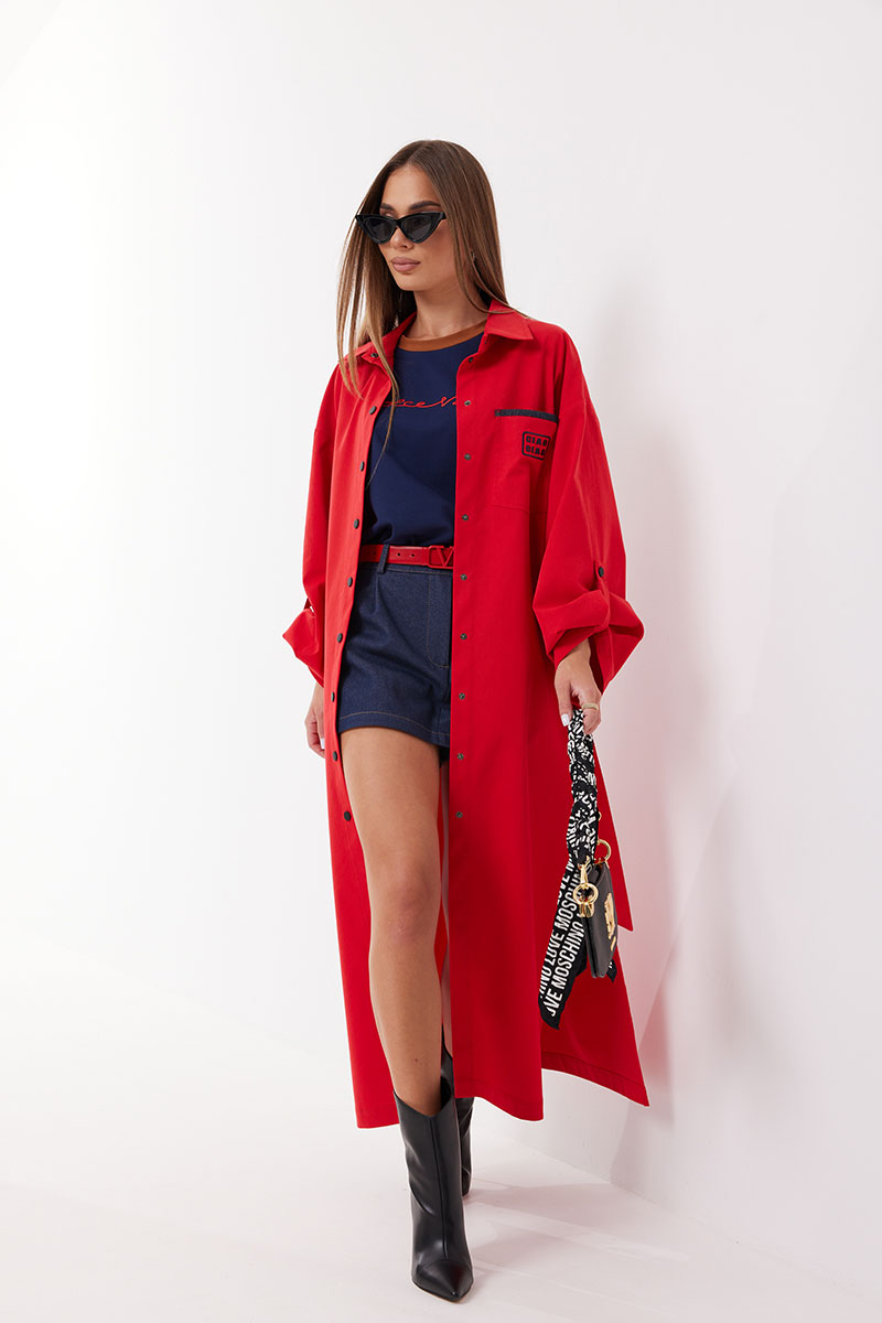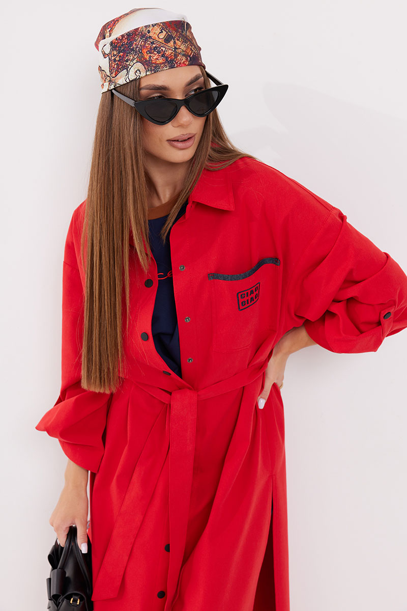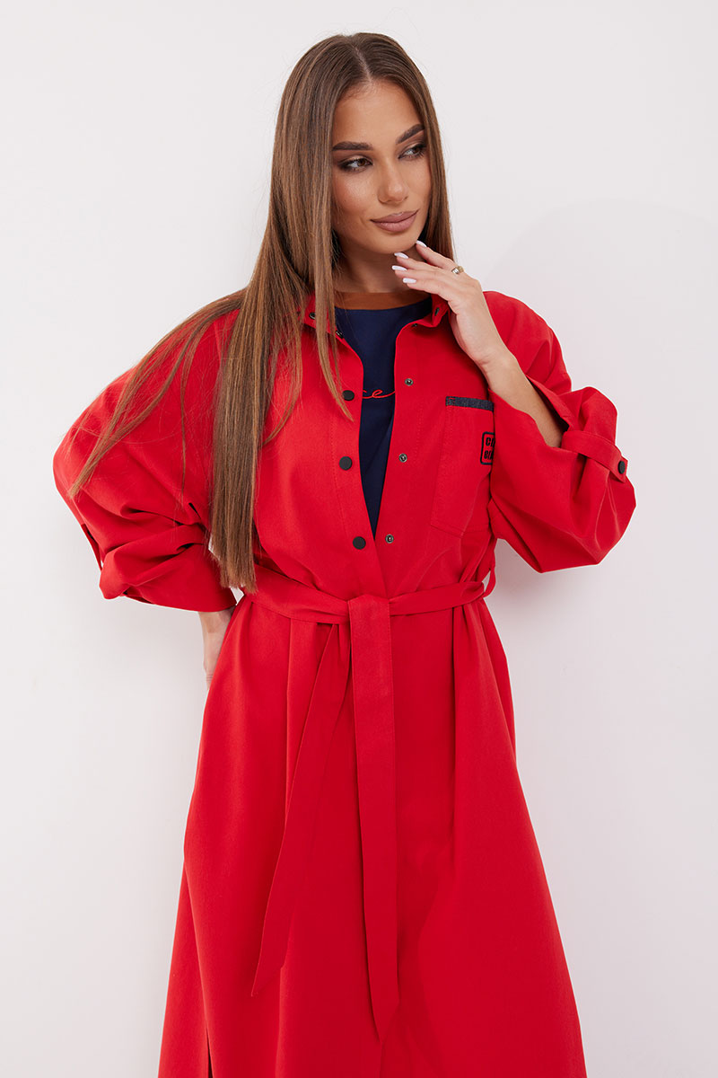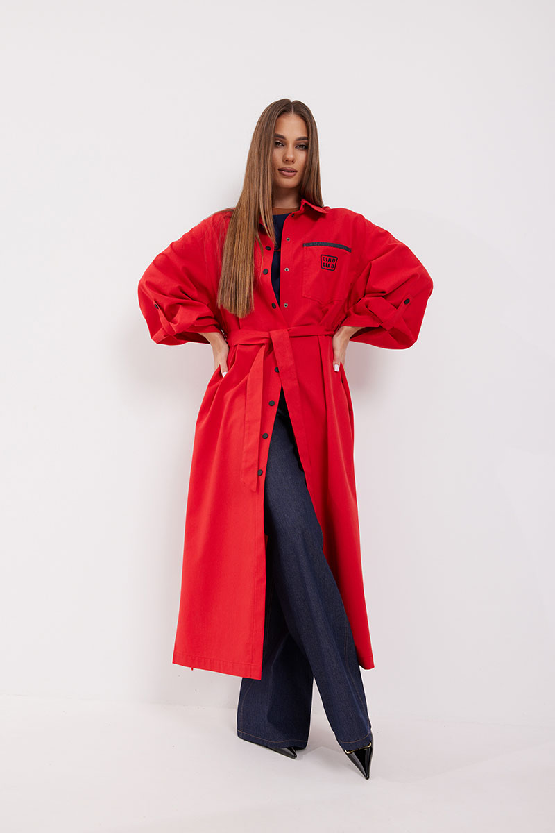 Плащ женский, свободного силуэта без подкладки. Воротник отложного типа. Рукав широкий спущенный с патой. В боковых швах карманы и высокие разрезы. Застежка на кнопки. По левой части переда накладной карман с вышивкой.