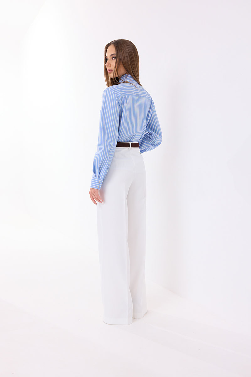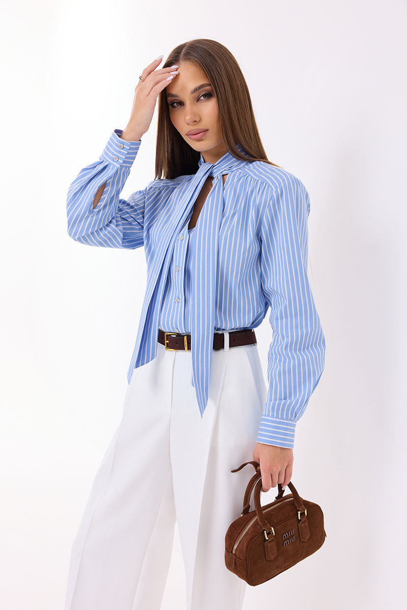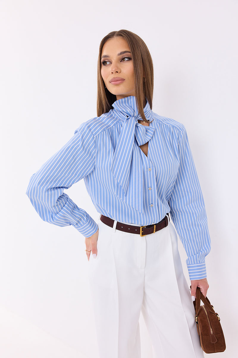 Блузка женская прямого силуэта. Рукав длинный с манжетой. Застежка на петли и пуговицы. По переду и спинке кокетки. Воротник стойка переходящая в завязку, образуя бант или узел.