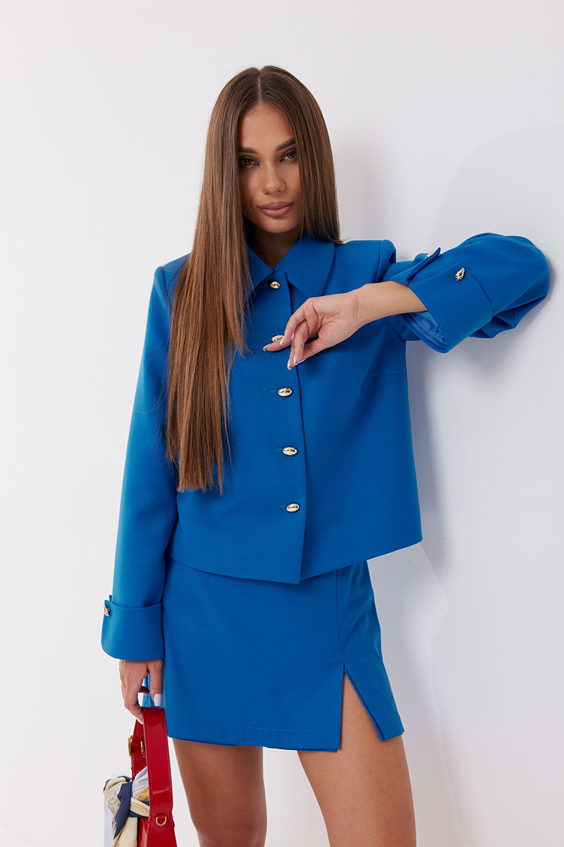 Шорты-юбка в длине мини имеет силуэт мягкую трапецию. Шорты с высокой посадкой. Разрез по ноге добавляет динамики и свободы движения. Застежка в боковом шве на потайную молнию.