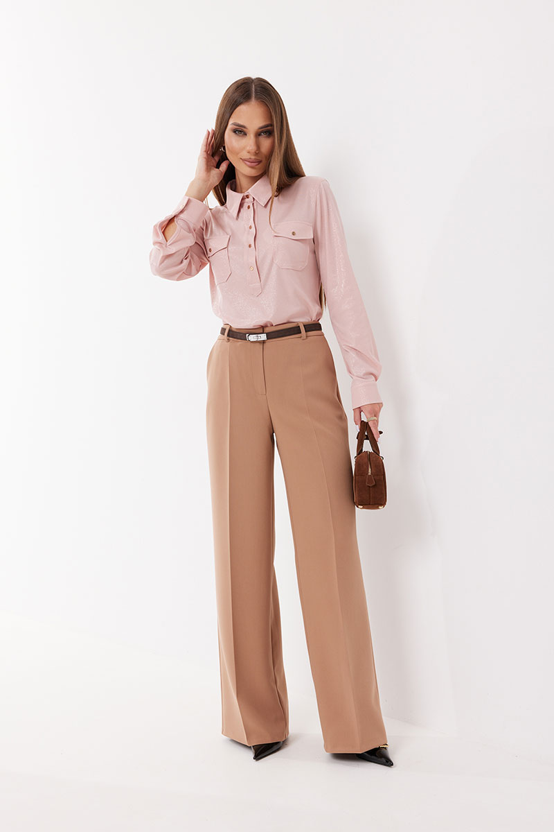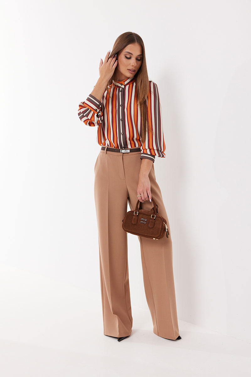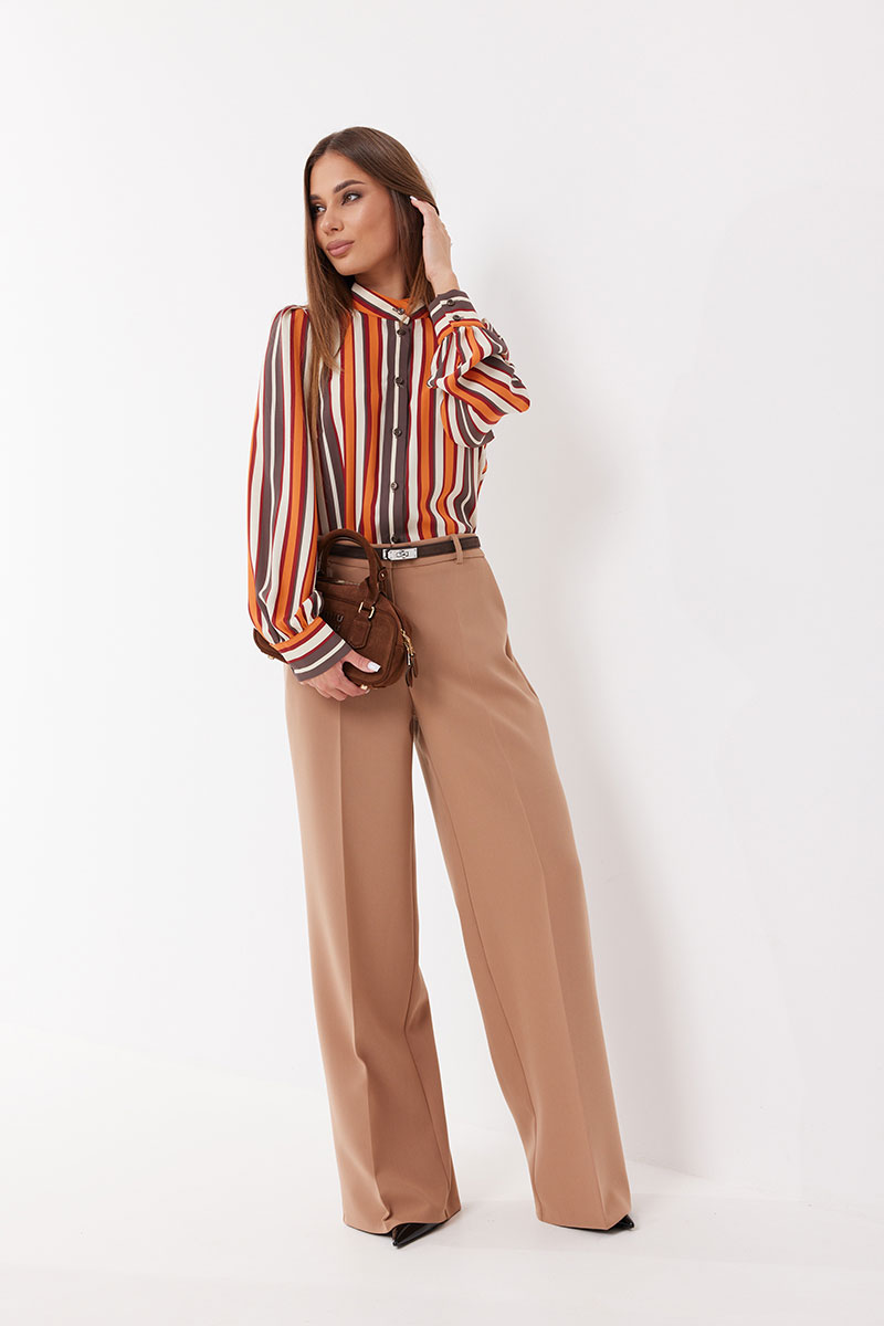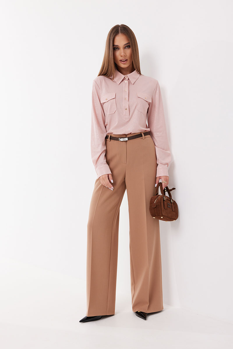 Брюки прямые из костюмной ткани. Верх на поясе со шлевками. Ширинка на молнии и удлиненный пояс со скрытой застежкой на пуговицу и крючок. Диагональные боковые карманы.