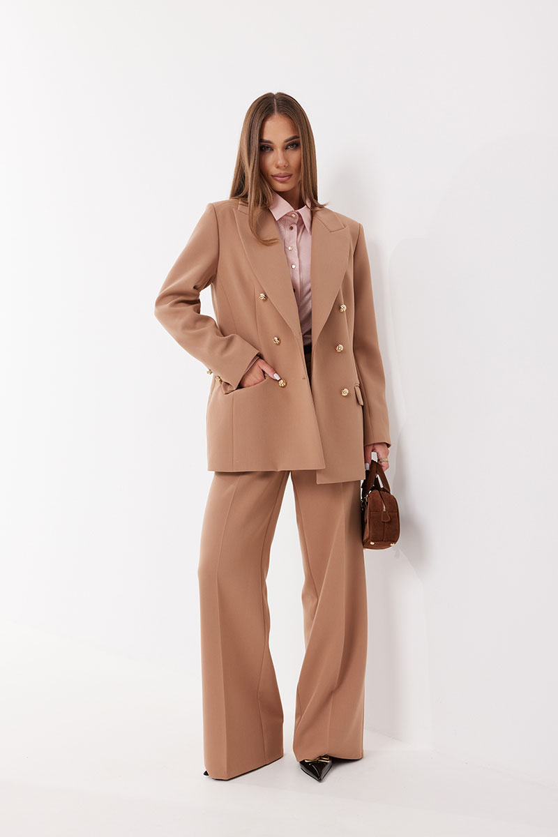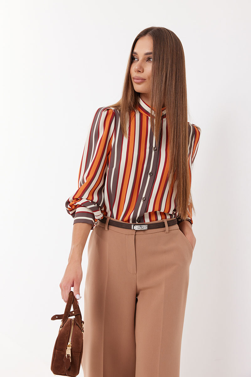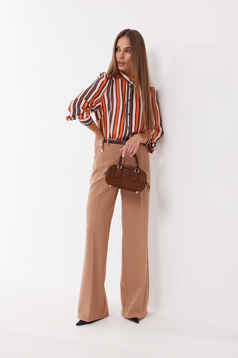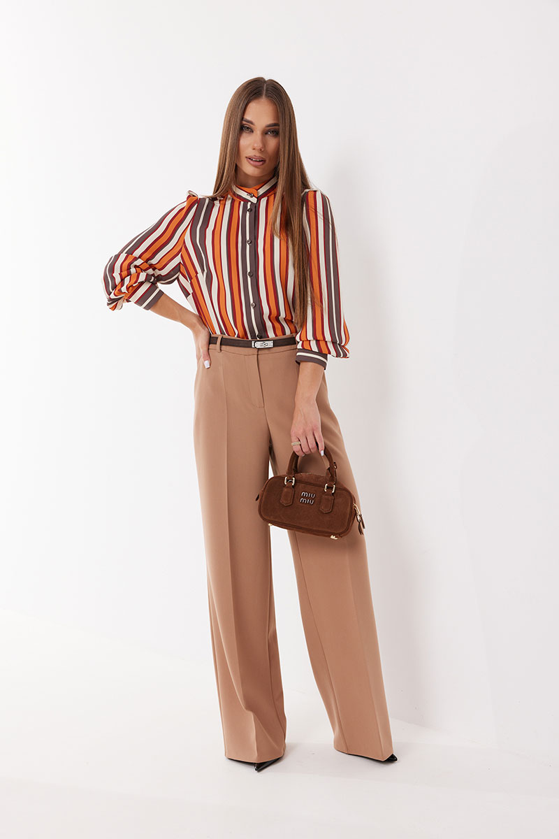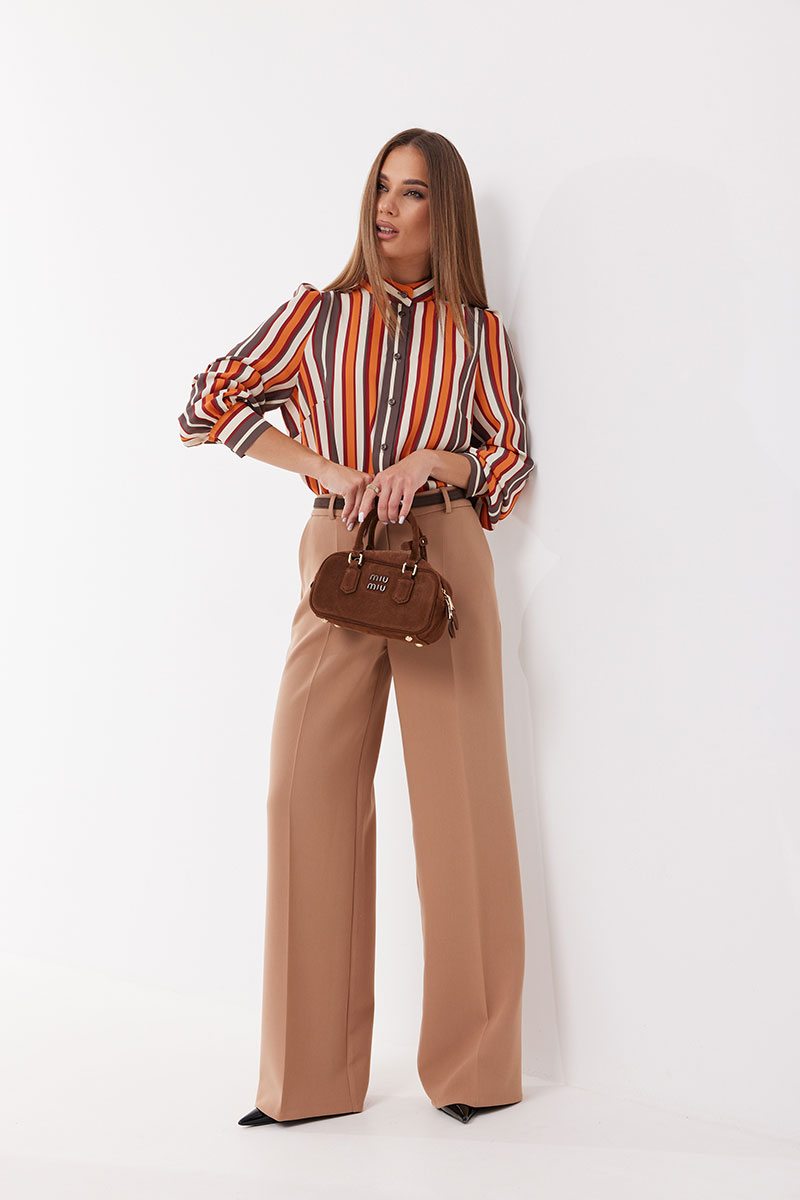 Брюки прямые из костюмной ткани. Верх на поясе со шлевками. Ширинка на молнии и удлиненный пояс со скрытой застежкой на пуговицу и крючок. Диагональные боковые карманы.