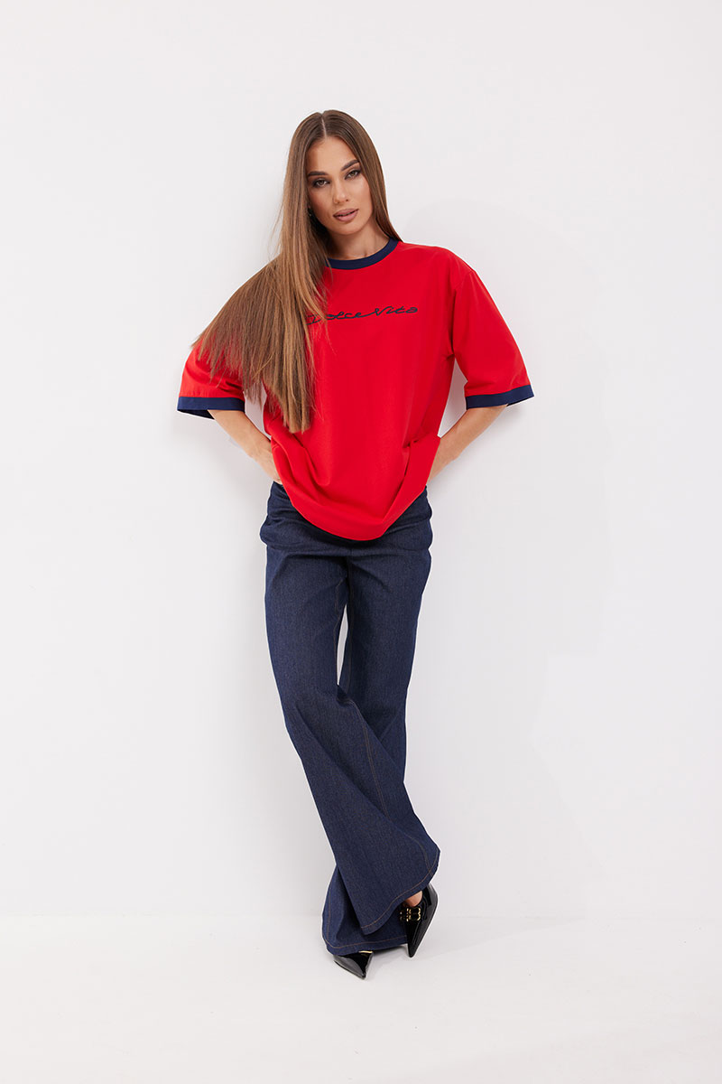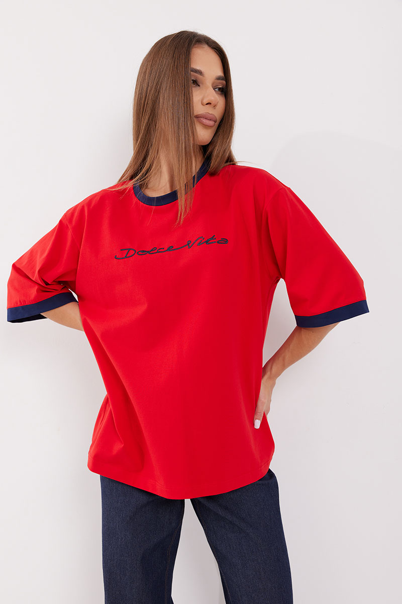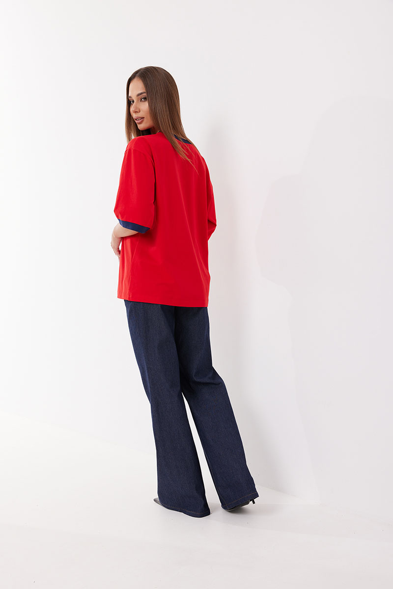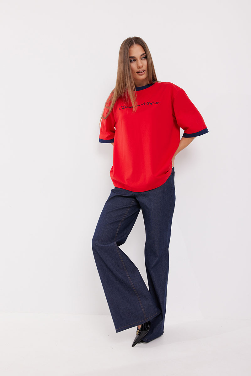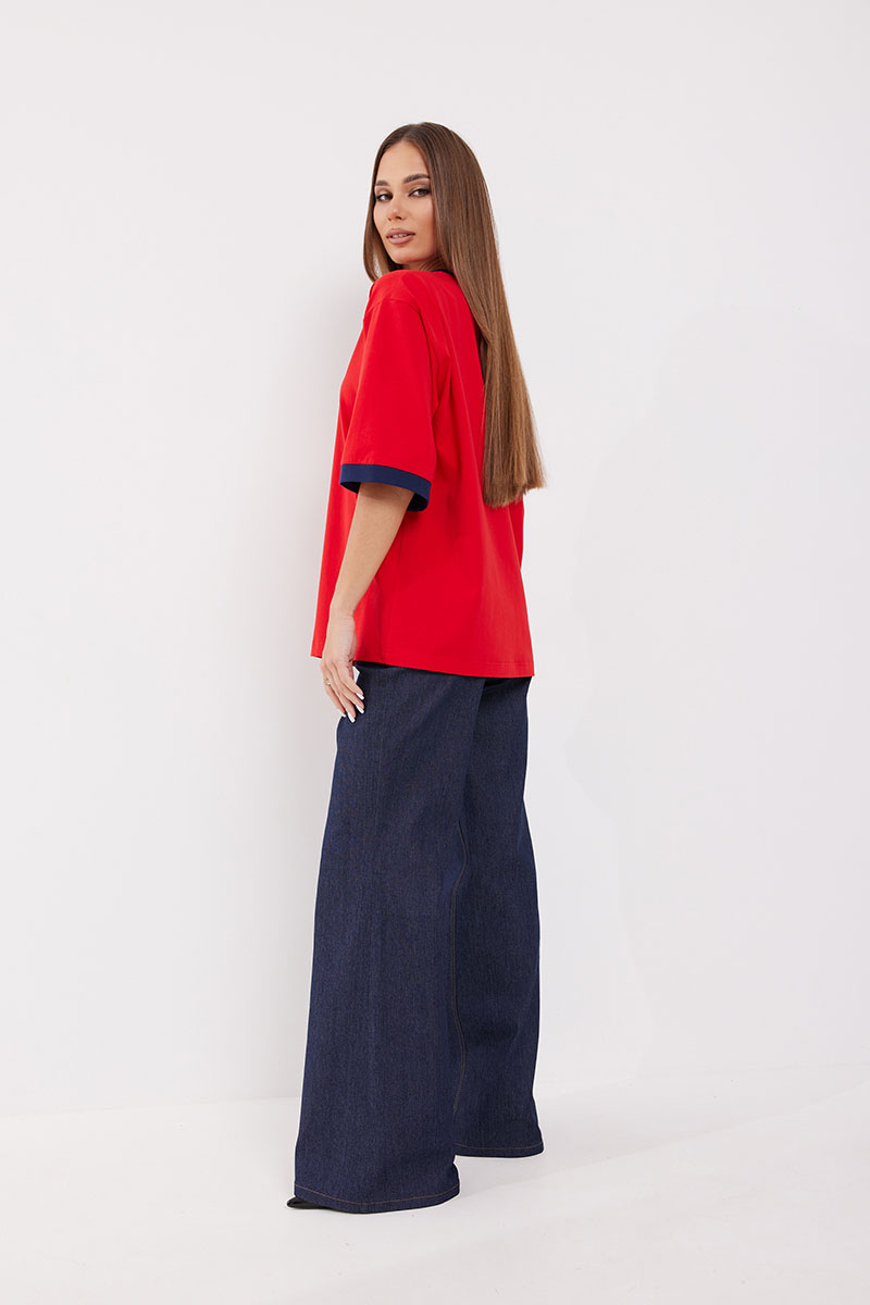 Джемпер прямого силуэта из трикотажного полотна. Горловина круглой формы. Расширенная линия плеча. Рукав прямой, по низу отделка. По переду вышивка.